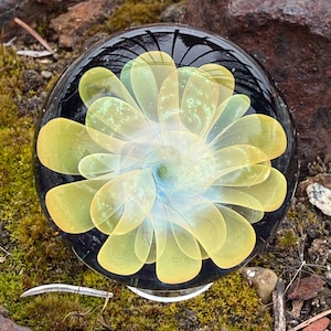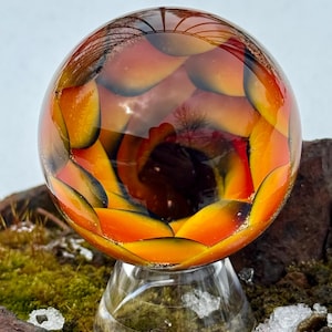 2 inch borosilicate glass marble. Red dichroic and pomegranate over ketchup red vortex design with rainbow opal in the center. Black backing with Lokis Lipstick over red feather pattern. Comes with display stand