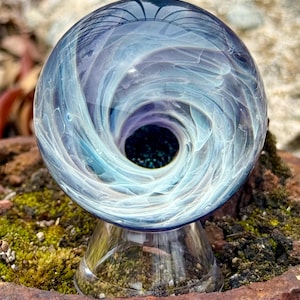 1.14 inch borosilicate glass marble. 24K gold and .99 fine silver fume in a implosion flower design. Galaxy black backing. Comes with a display stand.