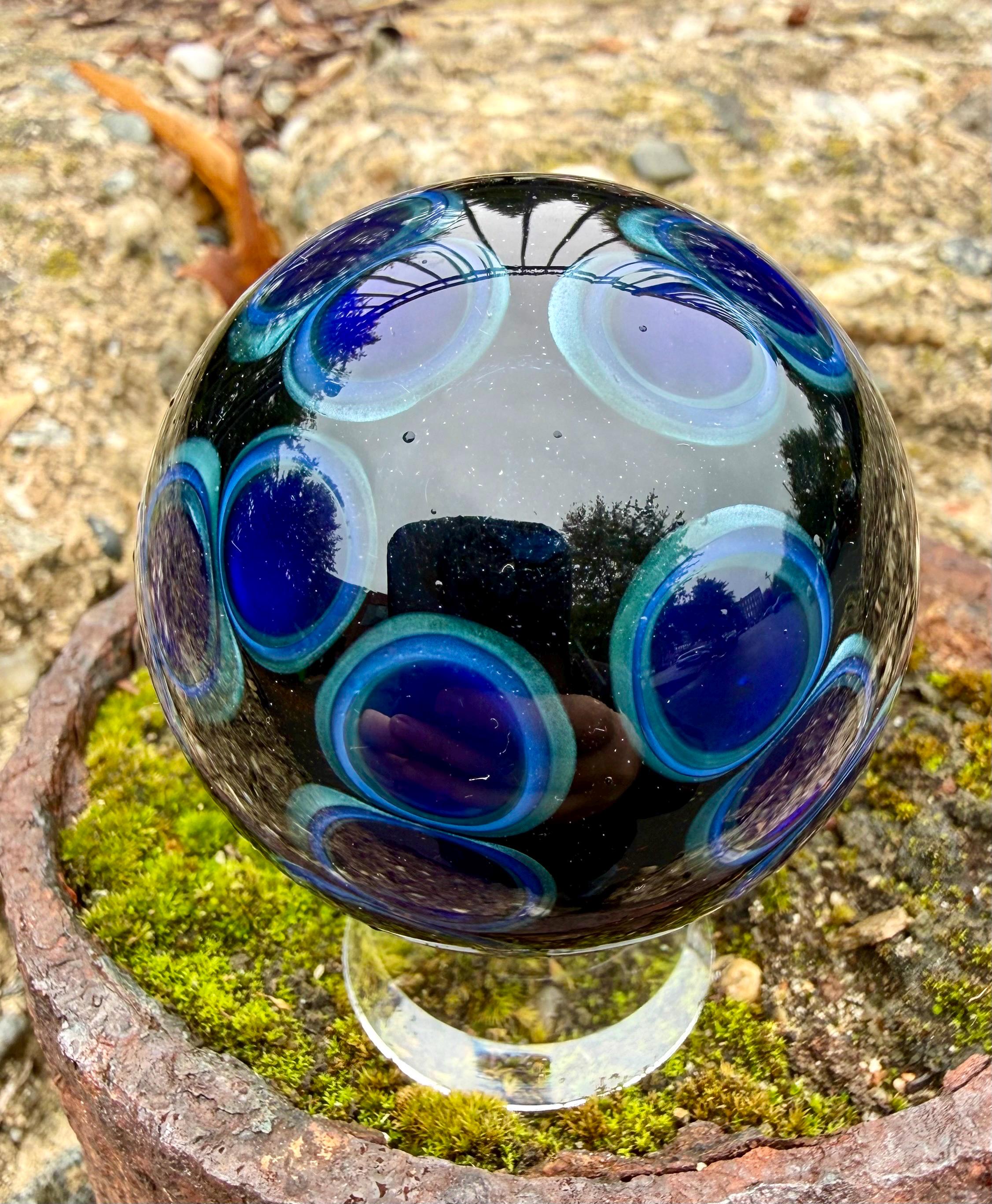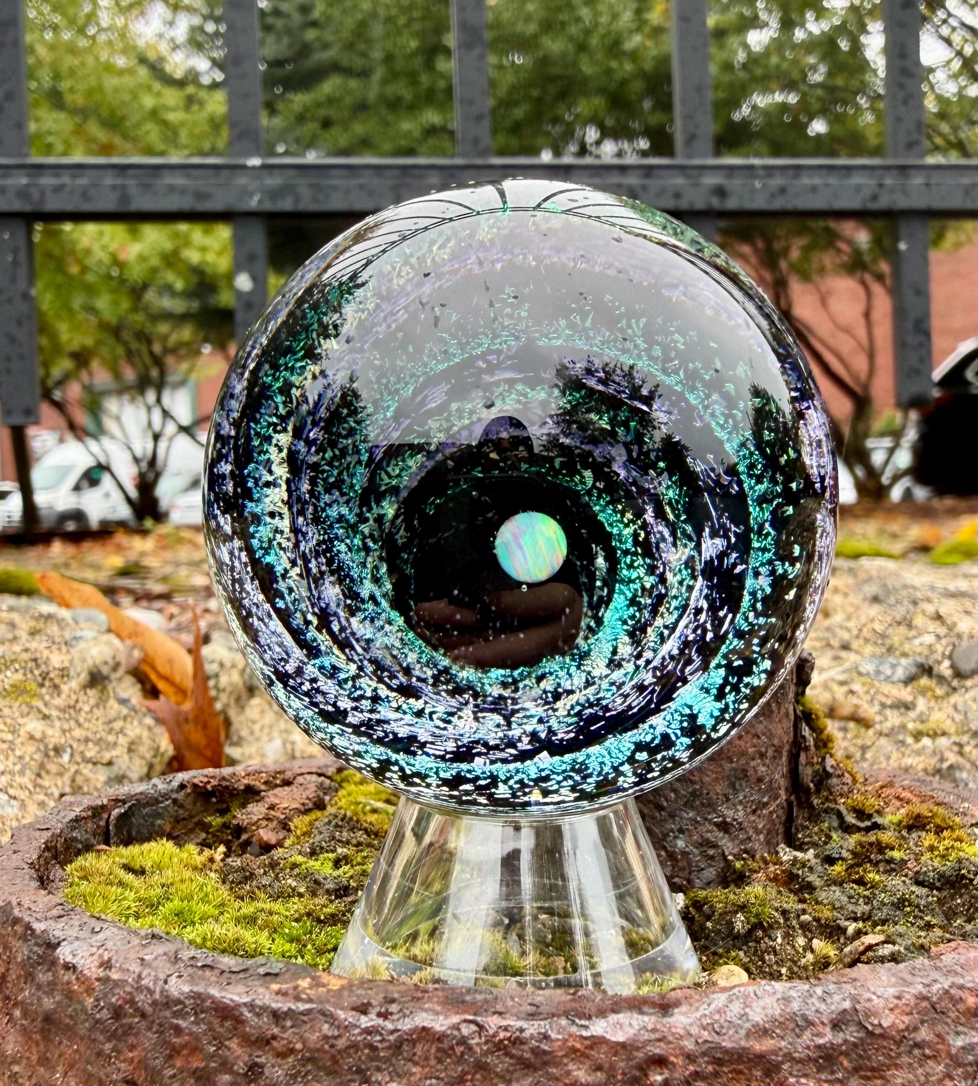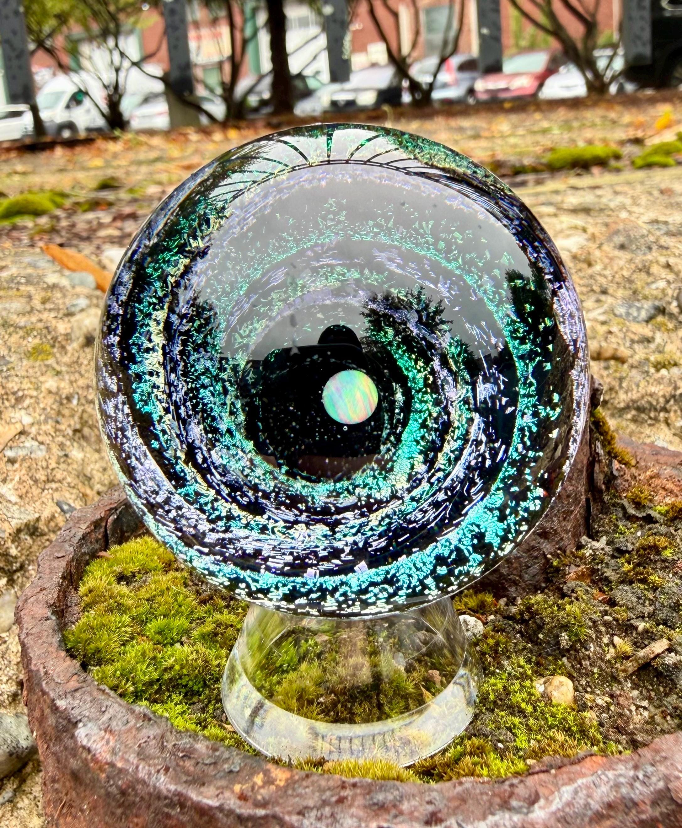 2 inch borosilicate glass marble. Purple and Aqua dichroic in a vortex design with a sphere opal embedded in center. Backed in Galaxy Black with Neptunium, Cobalt and Lavendar dot stack pattern. Comes with display stand.