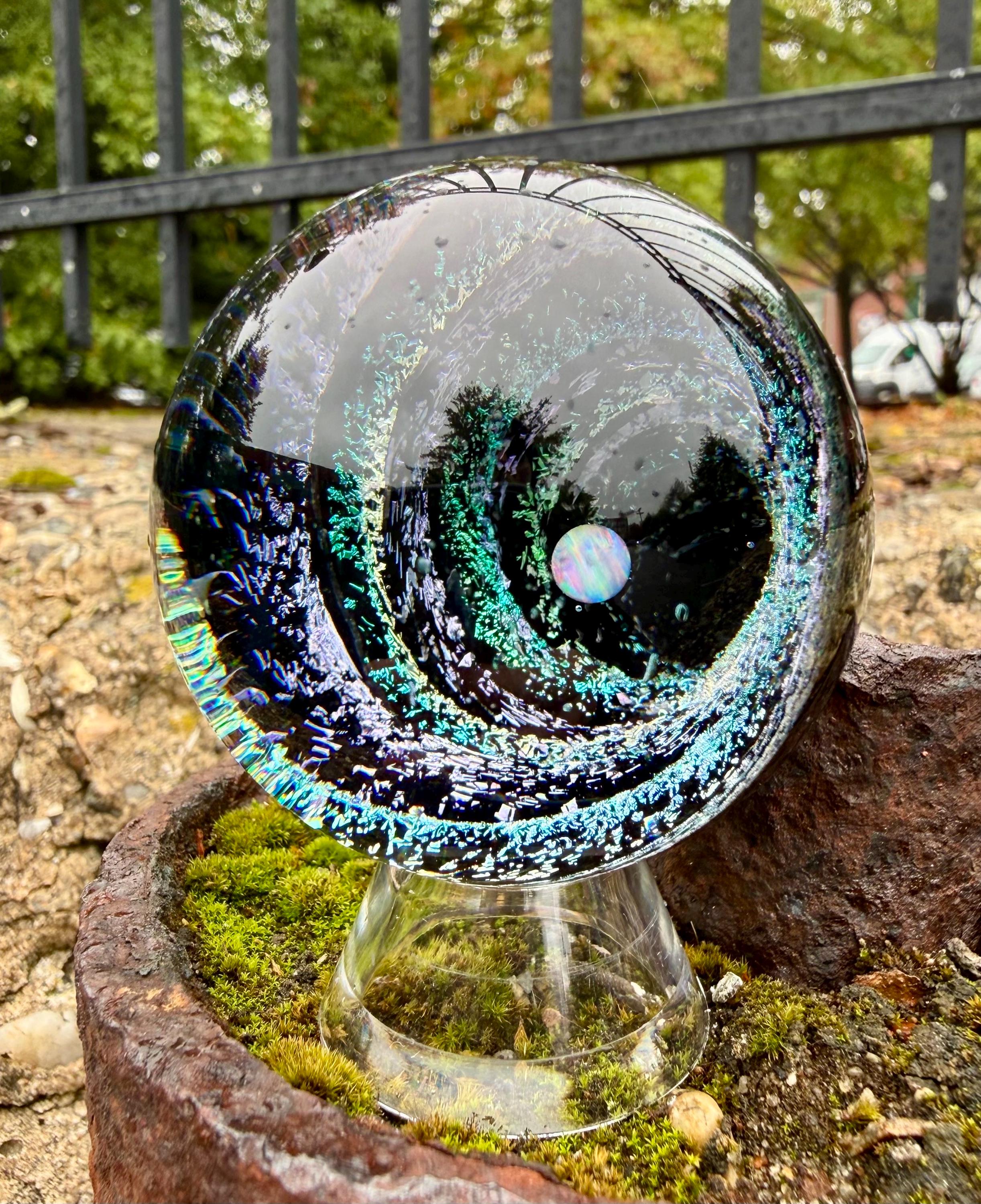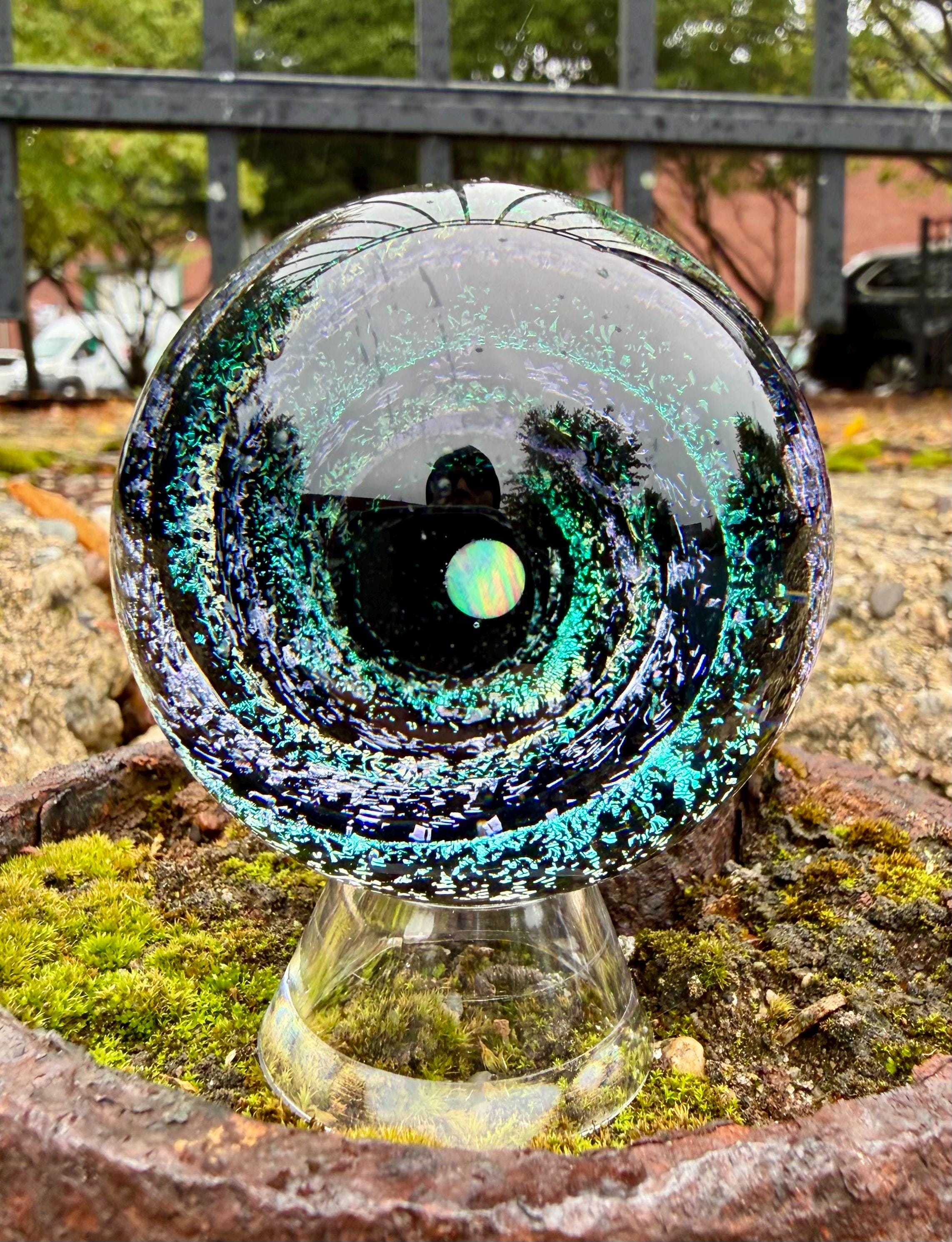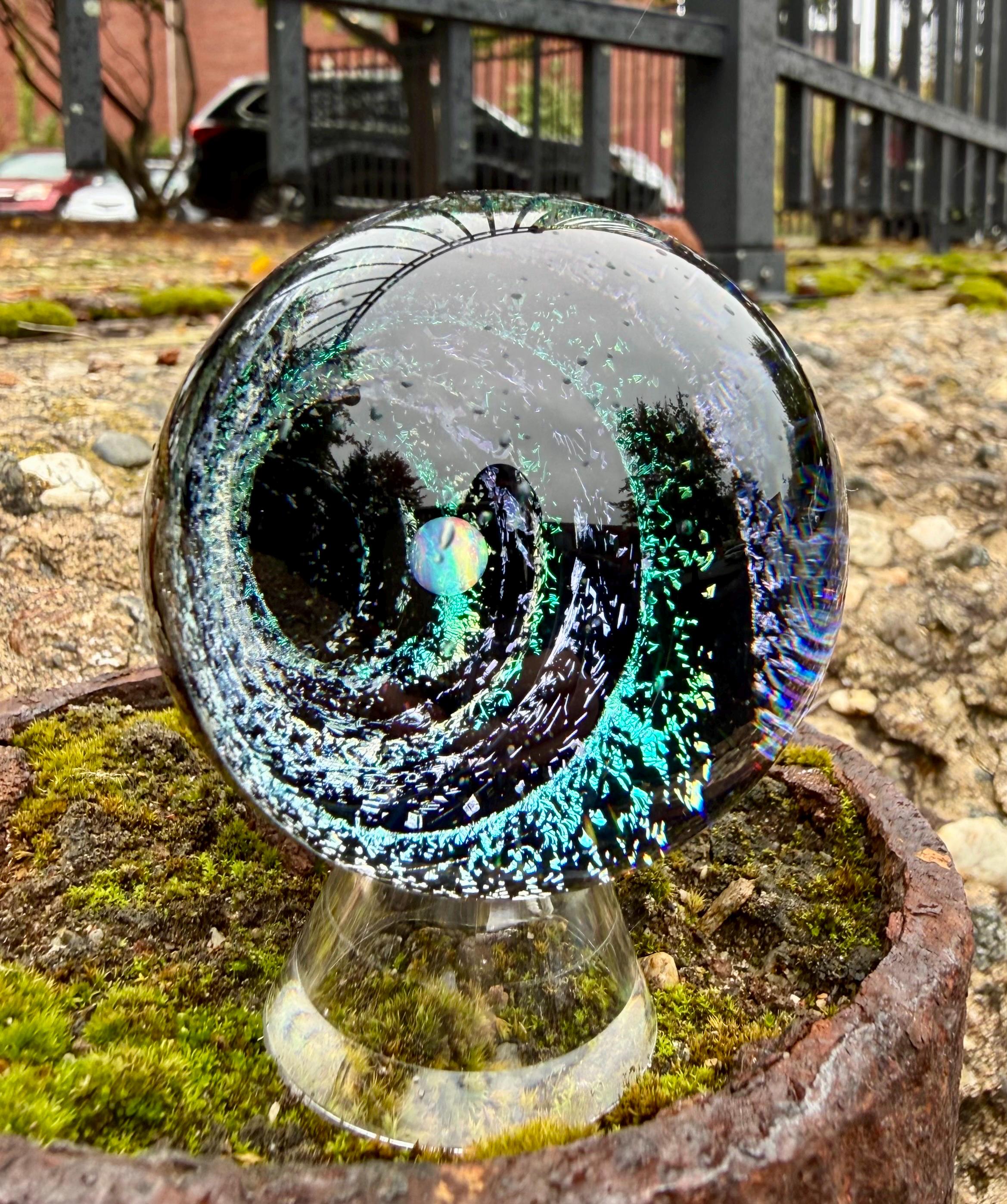 2 inch borosilicate glass marble. Purple and Aqua dichroic in a vortex design with a sphere opal embedded in center. Backed in Galaxy Black with Neptunium, Cobalt and Lavendar dot stack pattern. Comes with display stand.