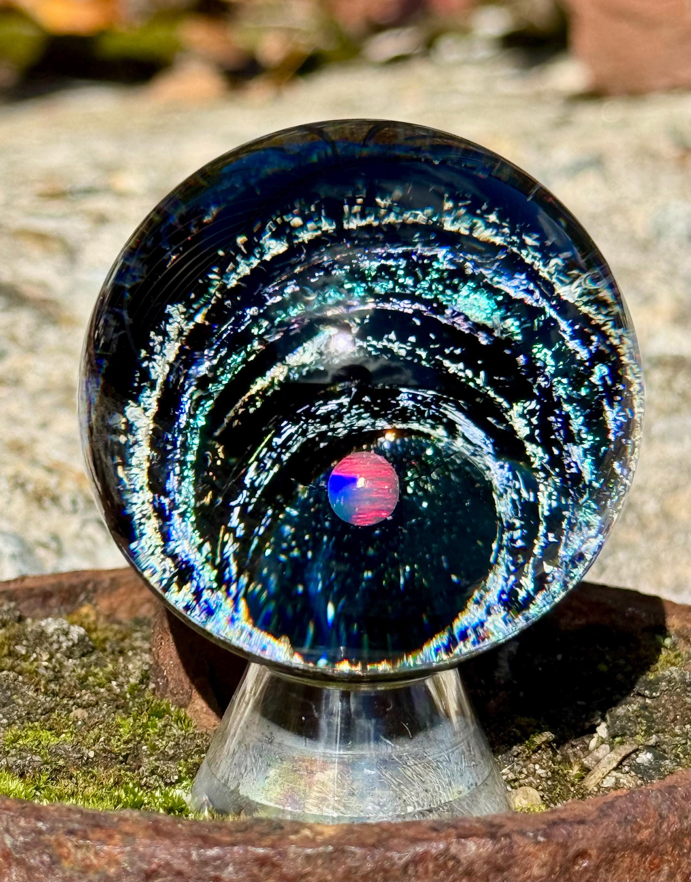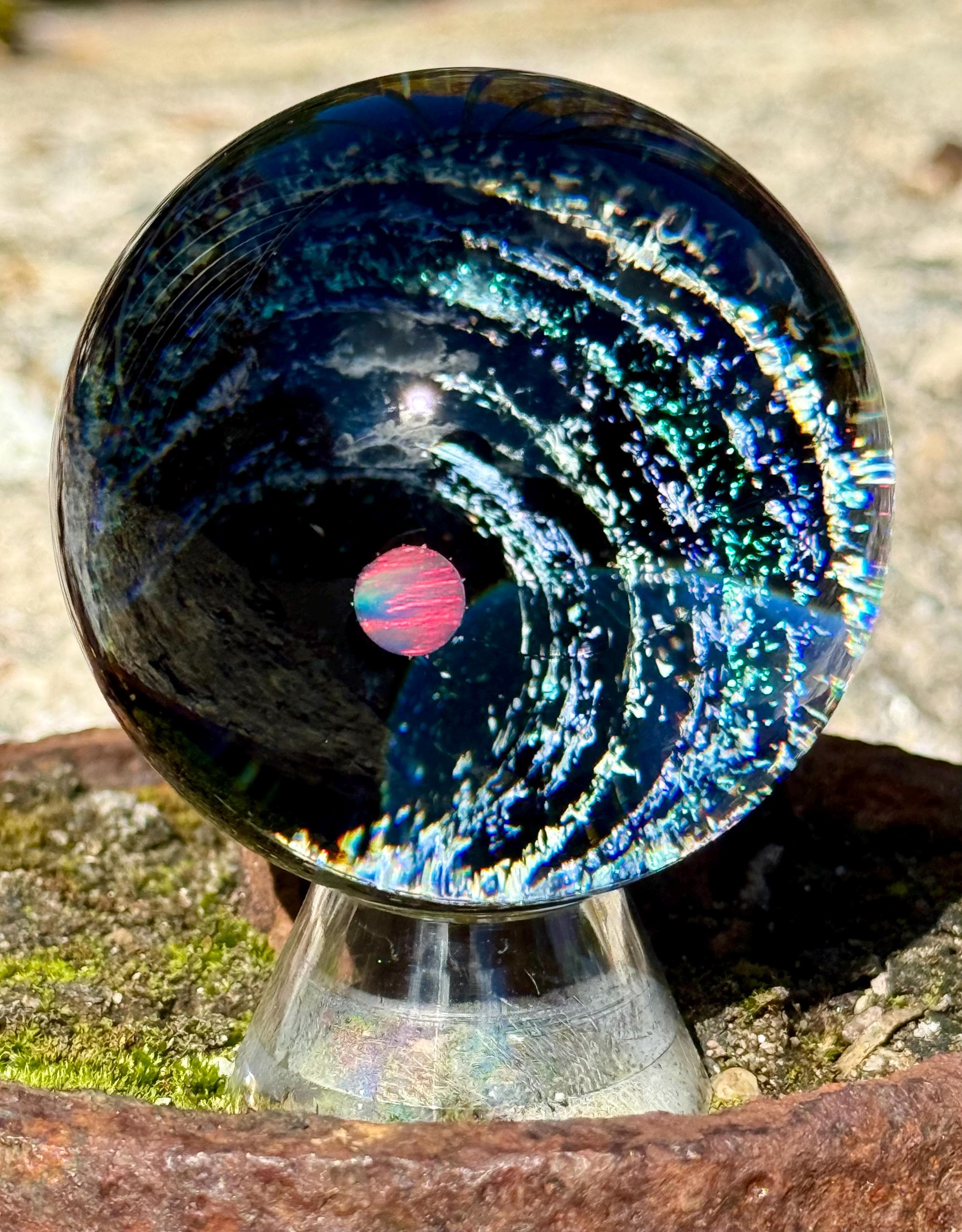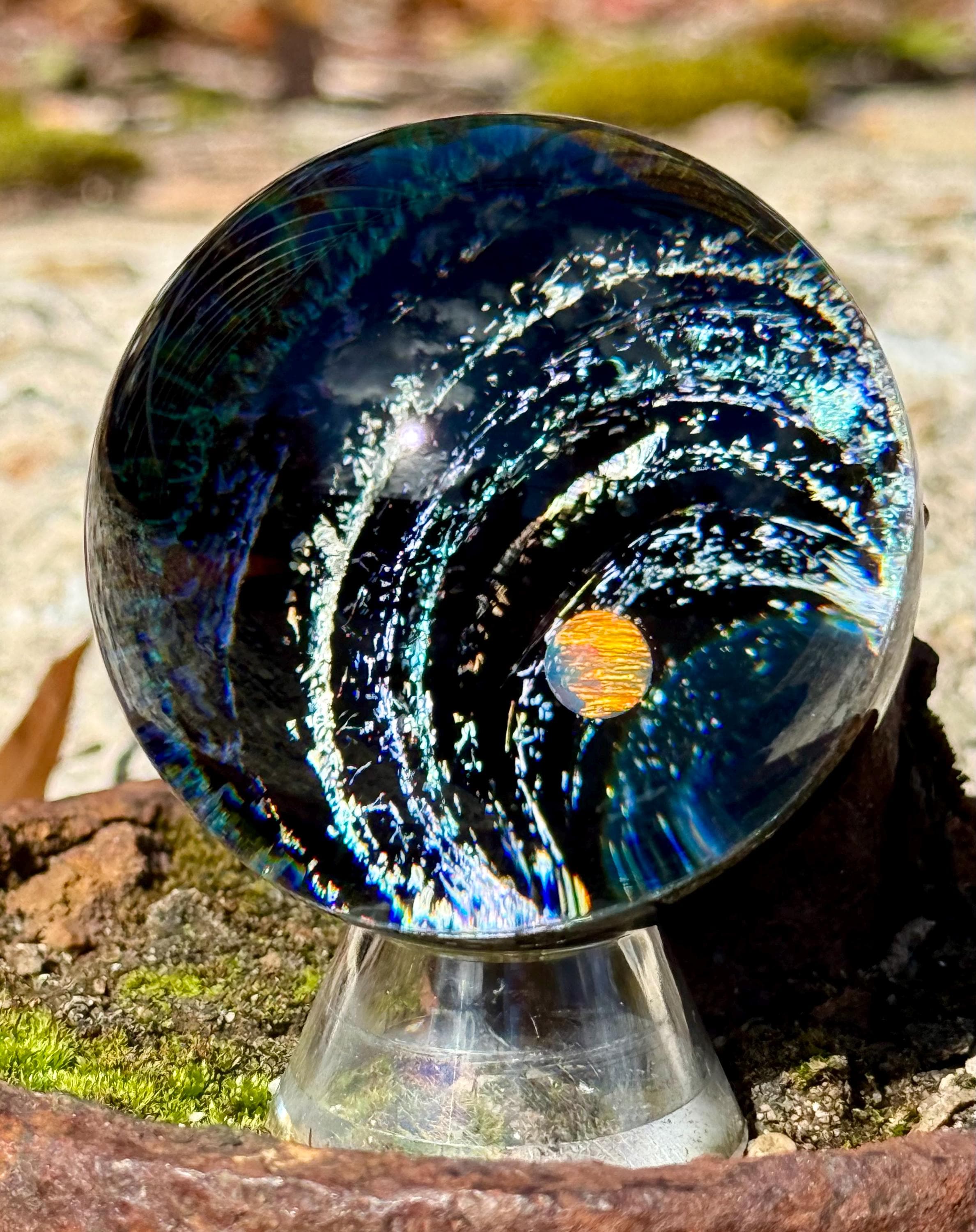 2.1 inch Boroscilicate glass marble. Aqua and Purple dichroic in a vortex design with a sphere opal in center. Backed in Jet Black with Electrum and Torquesa feather pattern. Comes with display stand