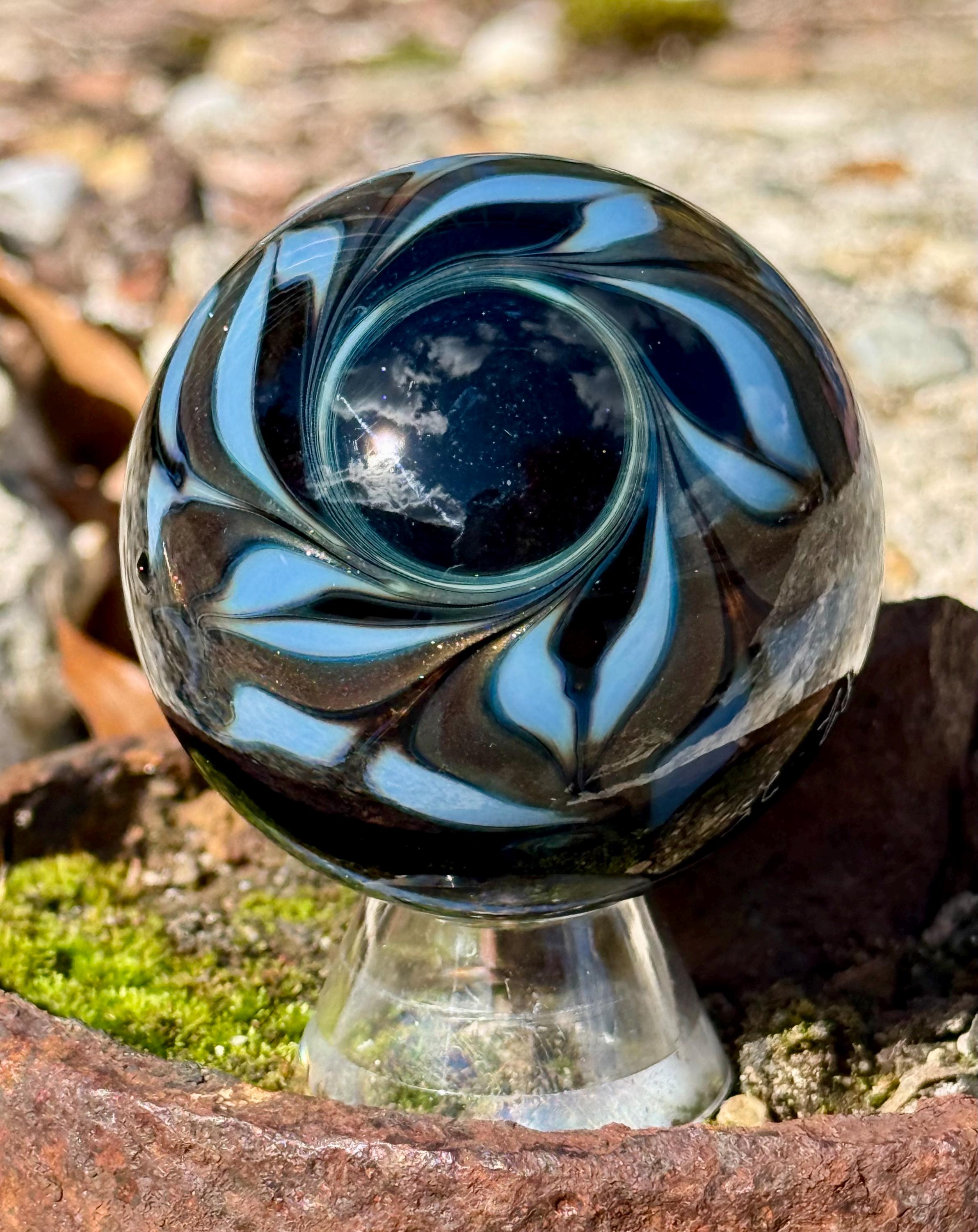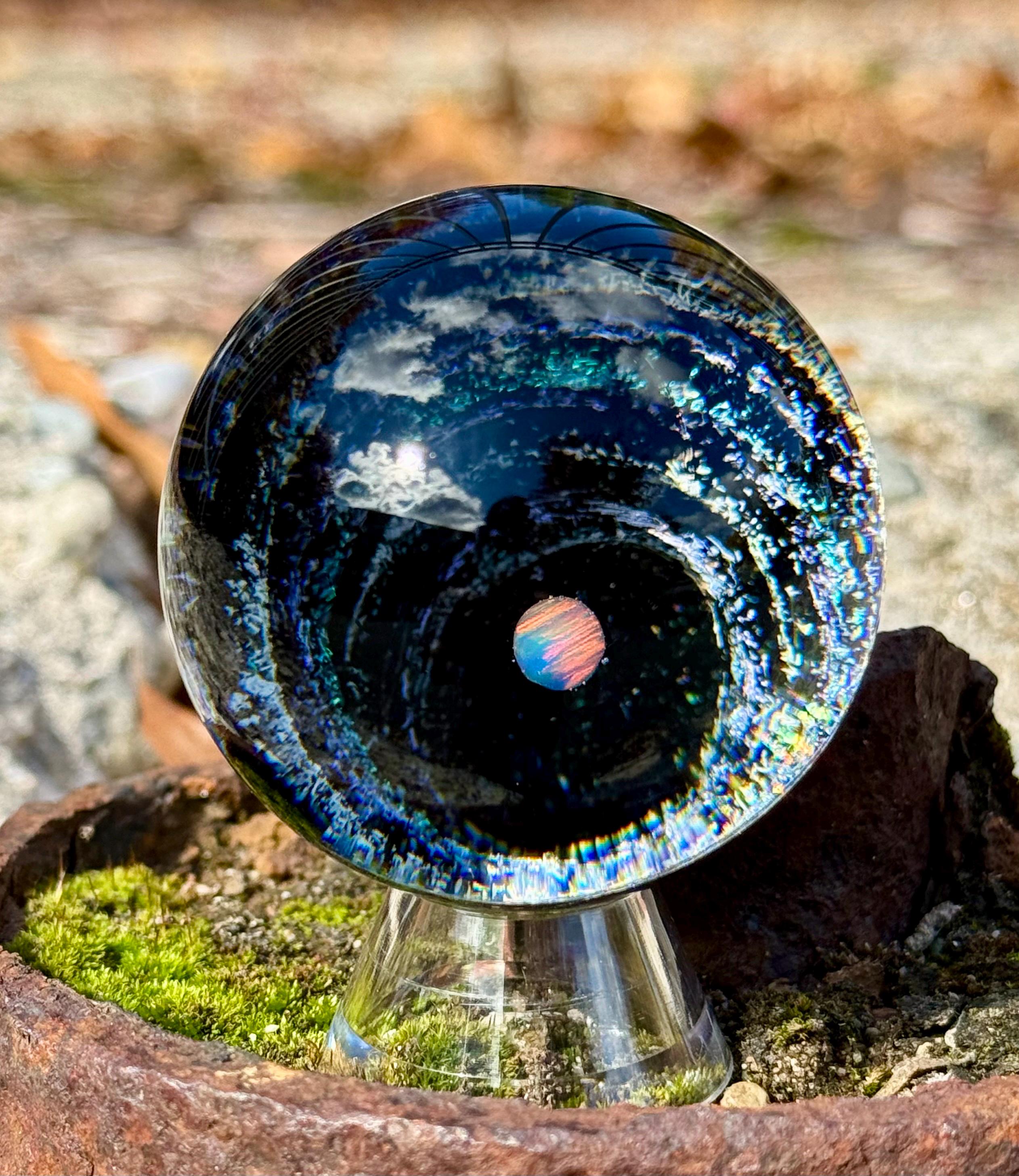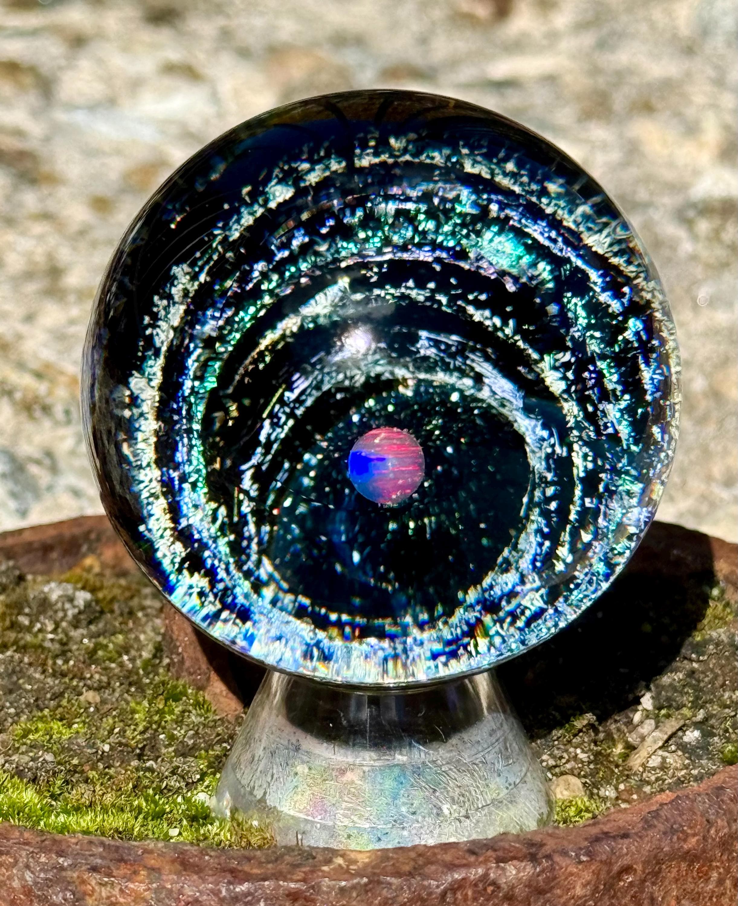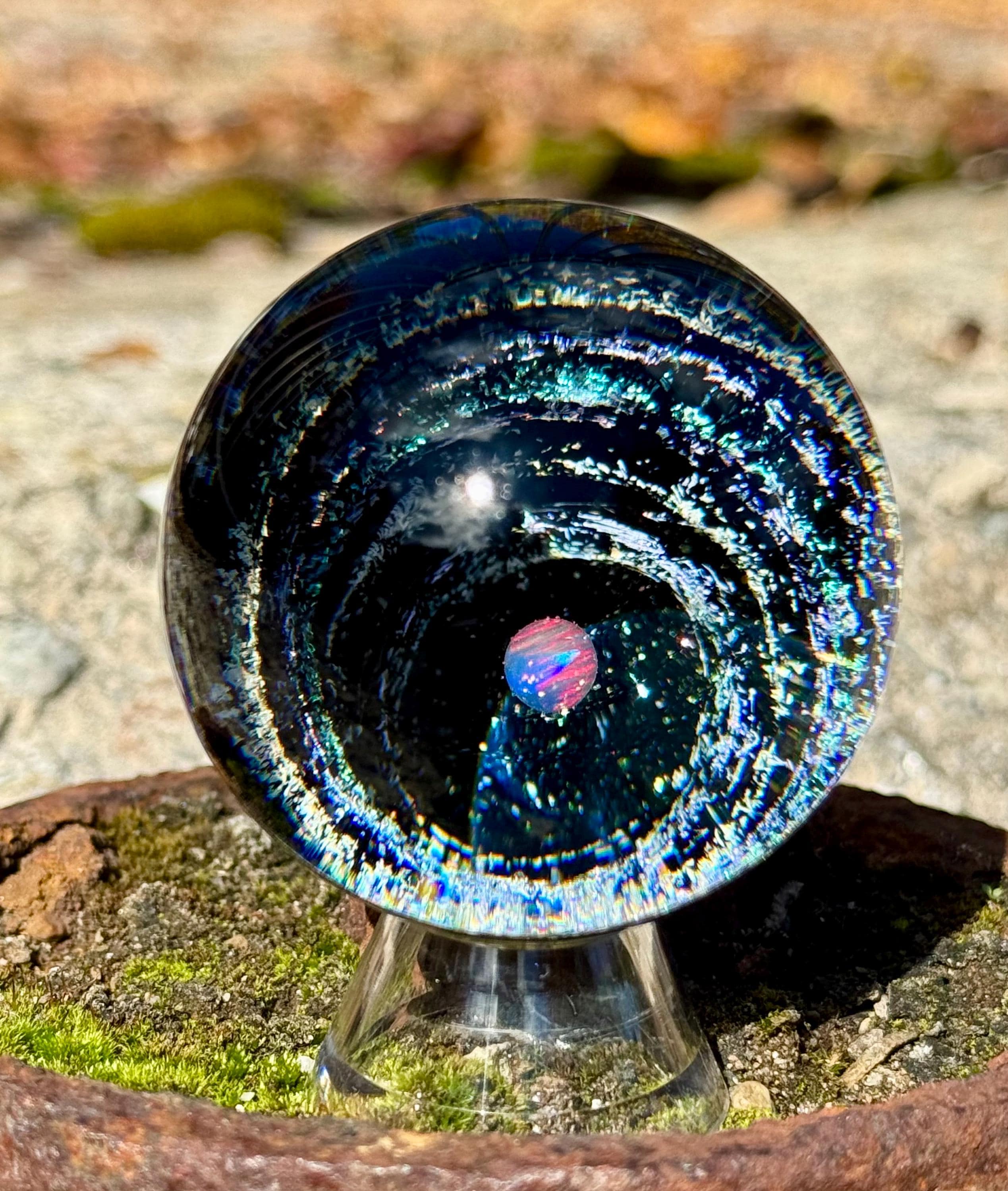 2.1 inch Boroscilicate glass marble. Aqua and Purple dichroic in a vortex design with a sphere opal in center. Backed in Jet Black with Electrum and Torquesa feather pattern. Comes with display stand