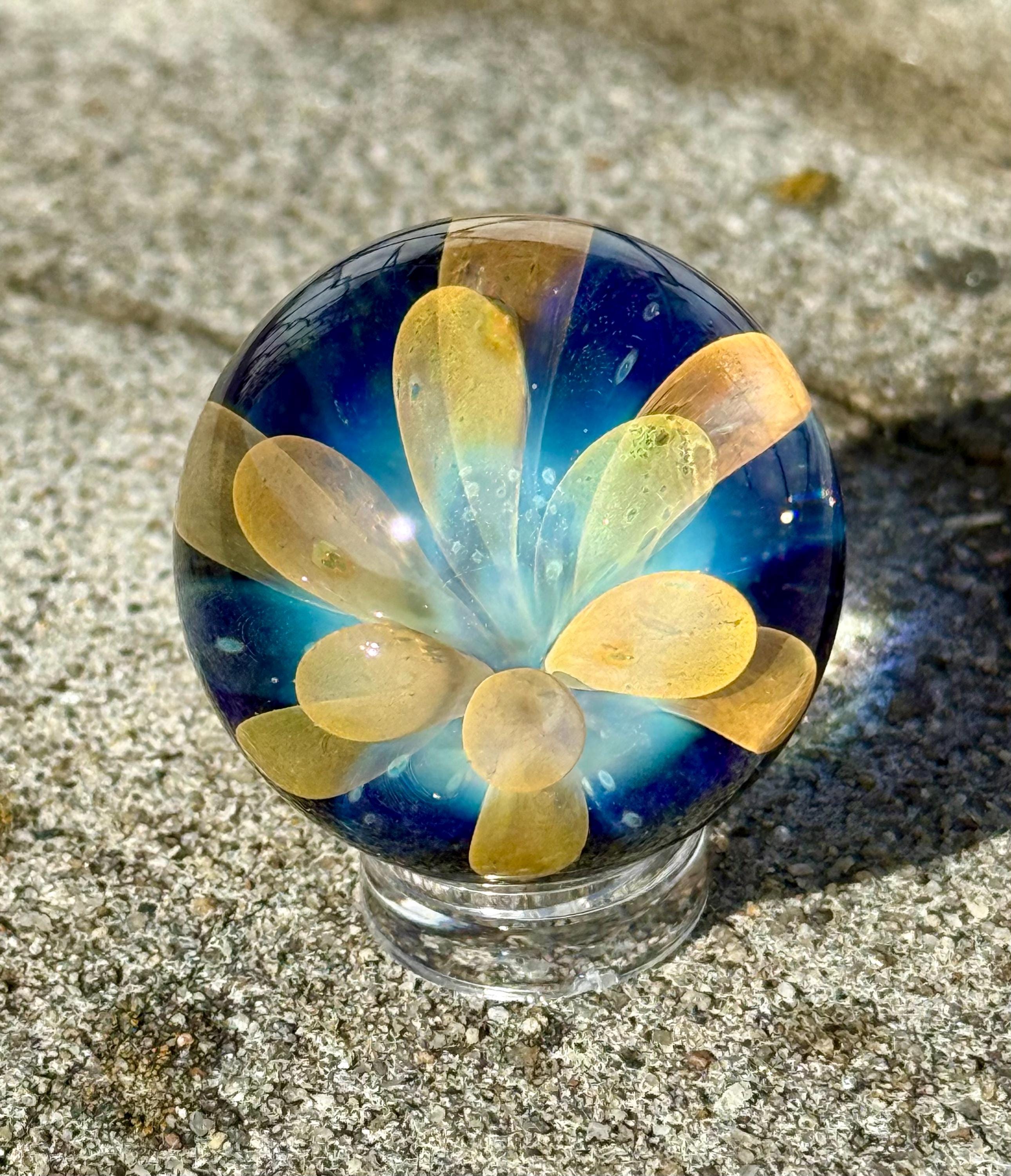 1.15 inch borosilicate glass marble. 24K gold and .99 fine silver fume in a implosion Flower design. Backed with Heavy Blue Stardust and Cobalt blue. Comes with display stand.