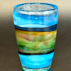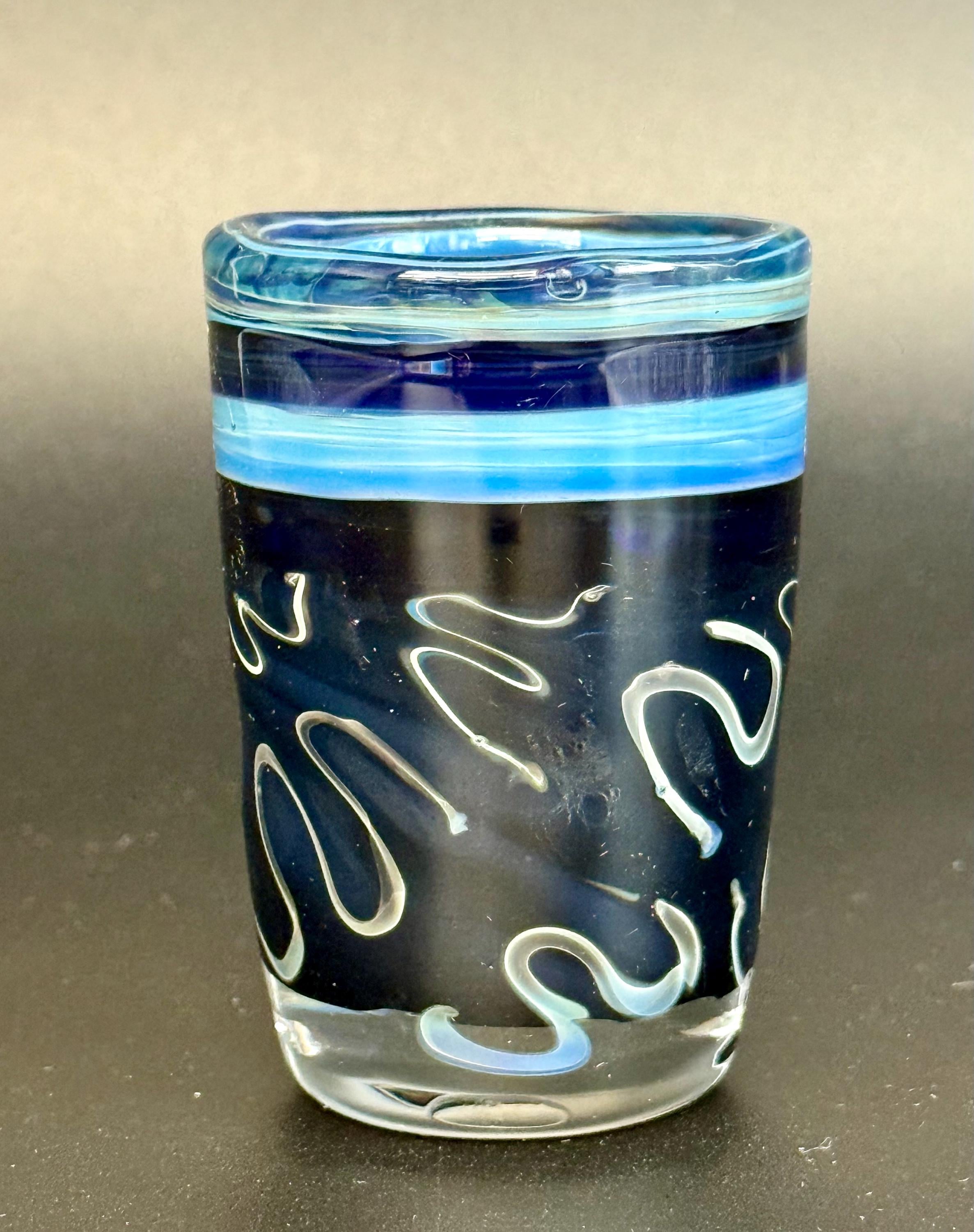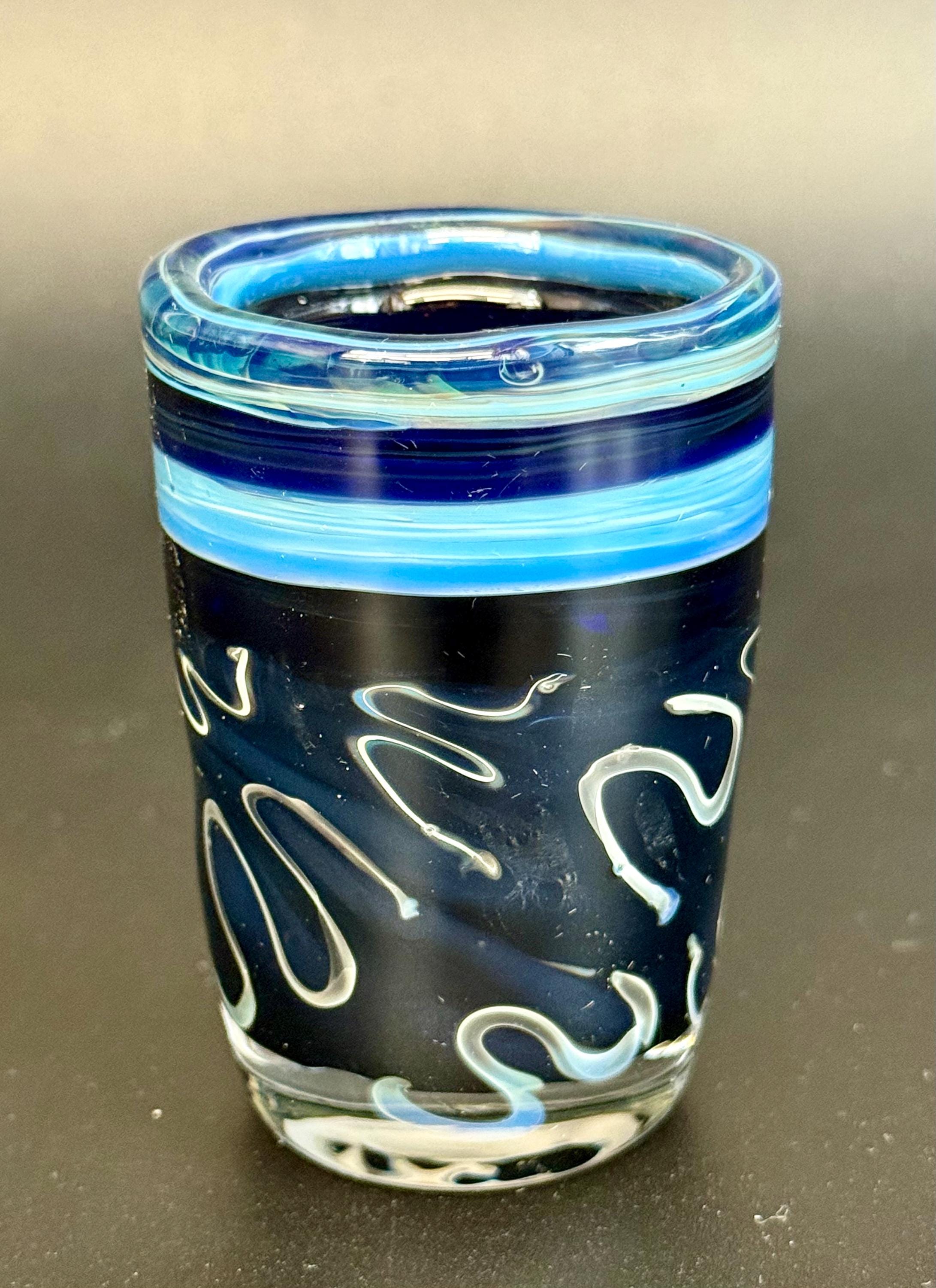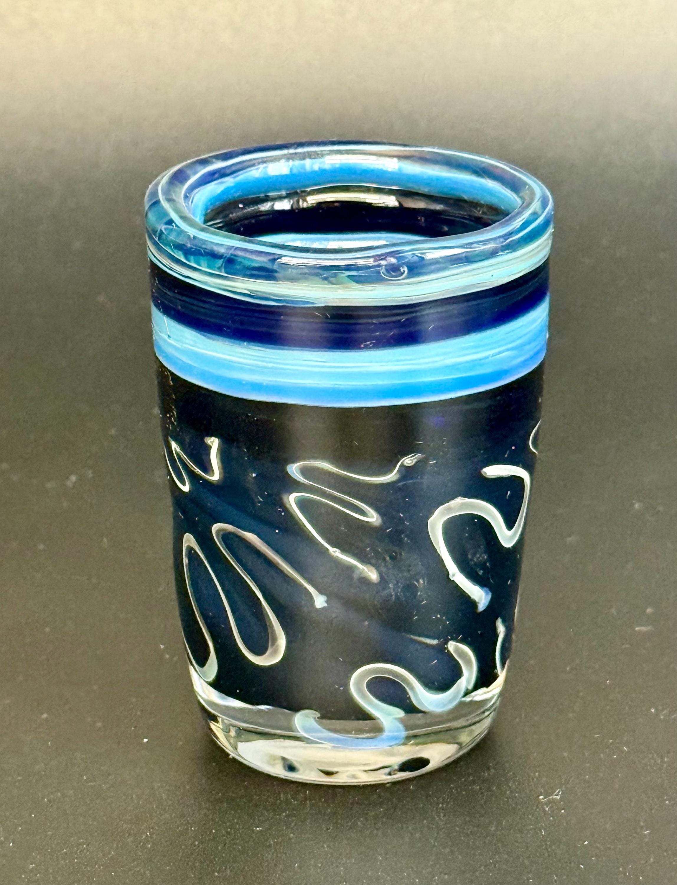 2.8 inch tall and 1.8 inch wide borosilicate glass shot glass. Section of Jet Black with Silver fume Skribble Tech and bands of Cobalt blue and Irrid on top.