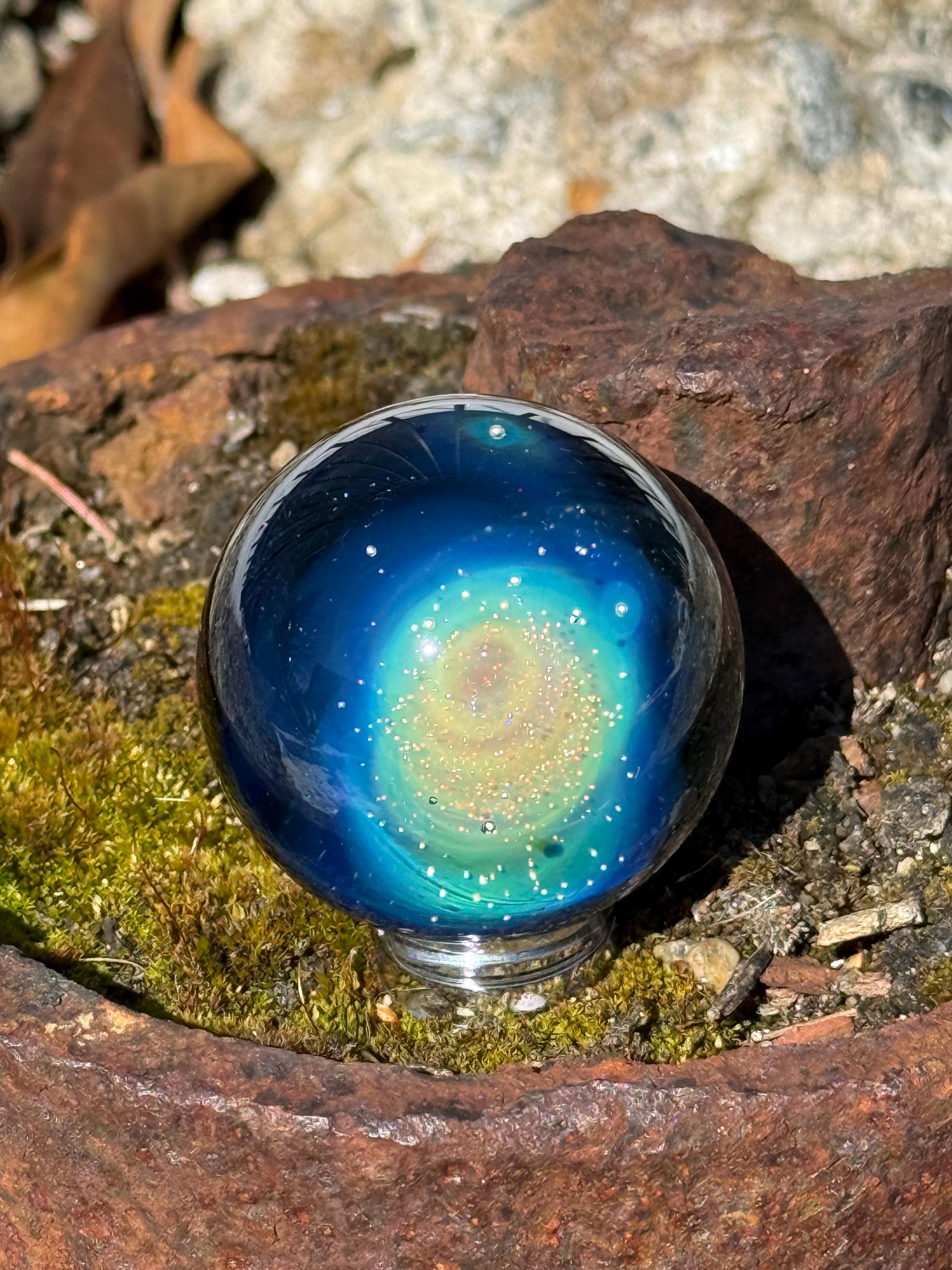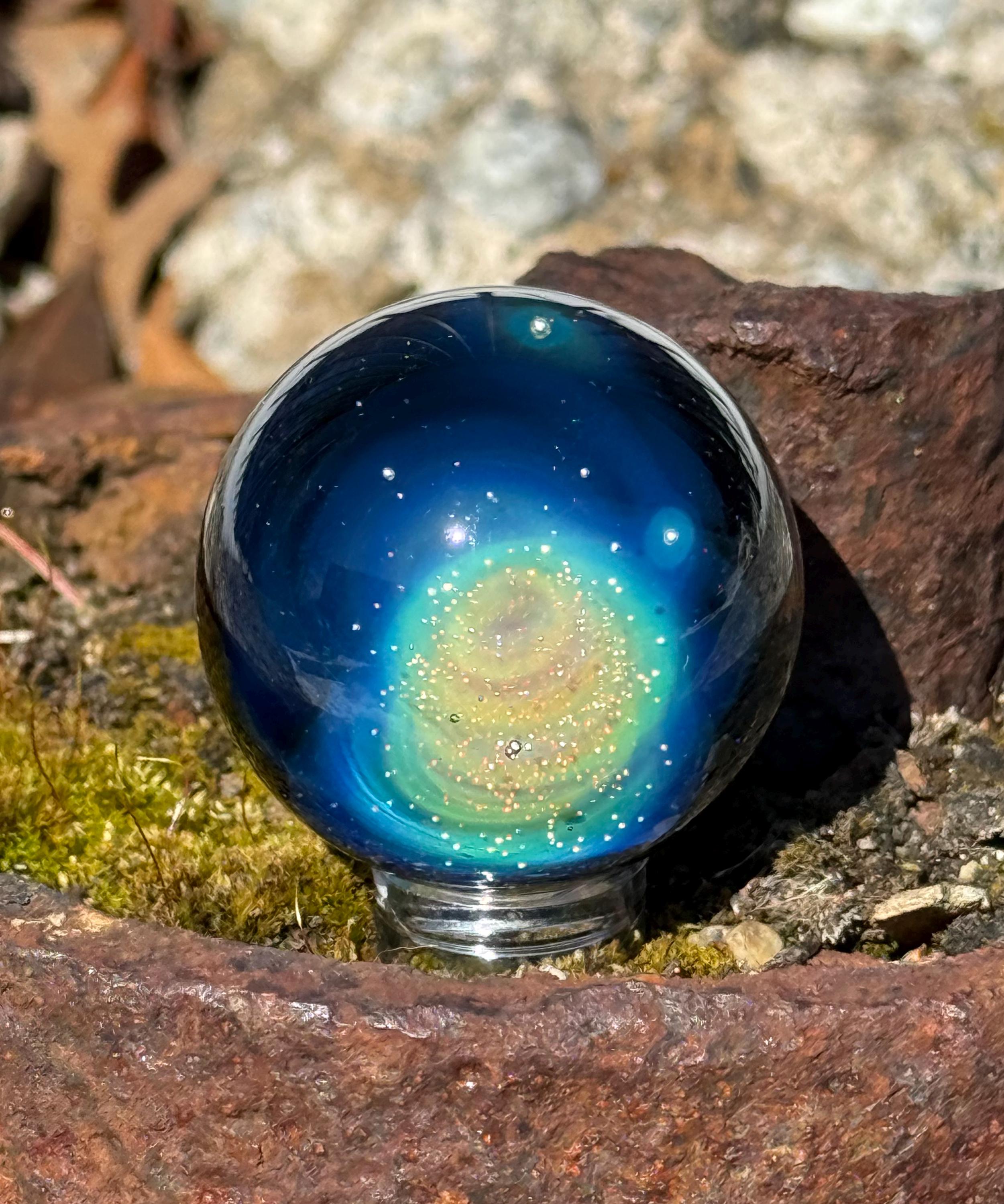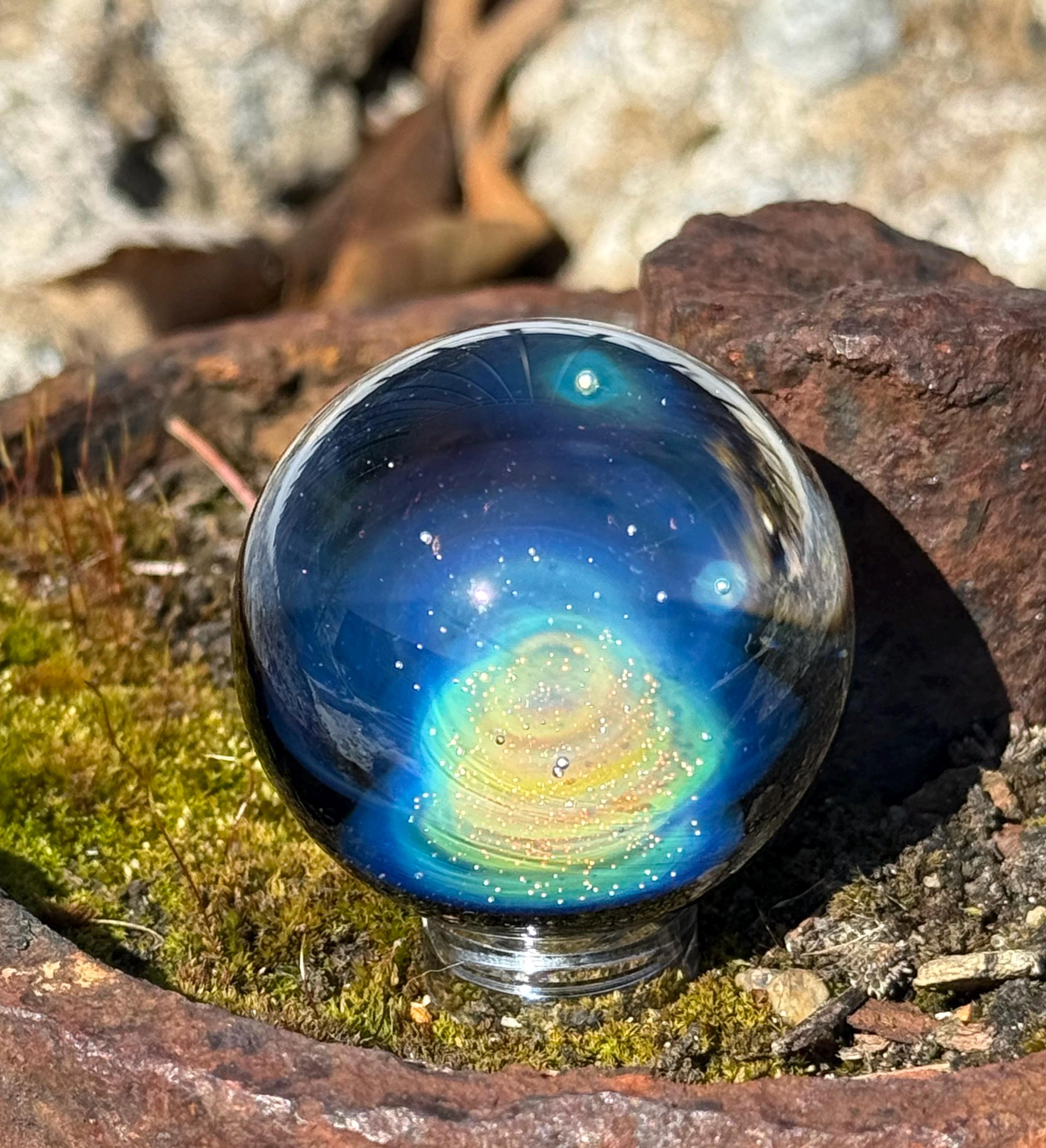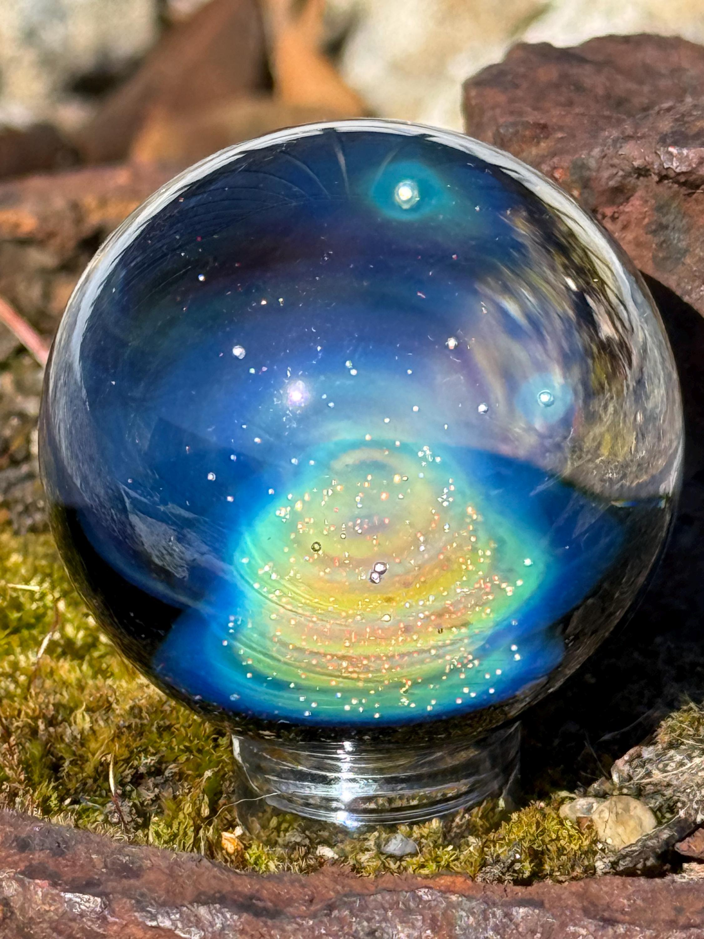 1.47 inch borosilicate glass marble. .99 fine silver in a nebula design backed in Galaxy Black. Comes with display stand