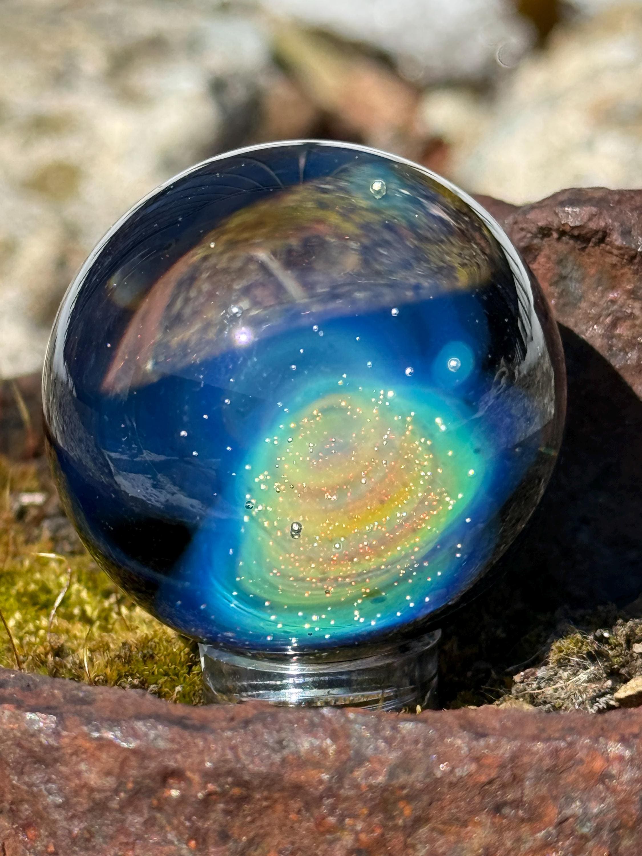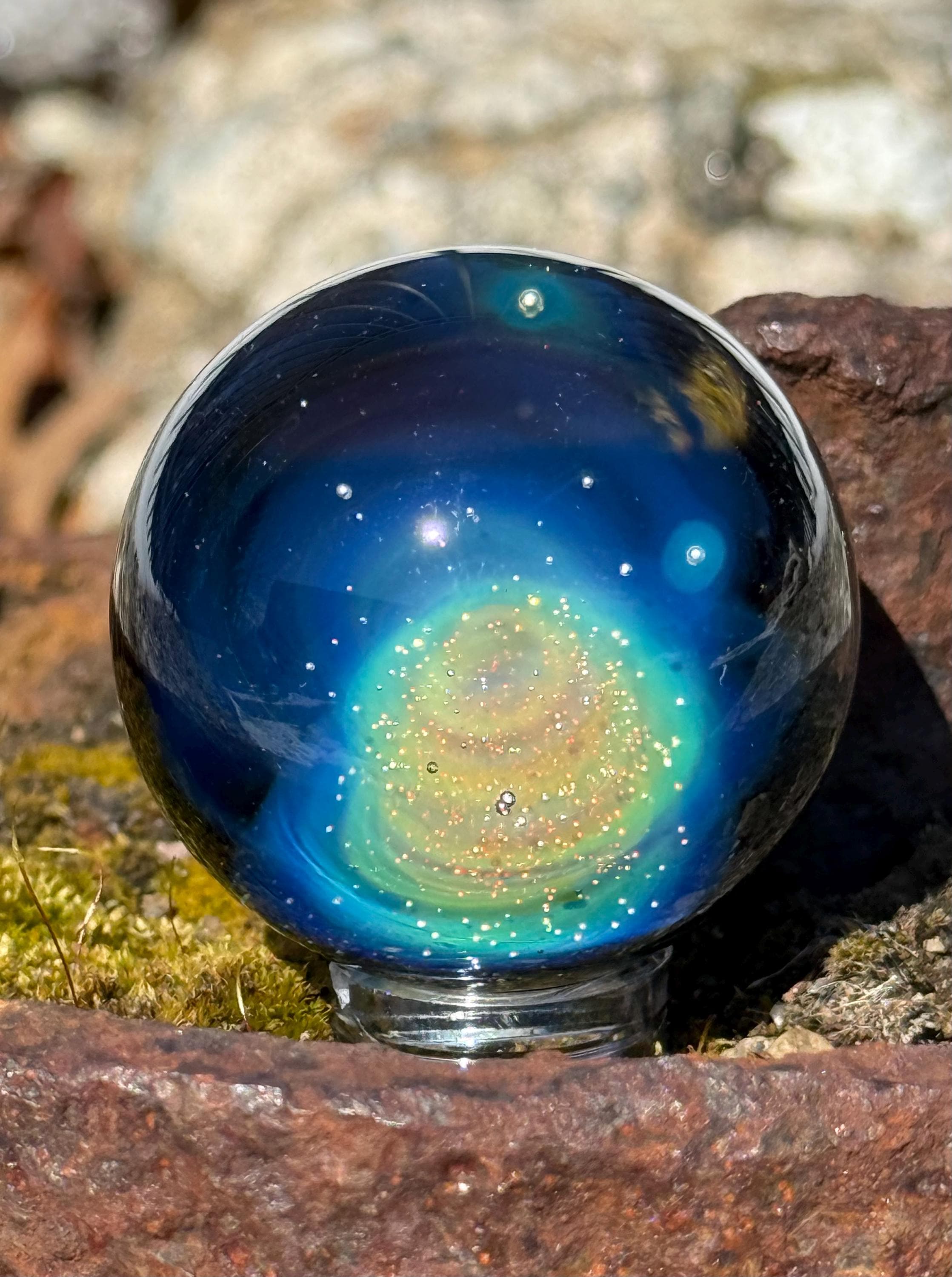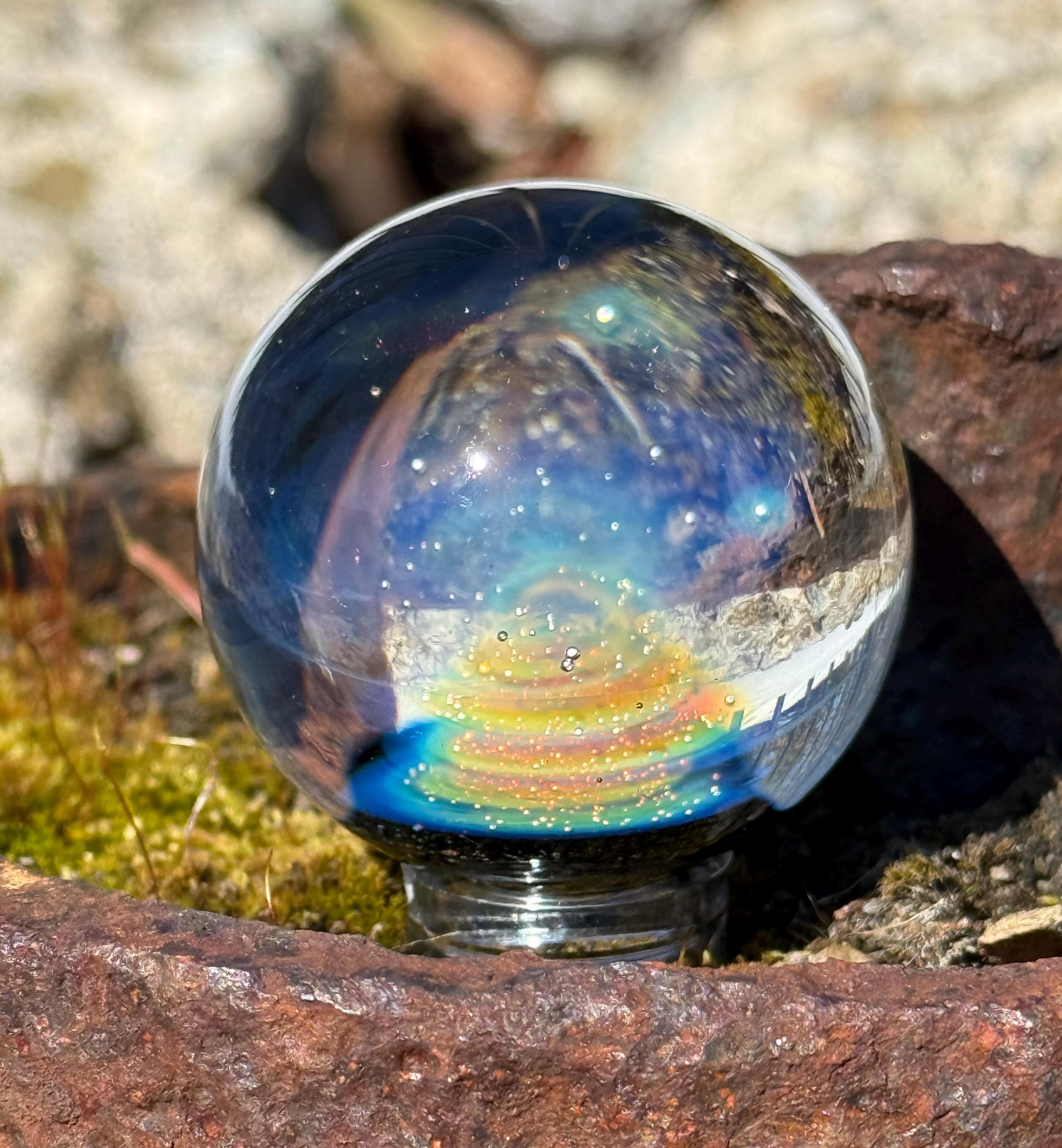 1.47 inch borosilicate glass marble. .99 fine silver in a nebula design backed in Galaxy Black. Comes with display stand