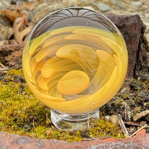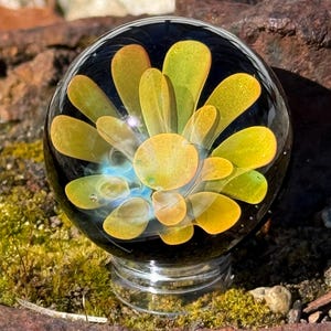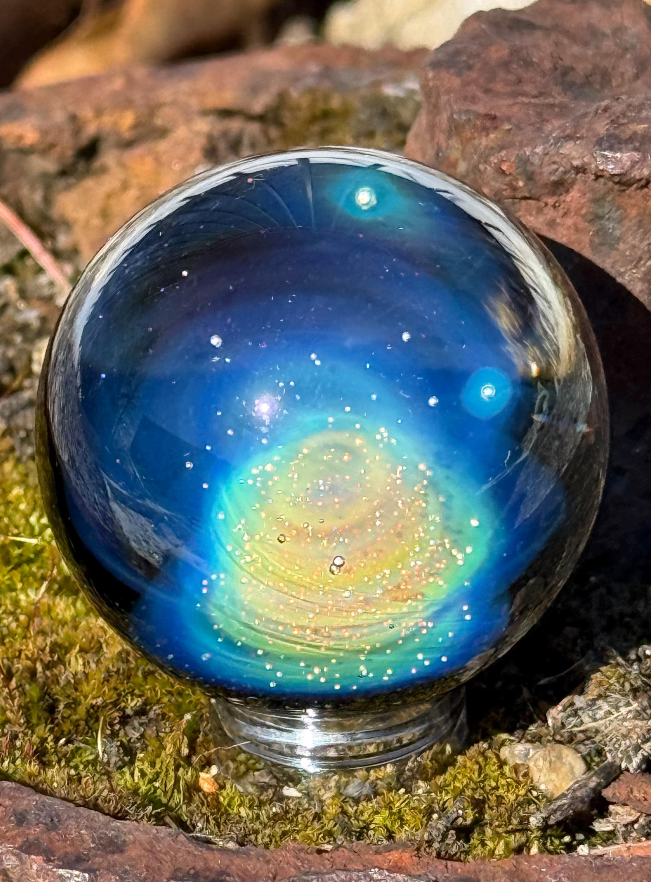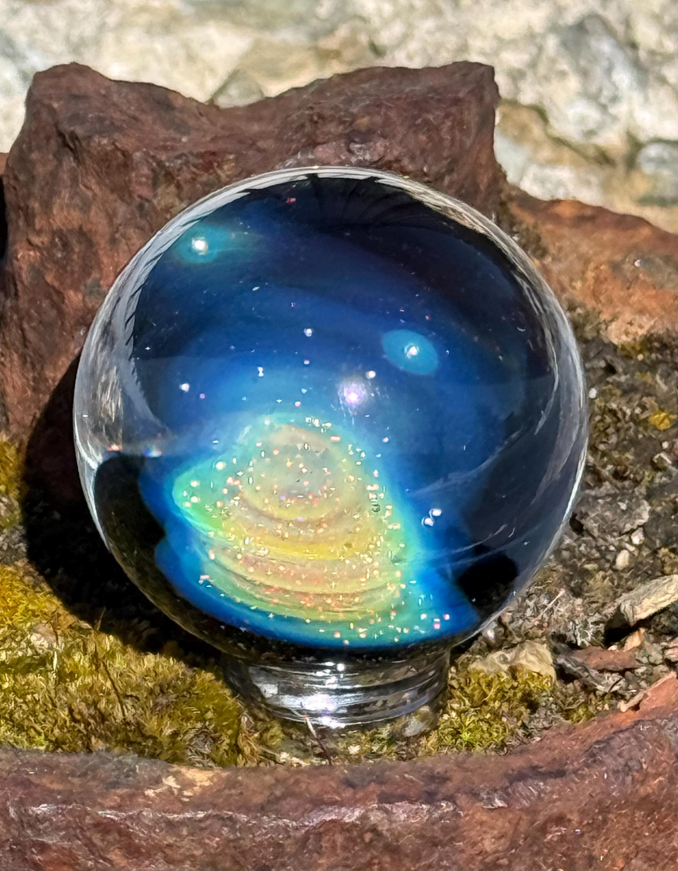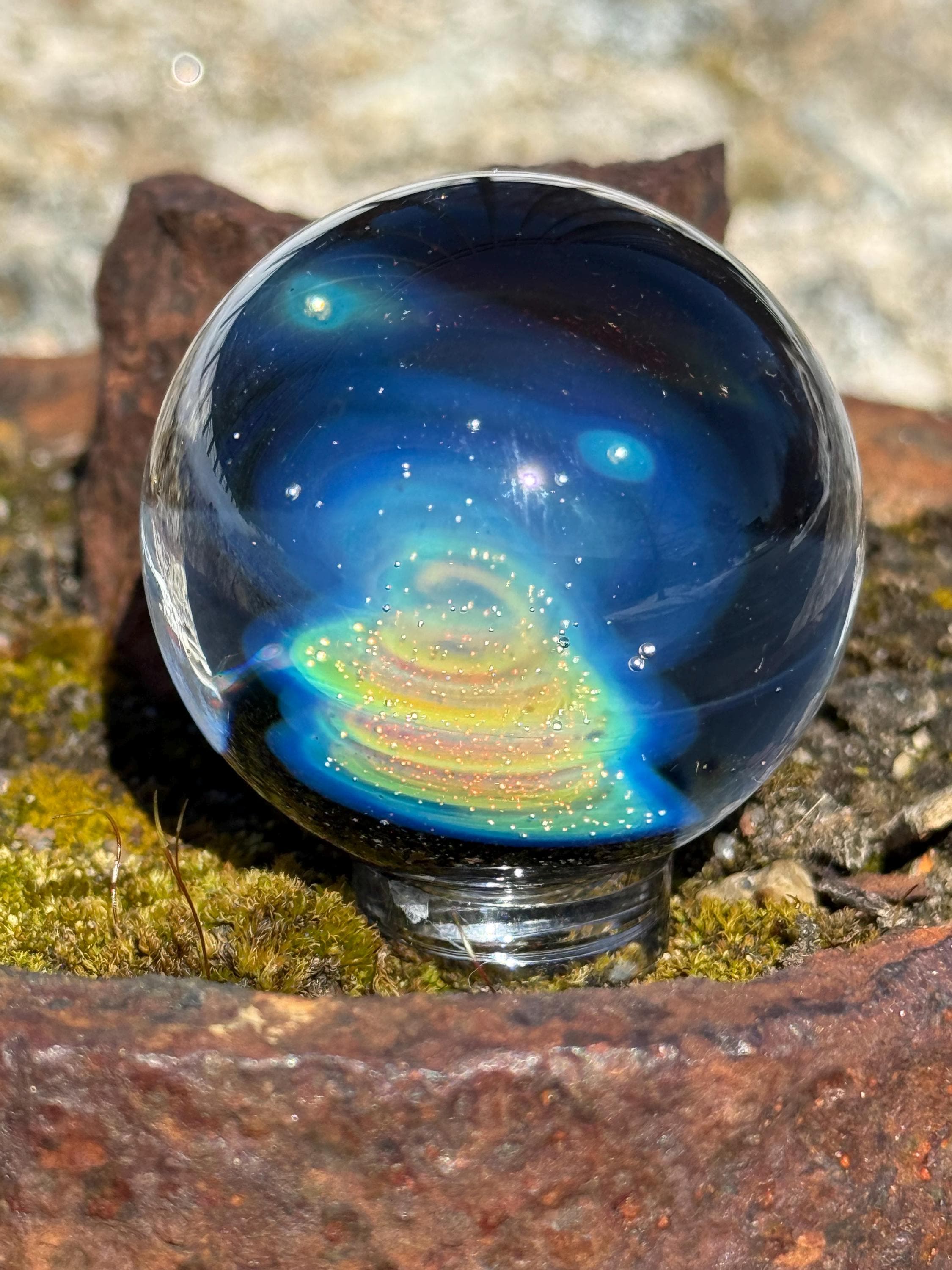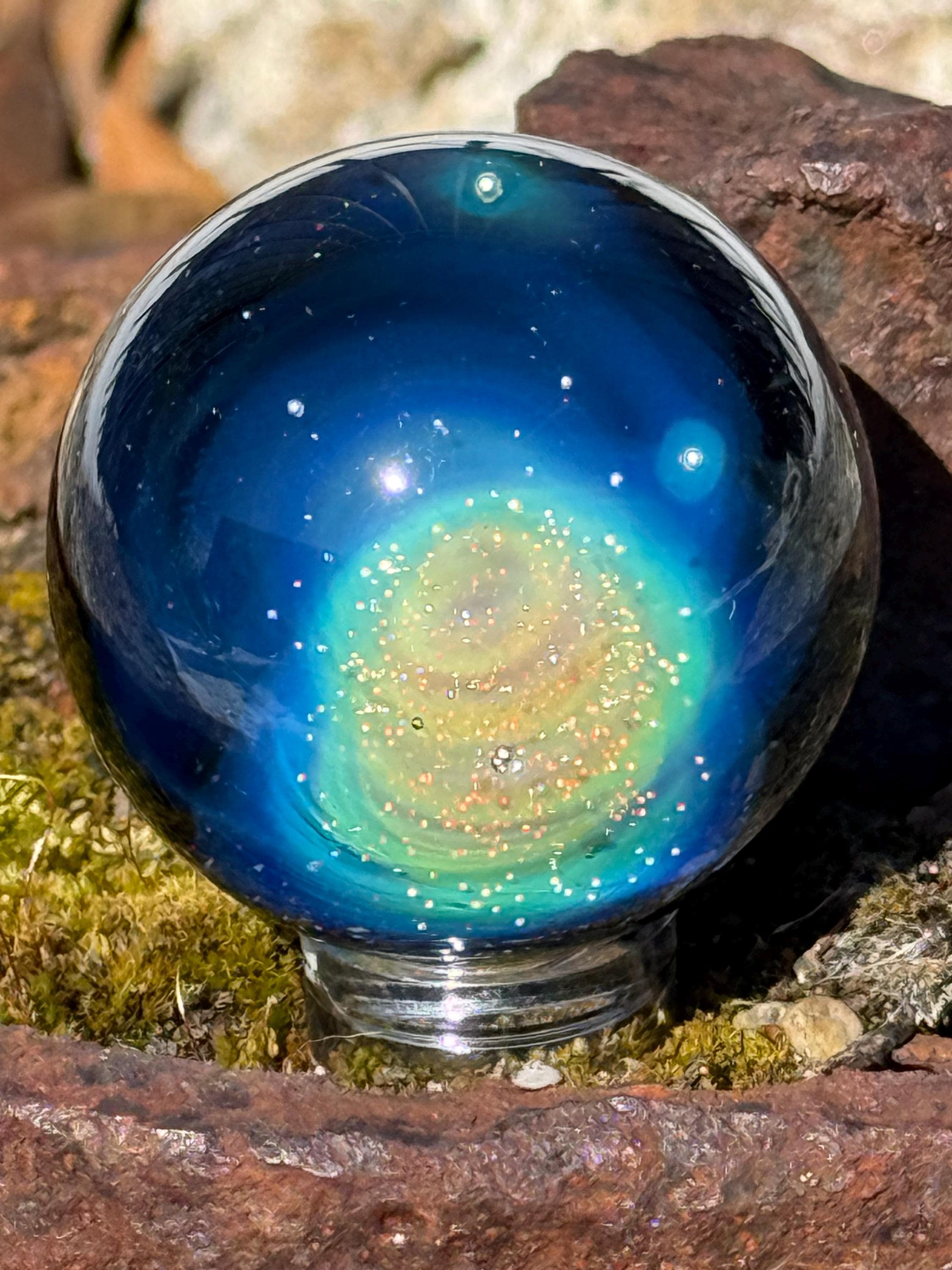 1.47 inch borosilicate glass marble. .99 fine silver in a nebula design backed in Galaxy Black. Comes with display stand