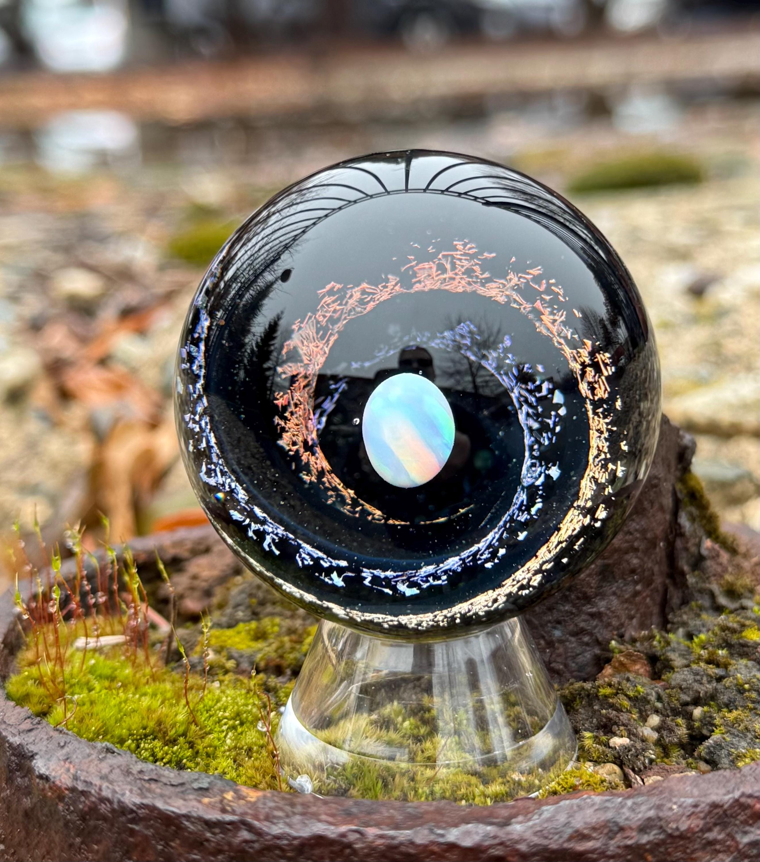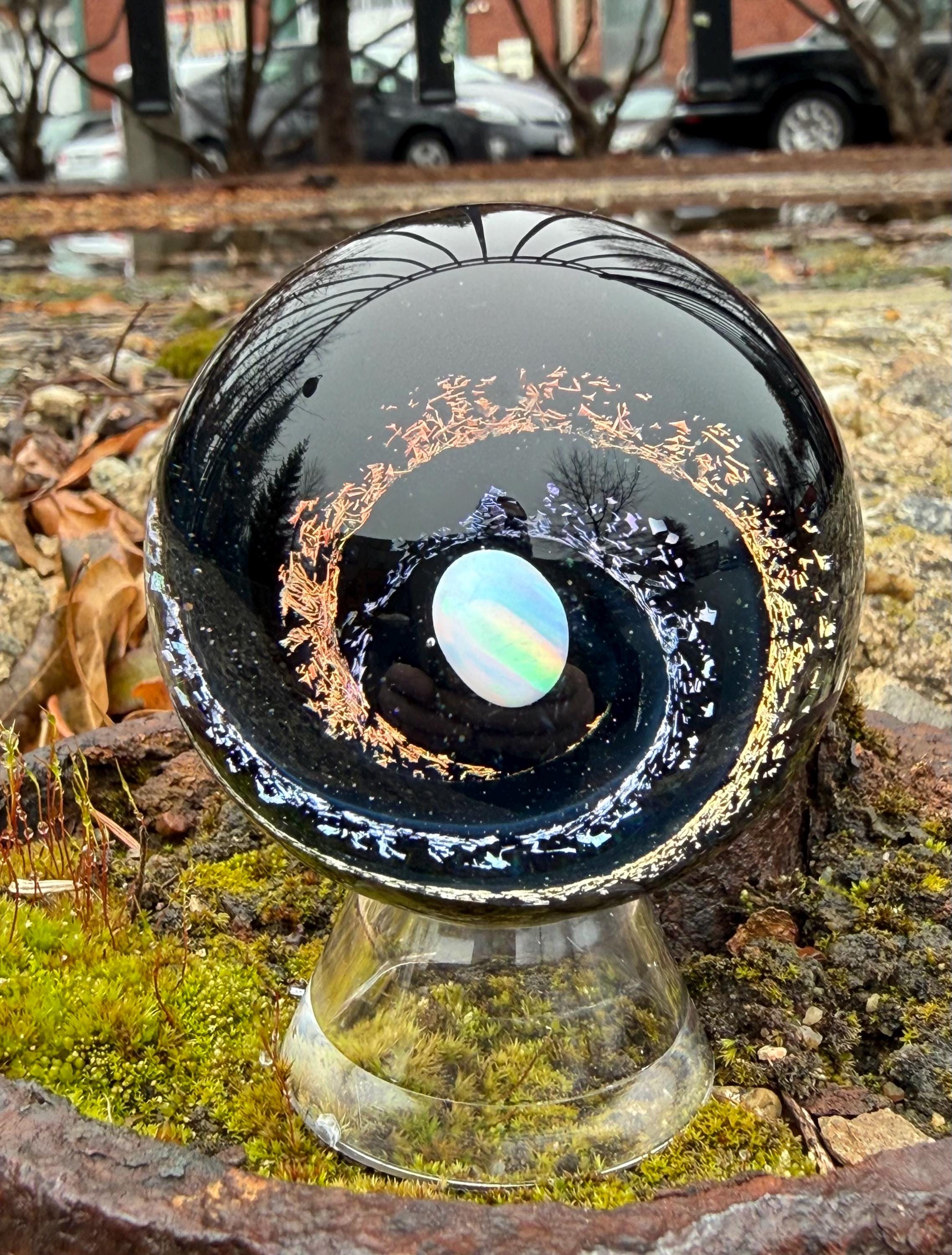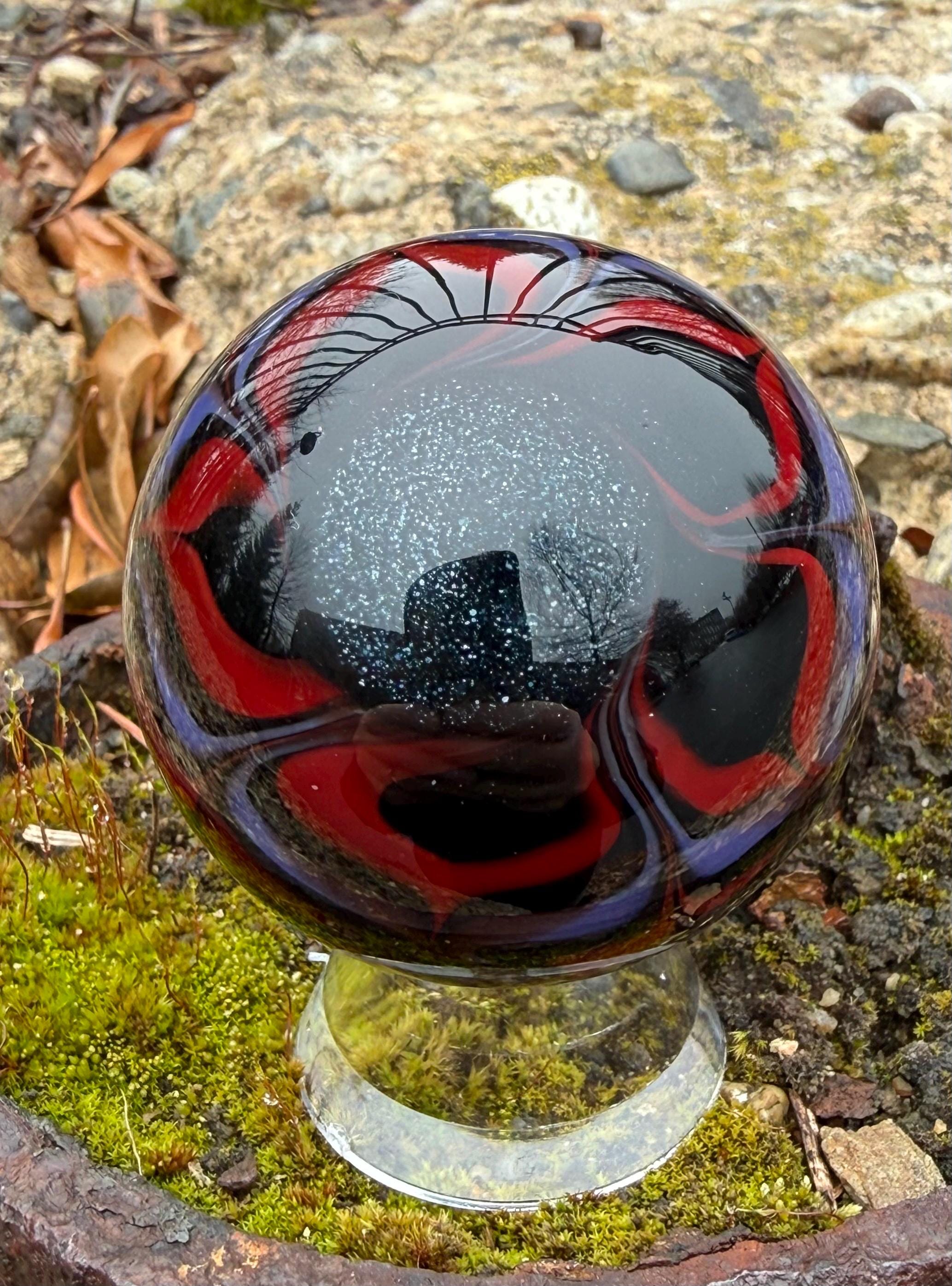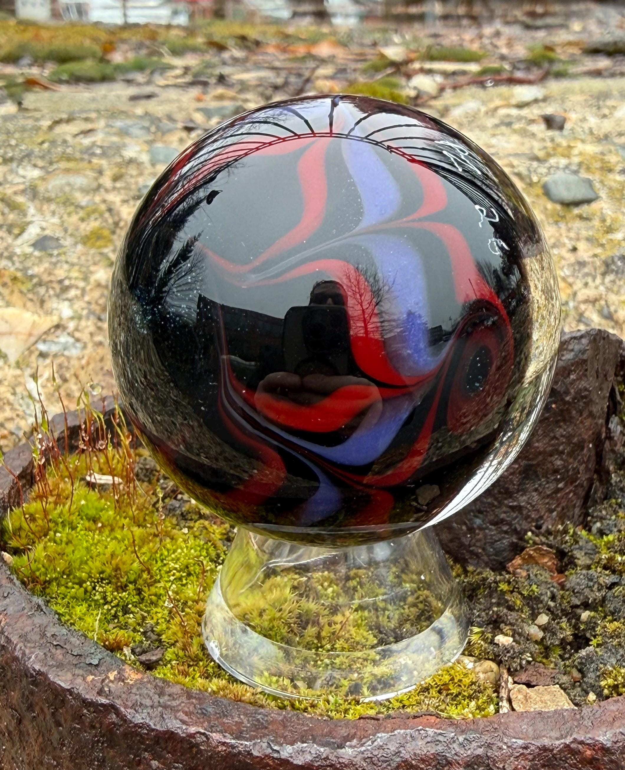 1.92 inch borosilicate glass marble. Purple and Red dichroic and galaxy black in a vortex design with a large opal in center. Backed with Jet Black with a purple and red feather pattern. Comes with display stand