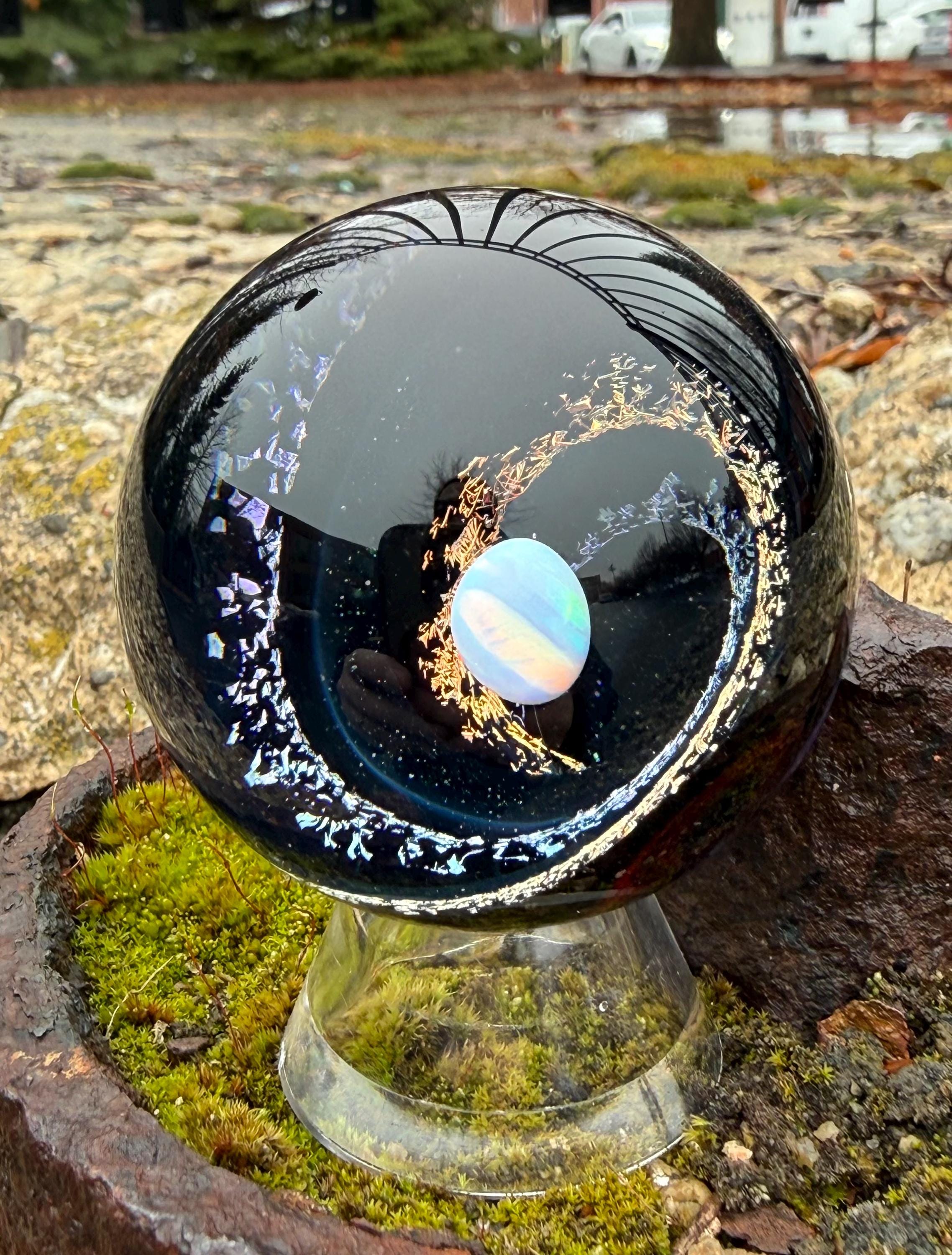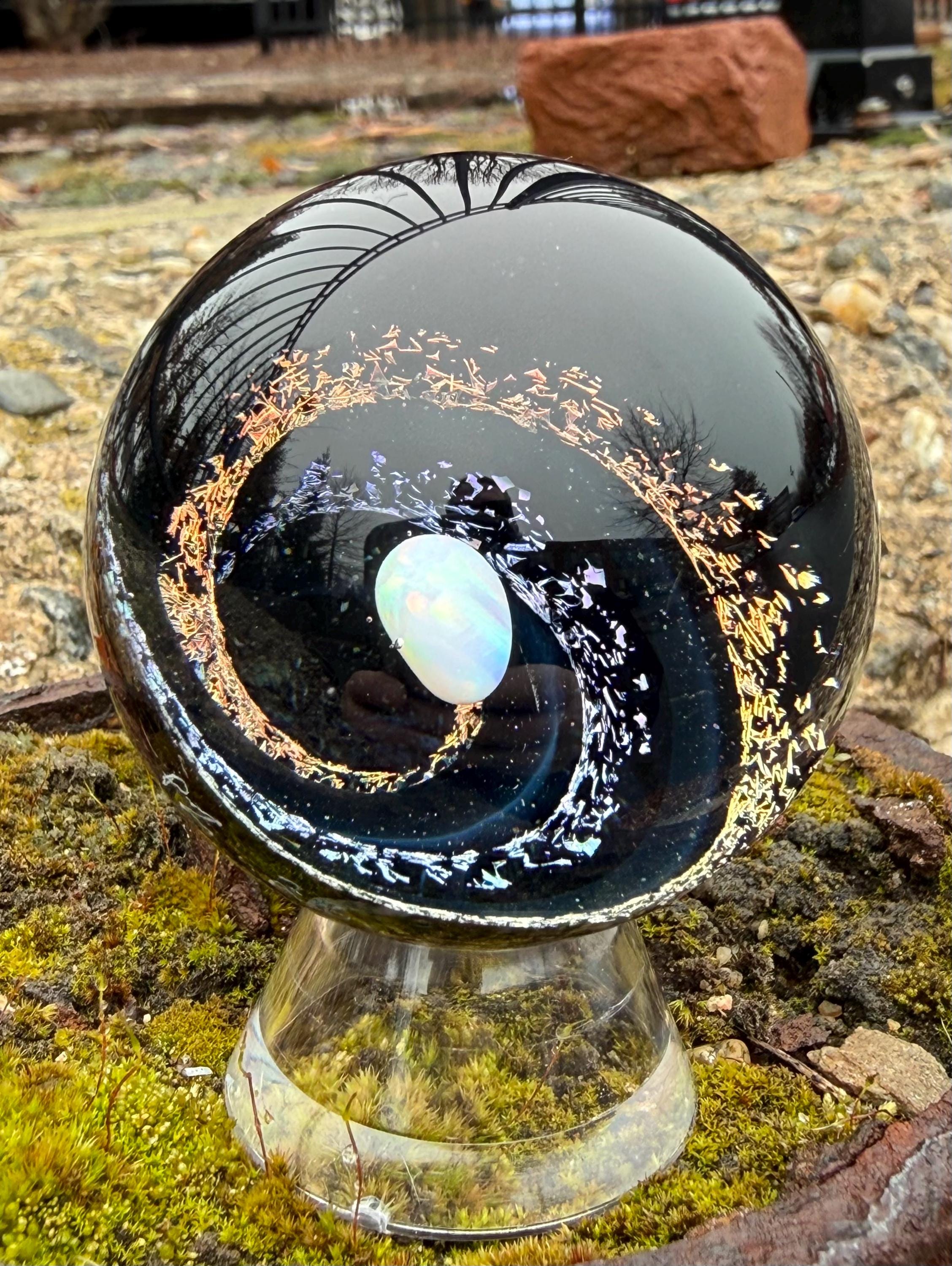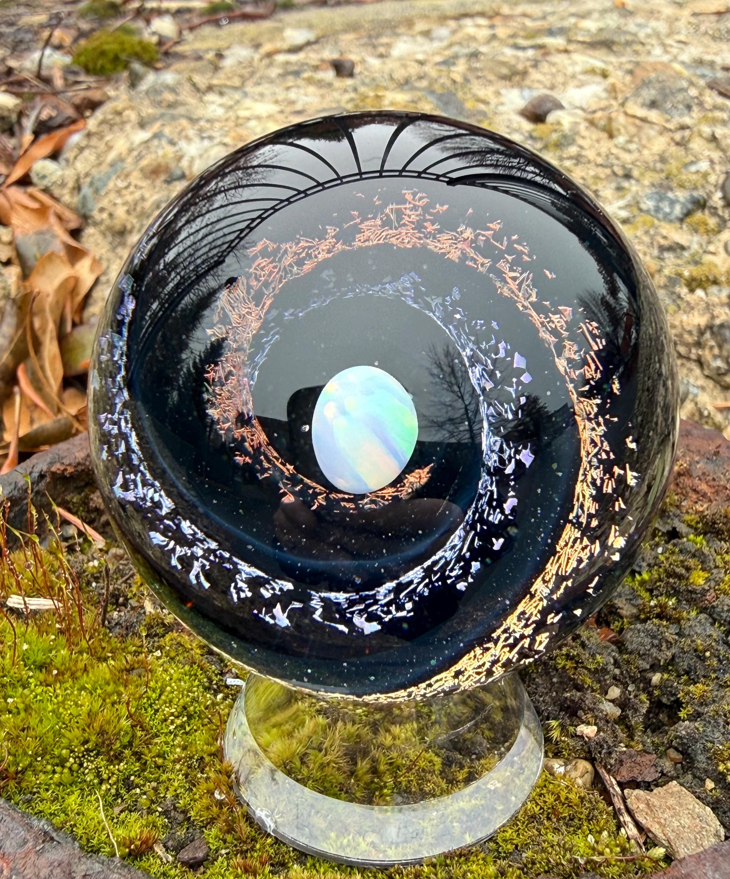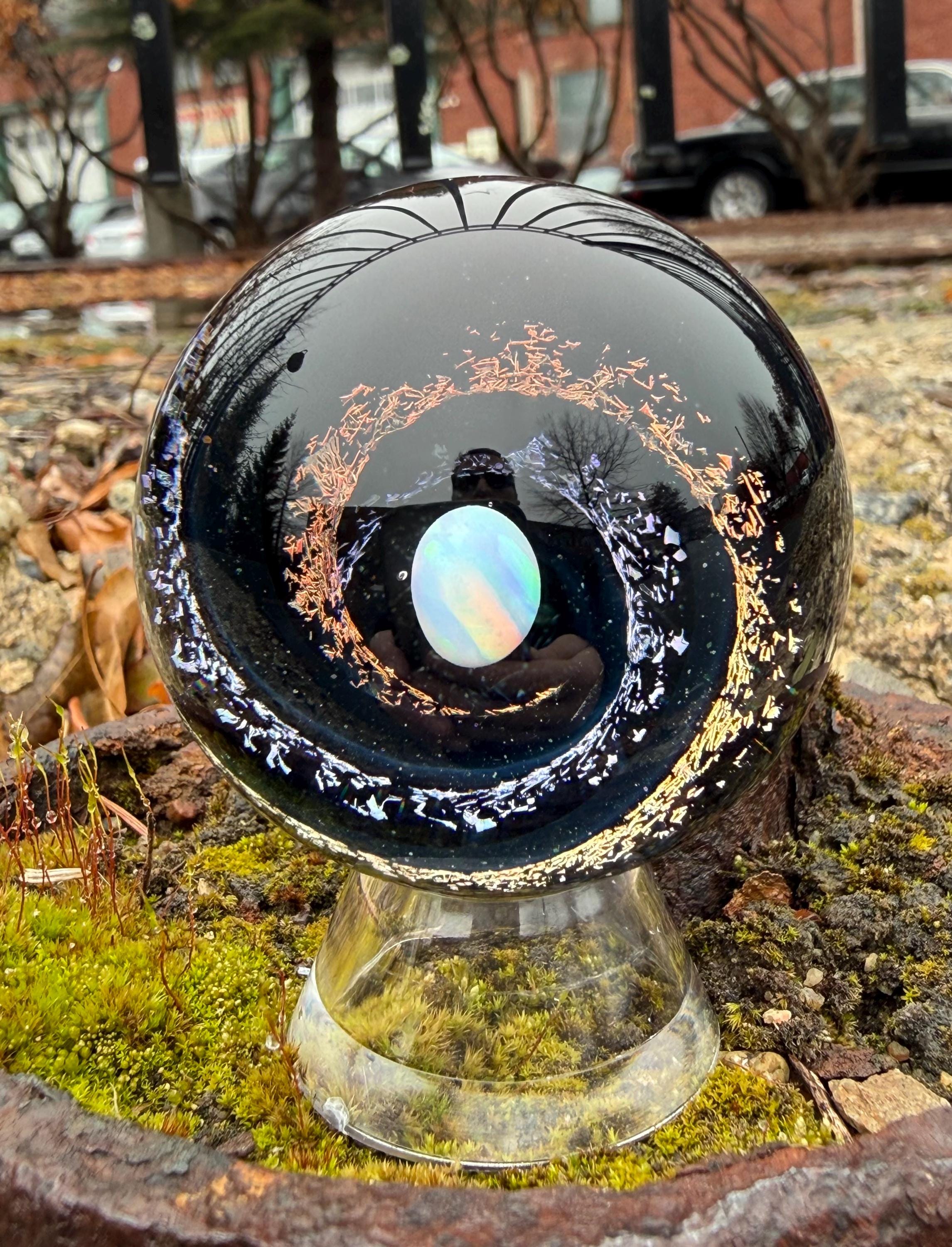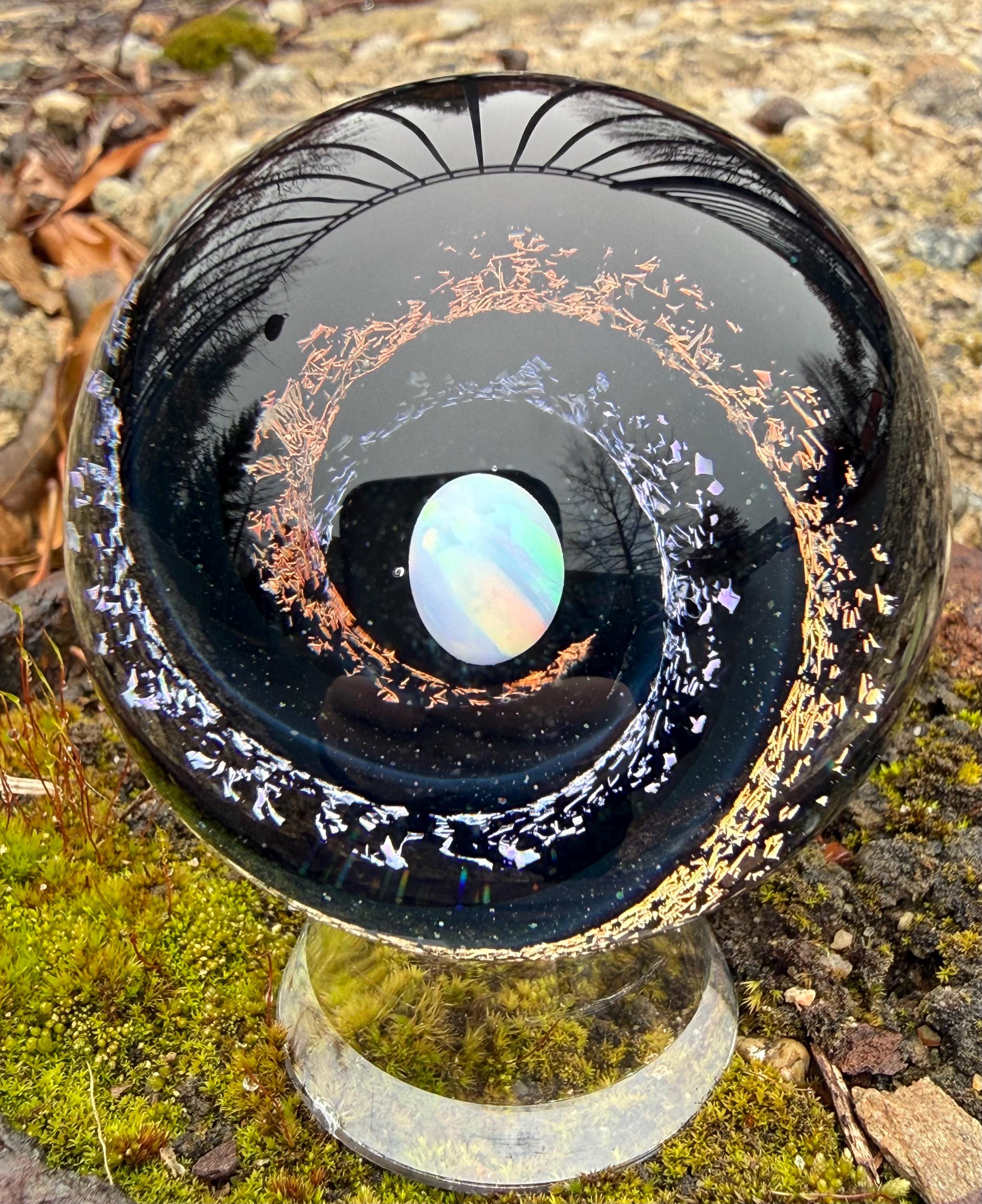 1.92 inch borosilicate glass marble. Purple and Red dichroic and galaxy black in a vortex design with a large opal in center. Backed with Jet Black with a purple and red feather pattern. Comes with display stand