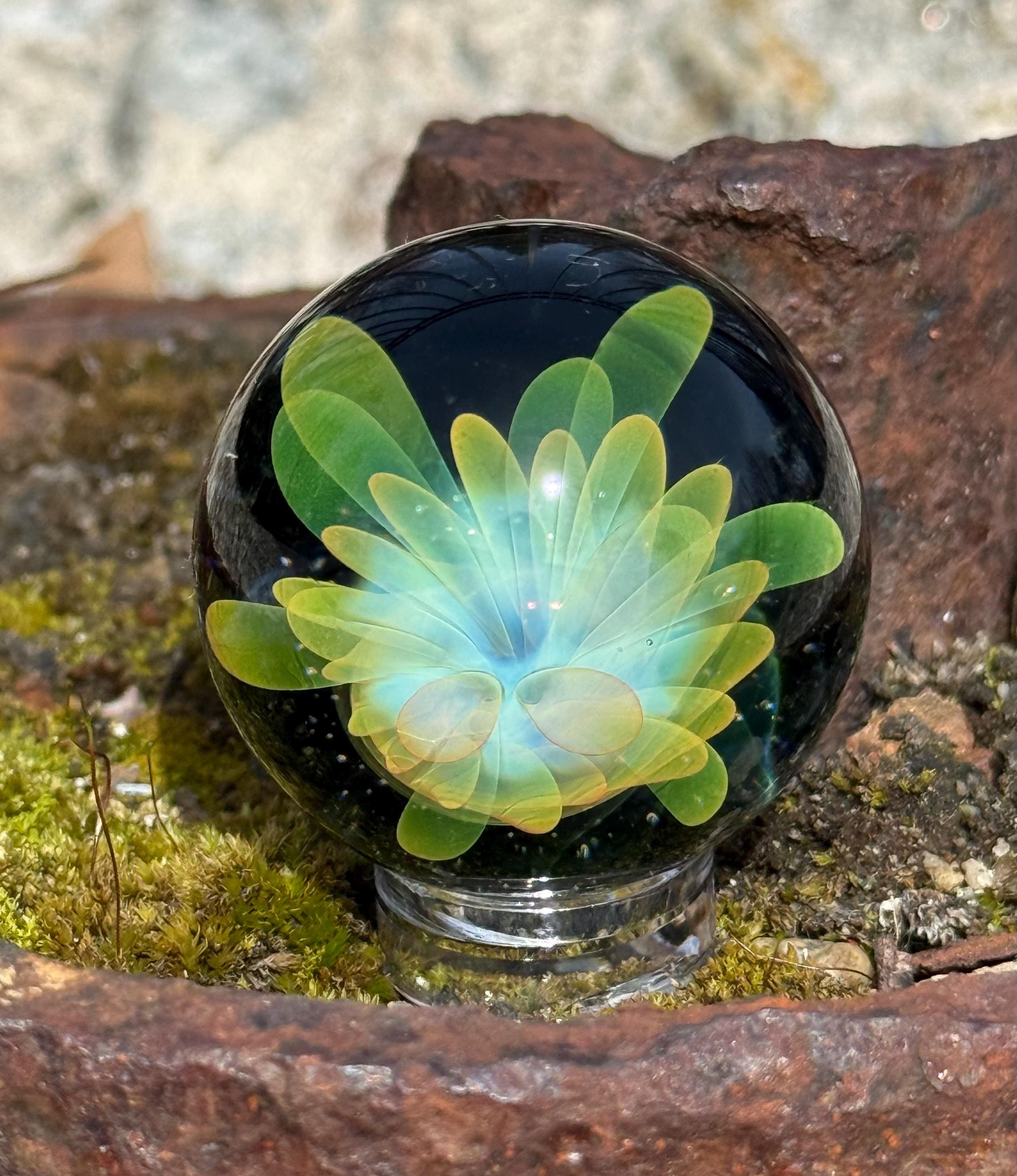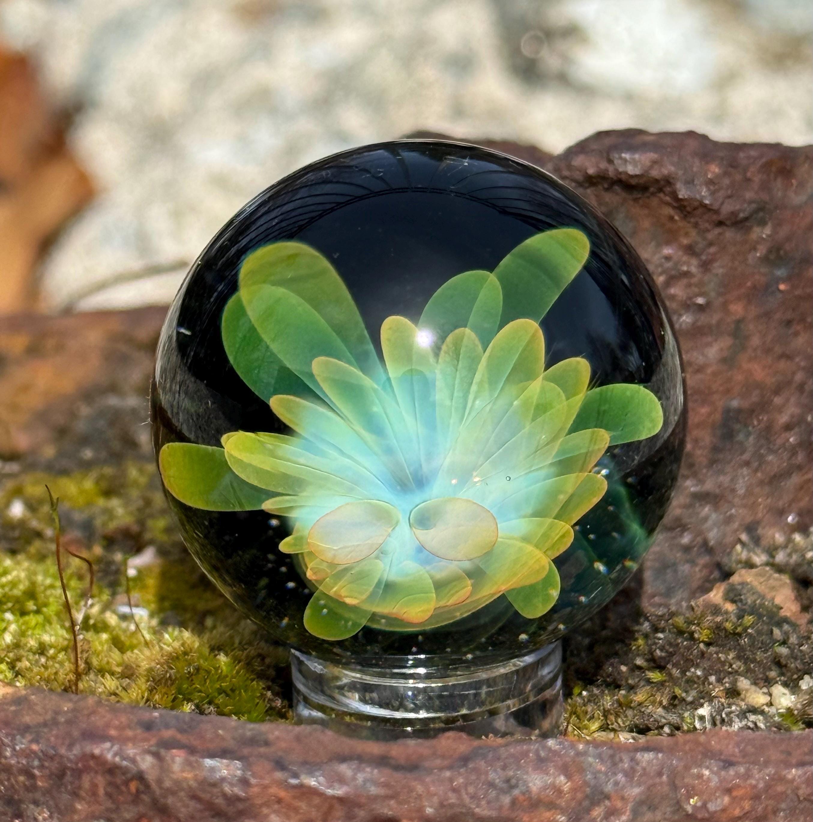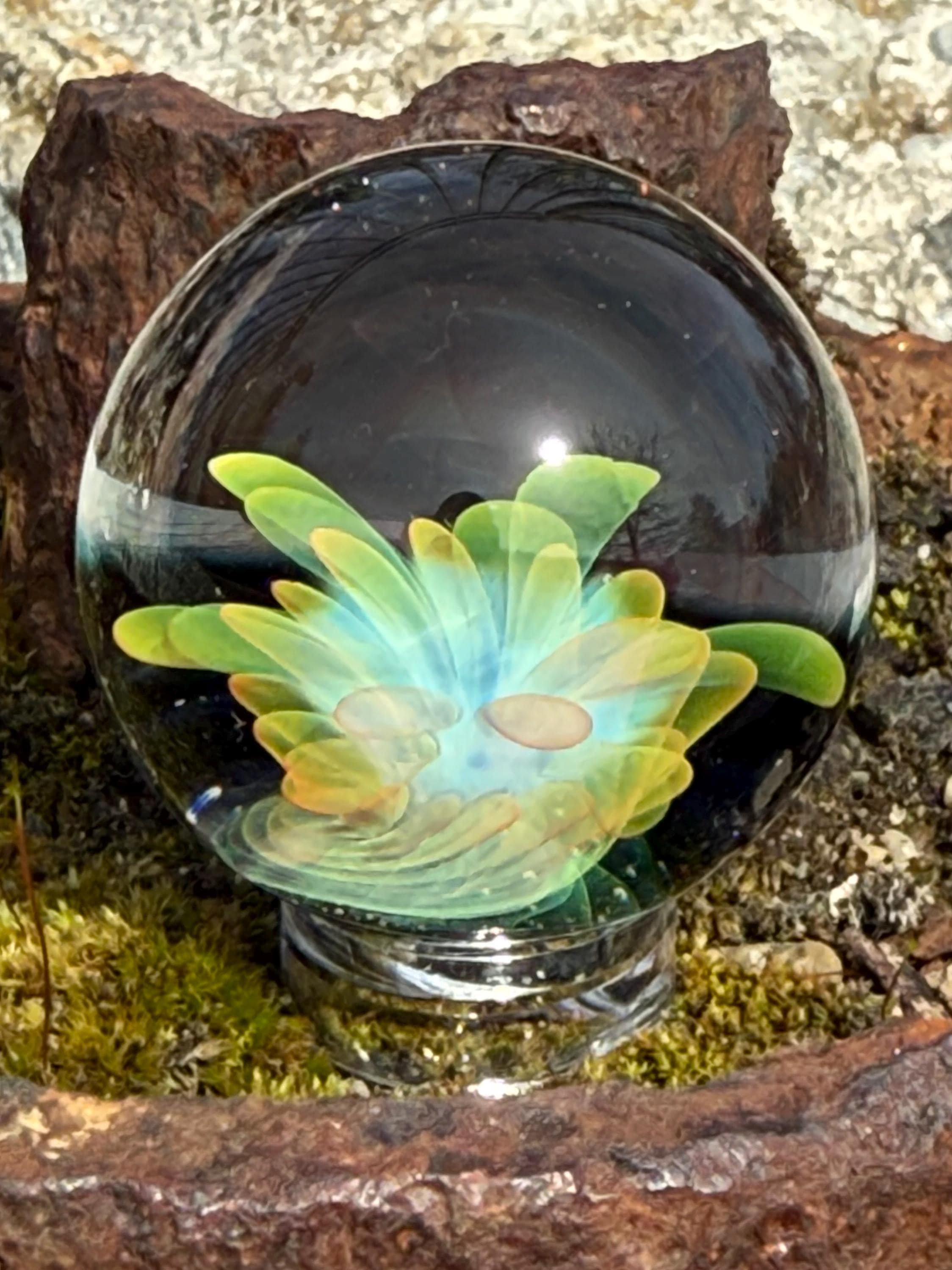 1.23 inch borosilicate glass marble. 24K gold and .99 fine silver fume in an implosion flower design. Backed with Galaxy Black. Comes with display stand
