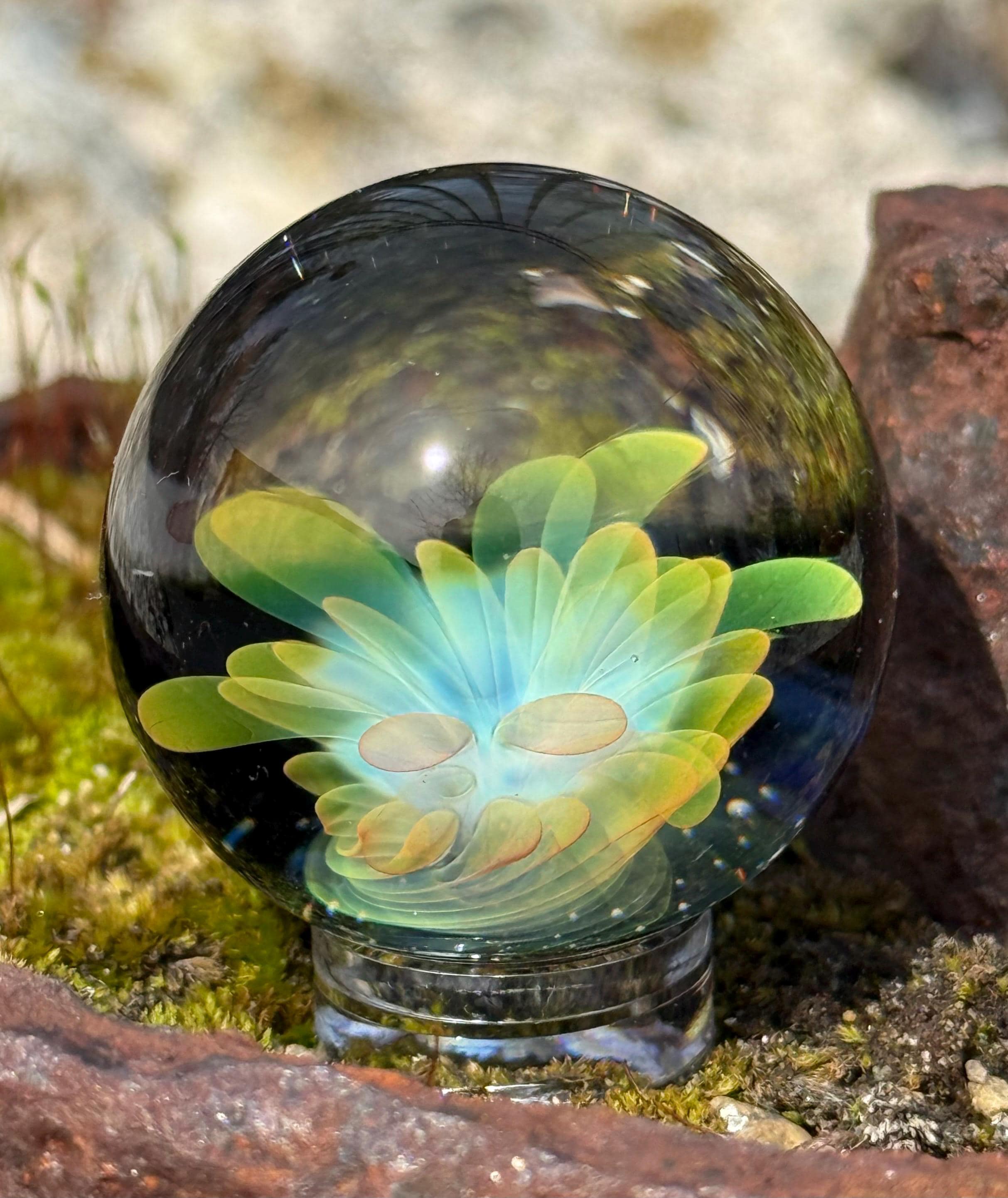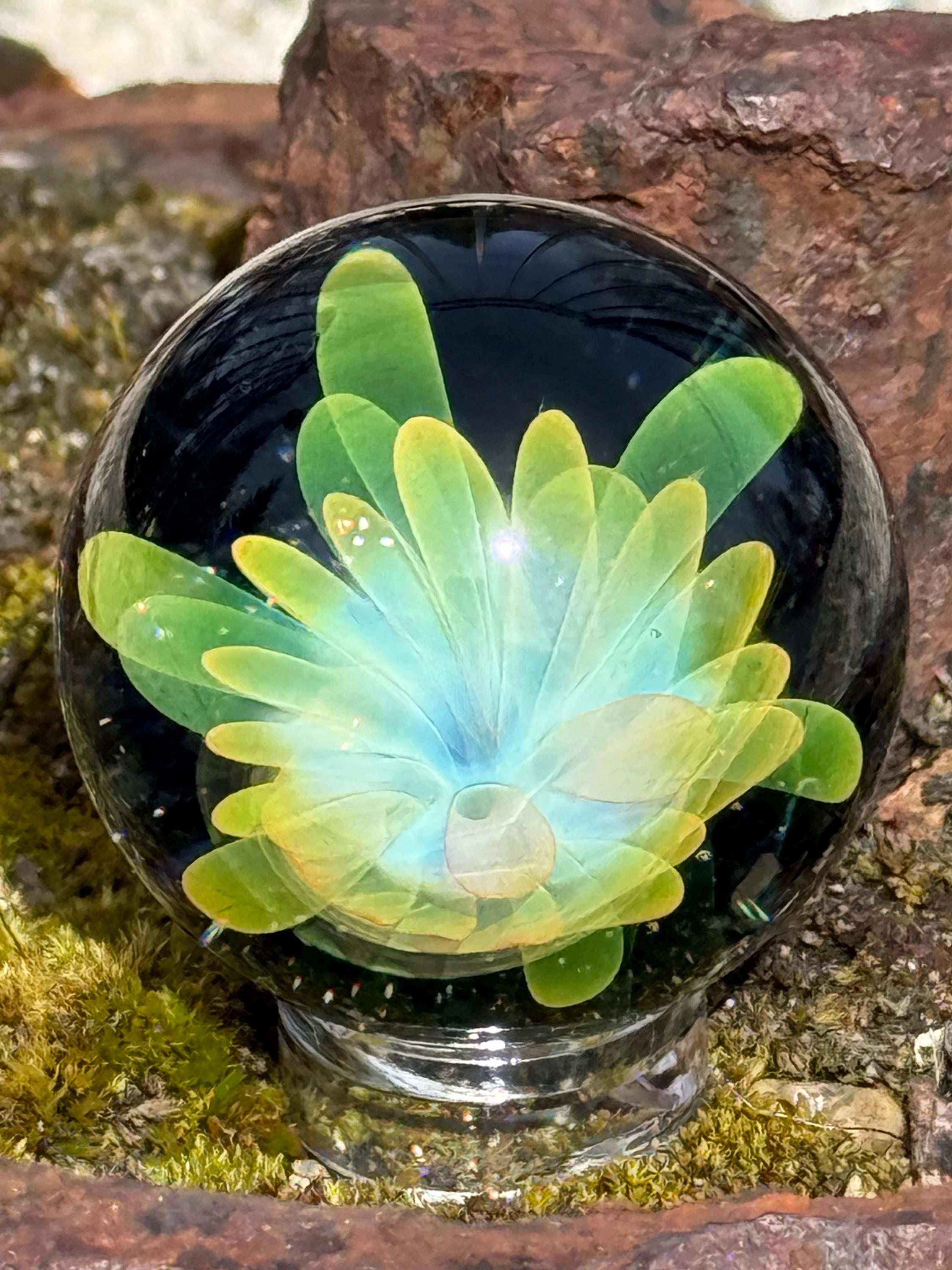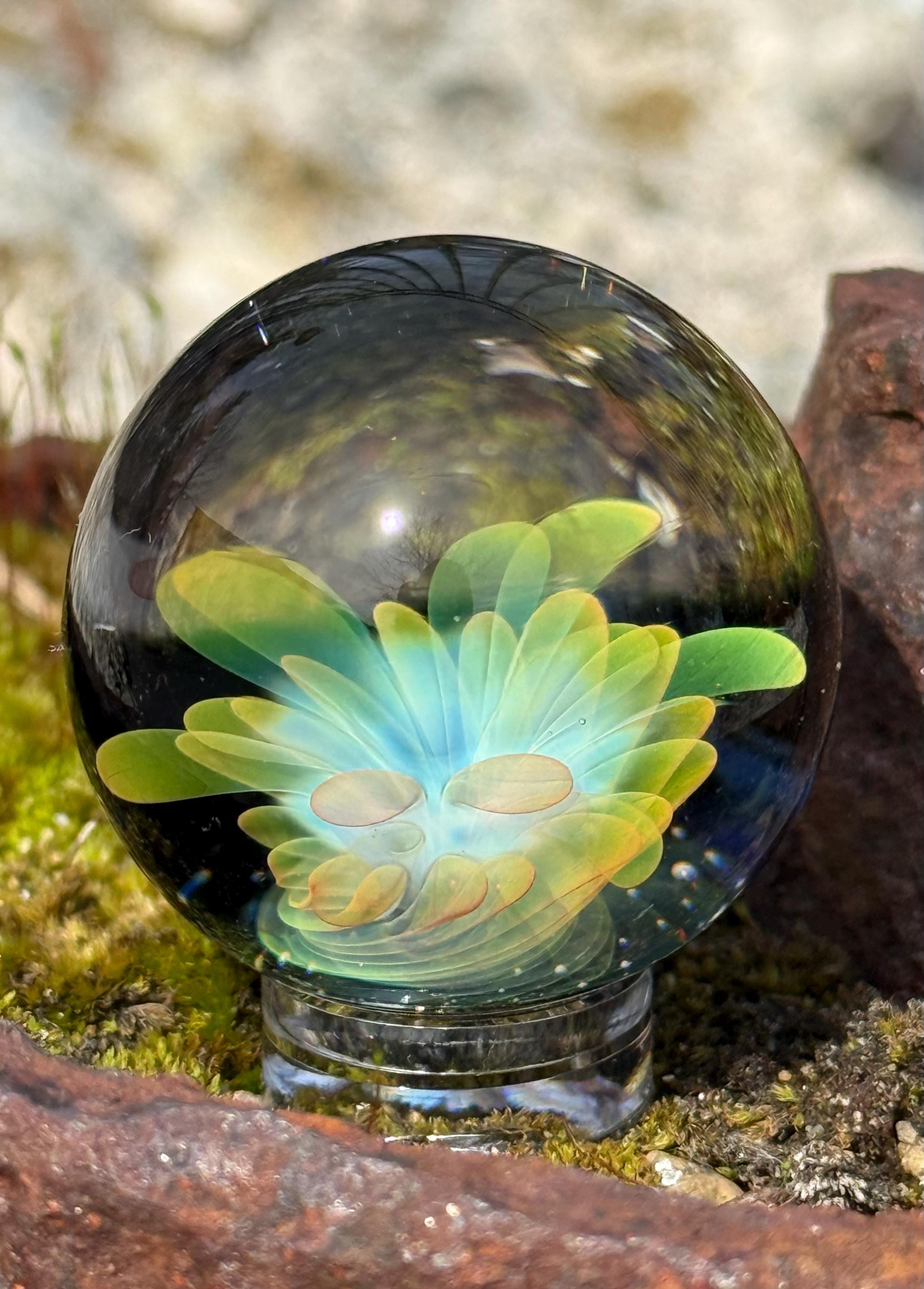 1.23 inch borosilicate glass marble. 24K gold and .99 fine silver fume in an implosion flower design. Backed with Galaxy Black. Comes with display stand