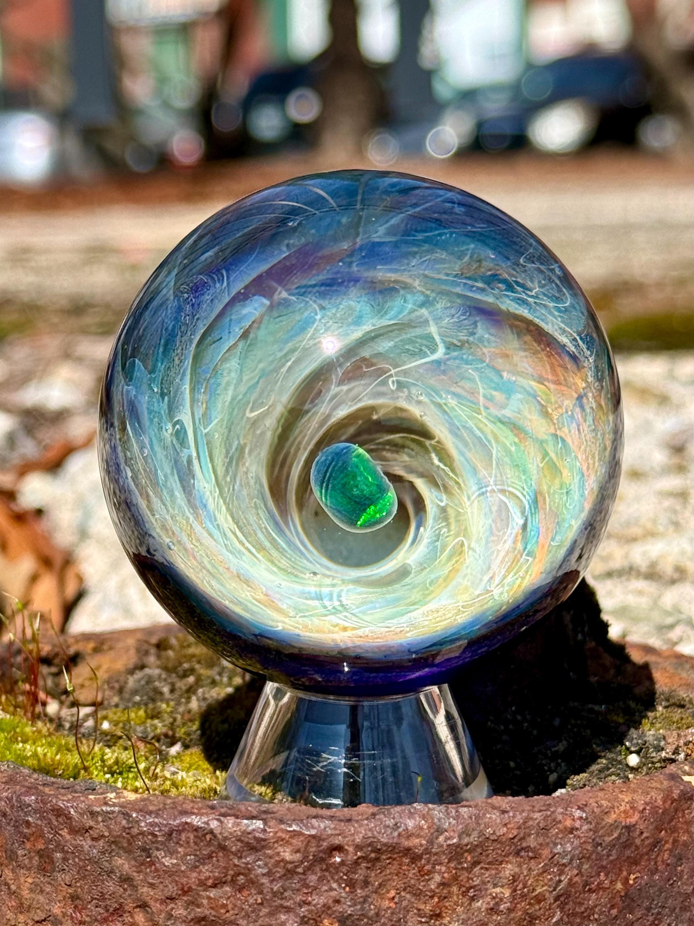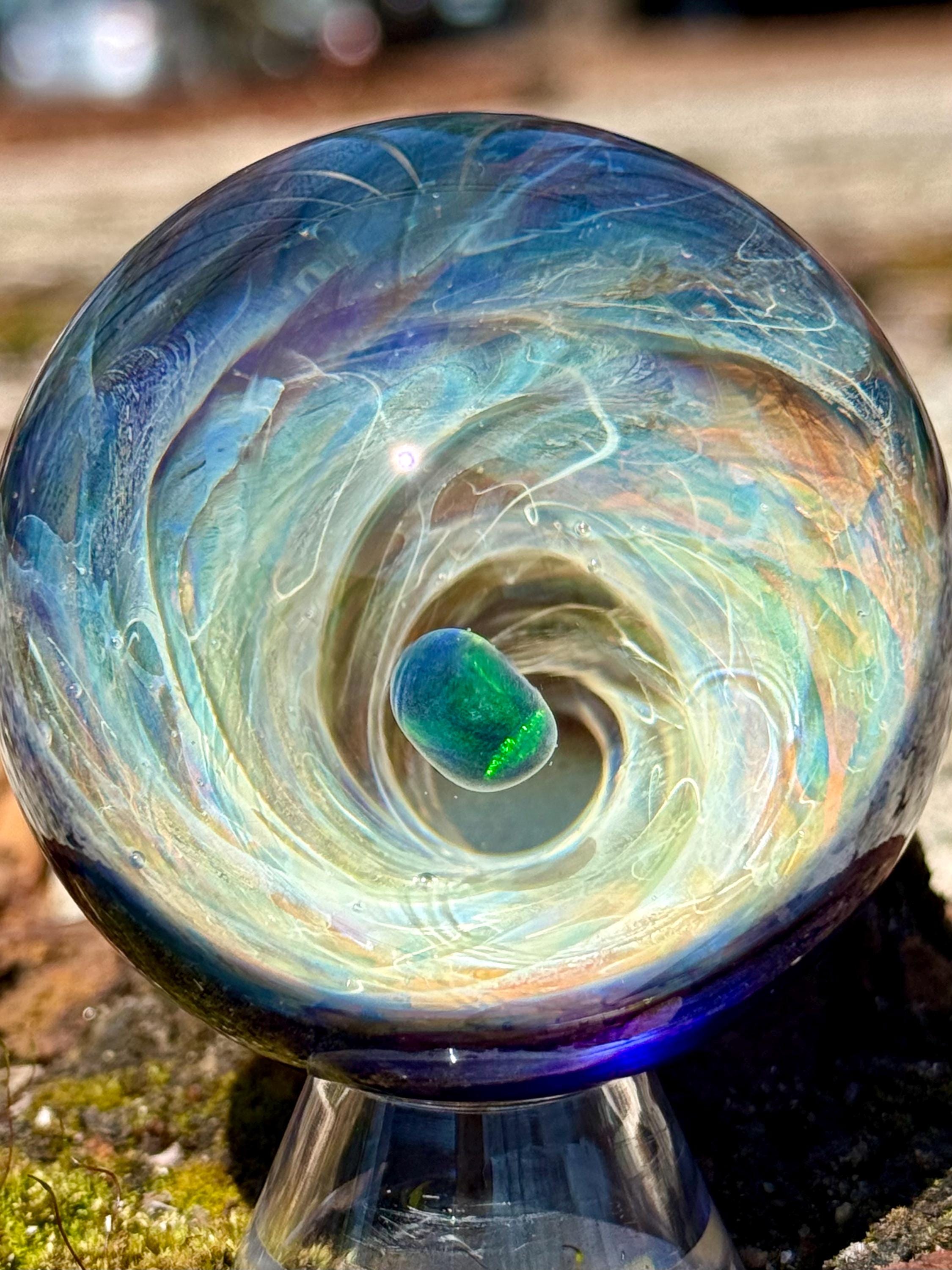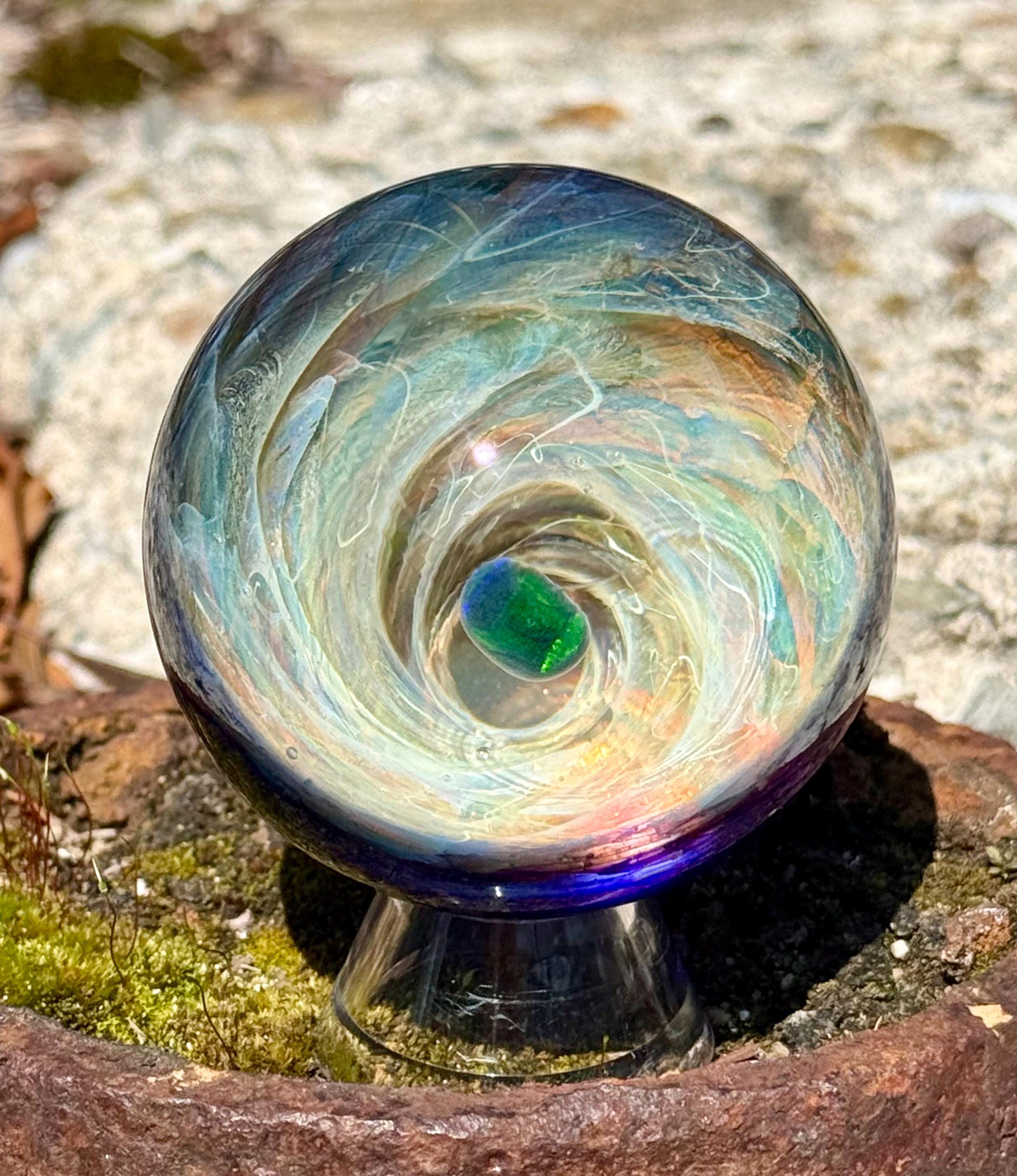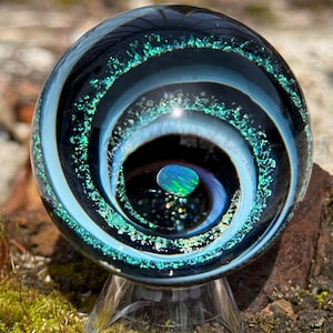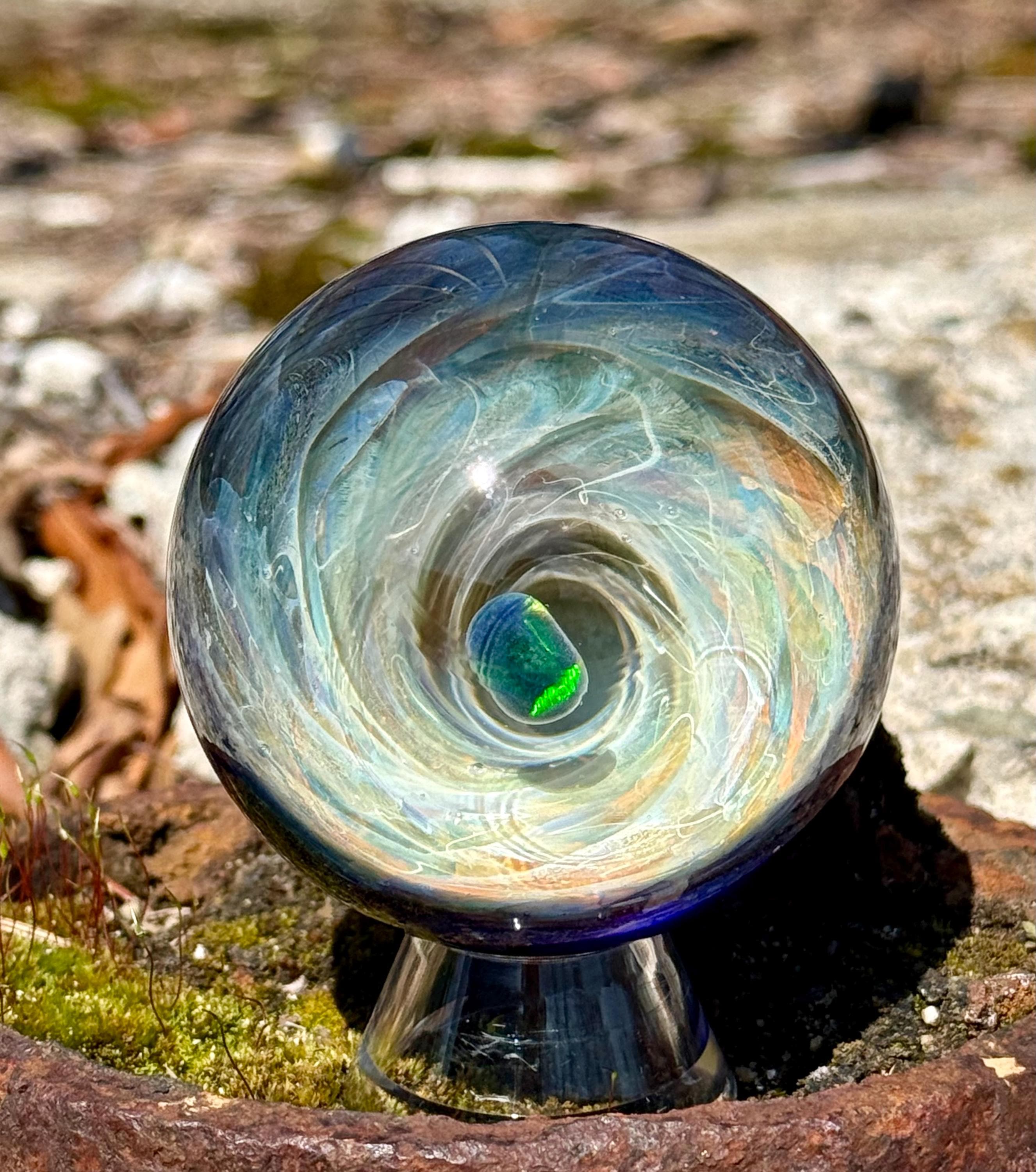 2.27 inch borosilicate glass marble. 24K gold and .99 fine silver fume in a vortex design with a large opal in center. Backed with cobalt blue with a silver fume squiggle pattern. Comes with display stand