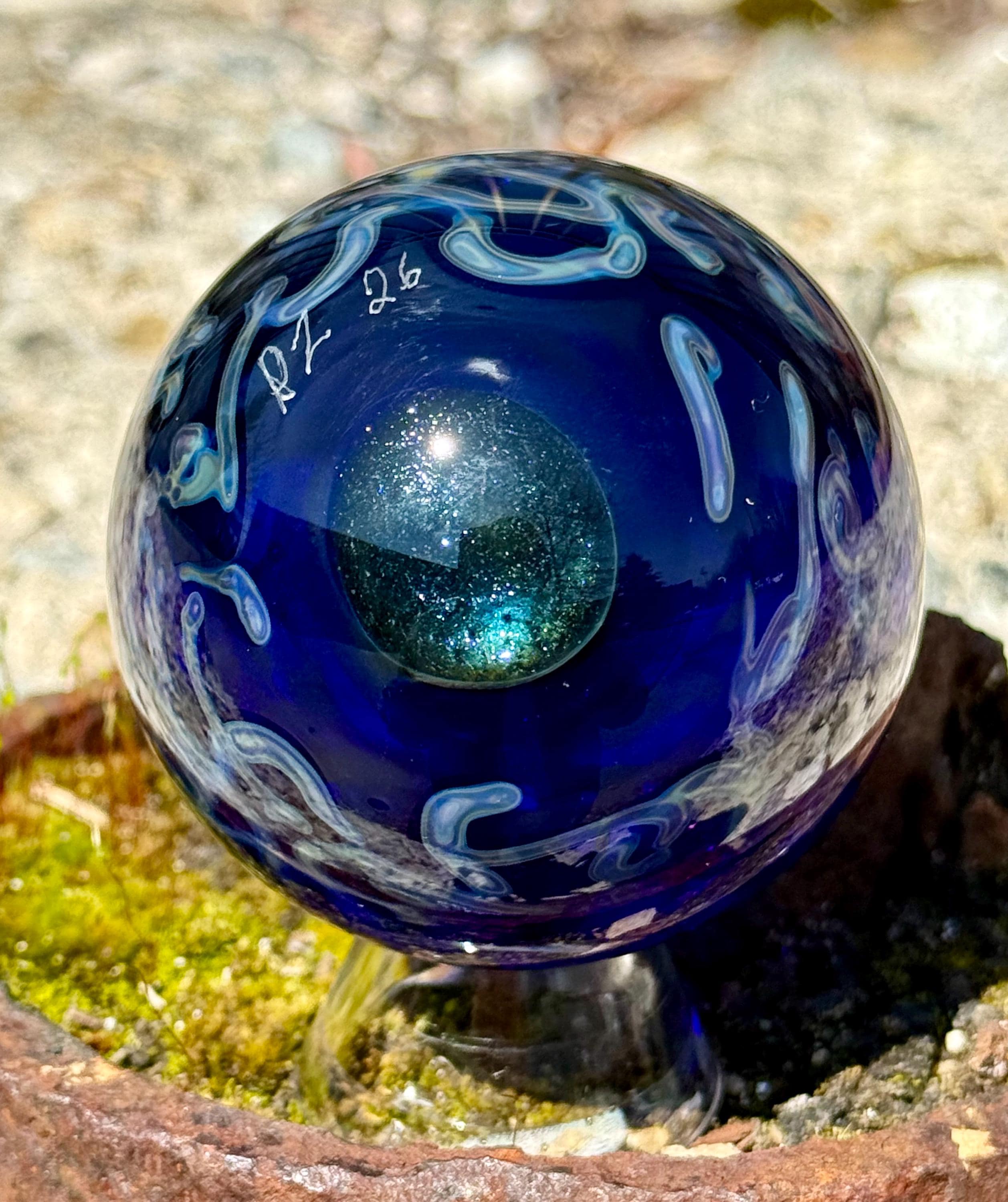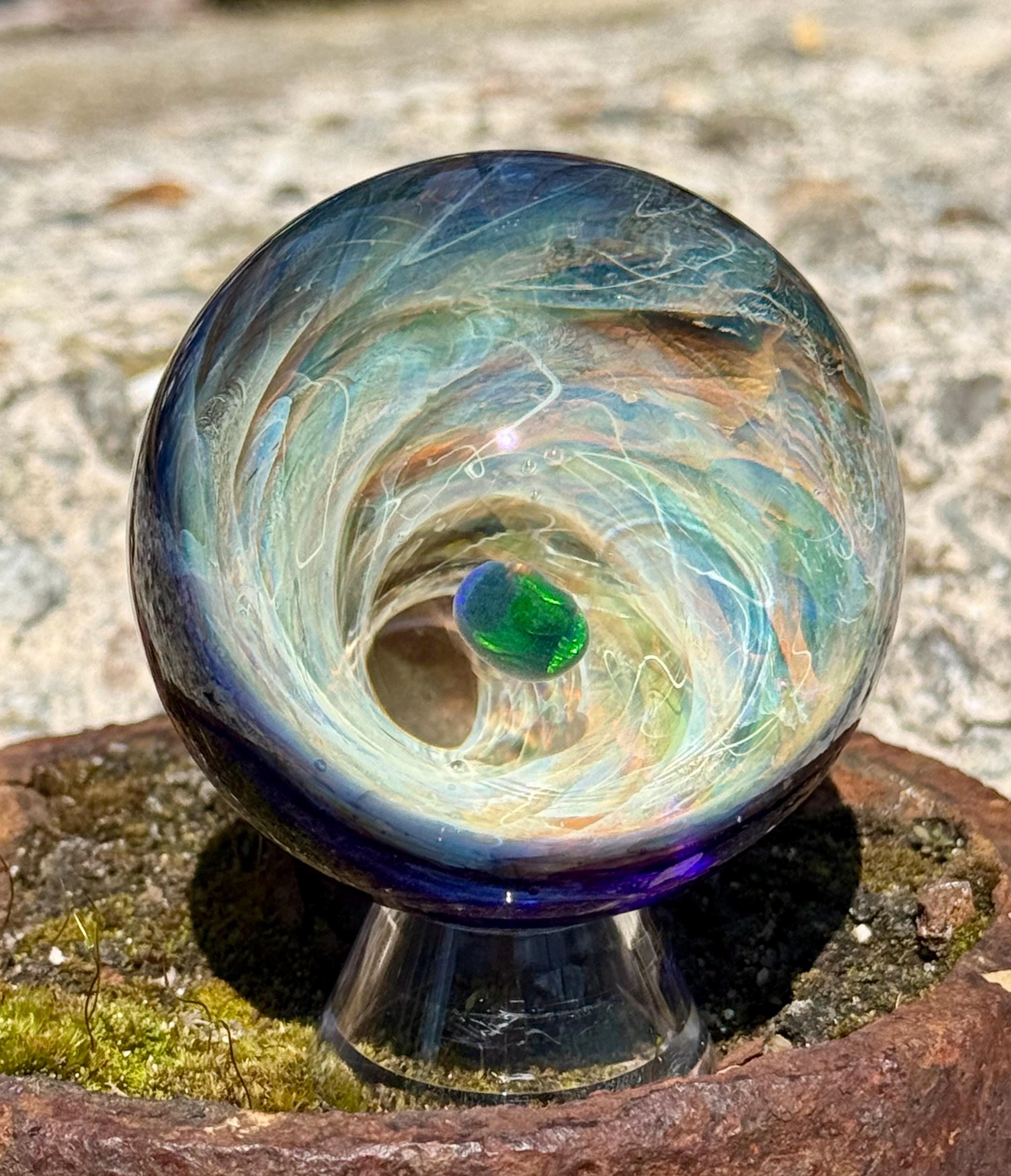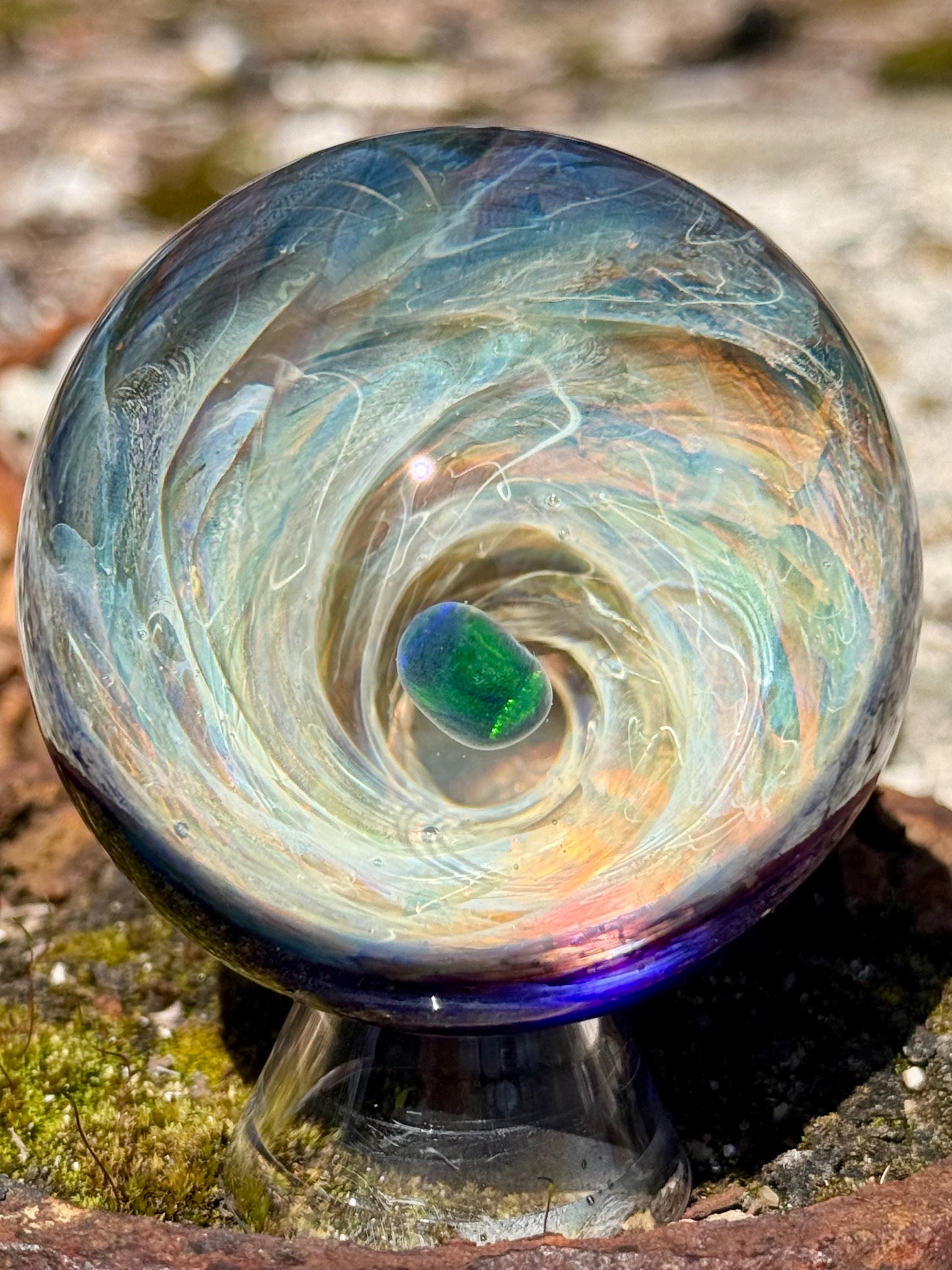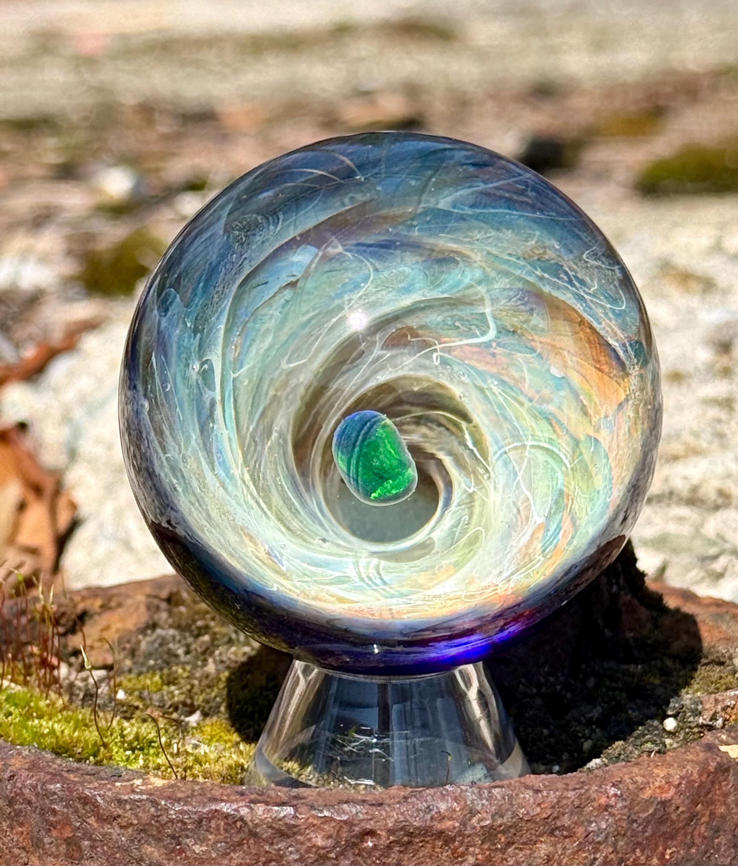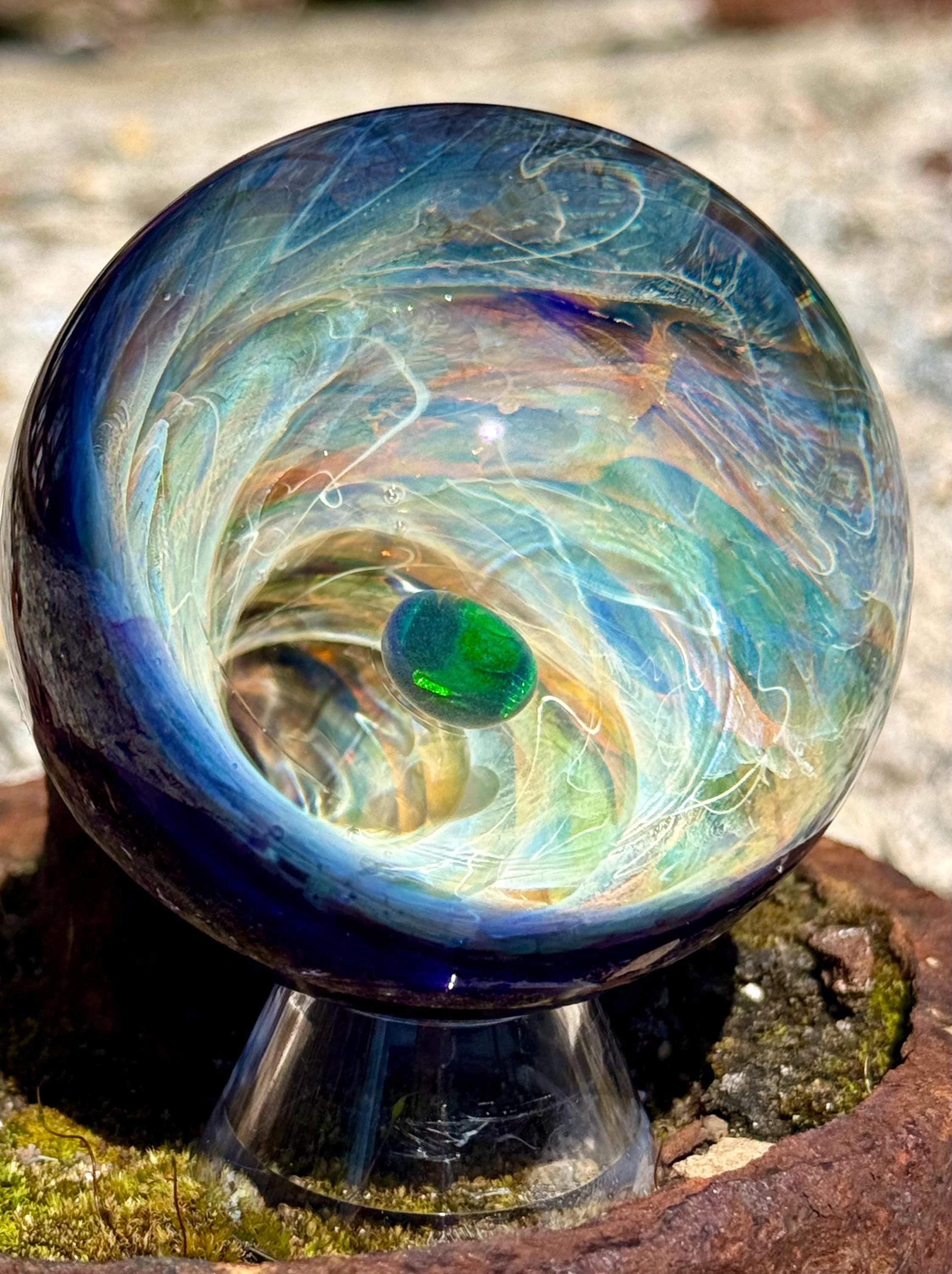 2.27 inch borosilicate glass marble. 24K gold and .99 fine silver fume in a vortex design with a large opal in center. Backed with cobalt blue with a silver fume squiggle pattern. Comes with display stand