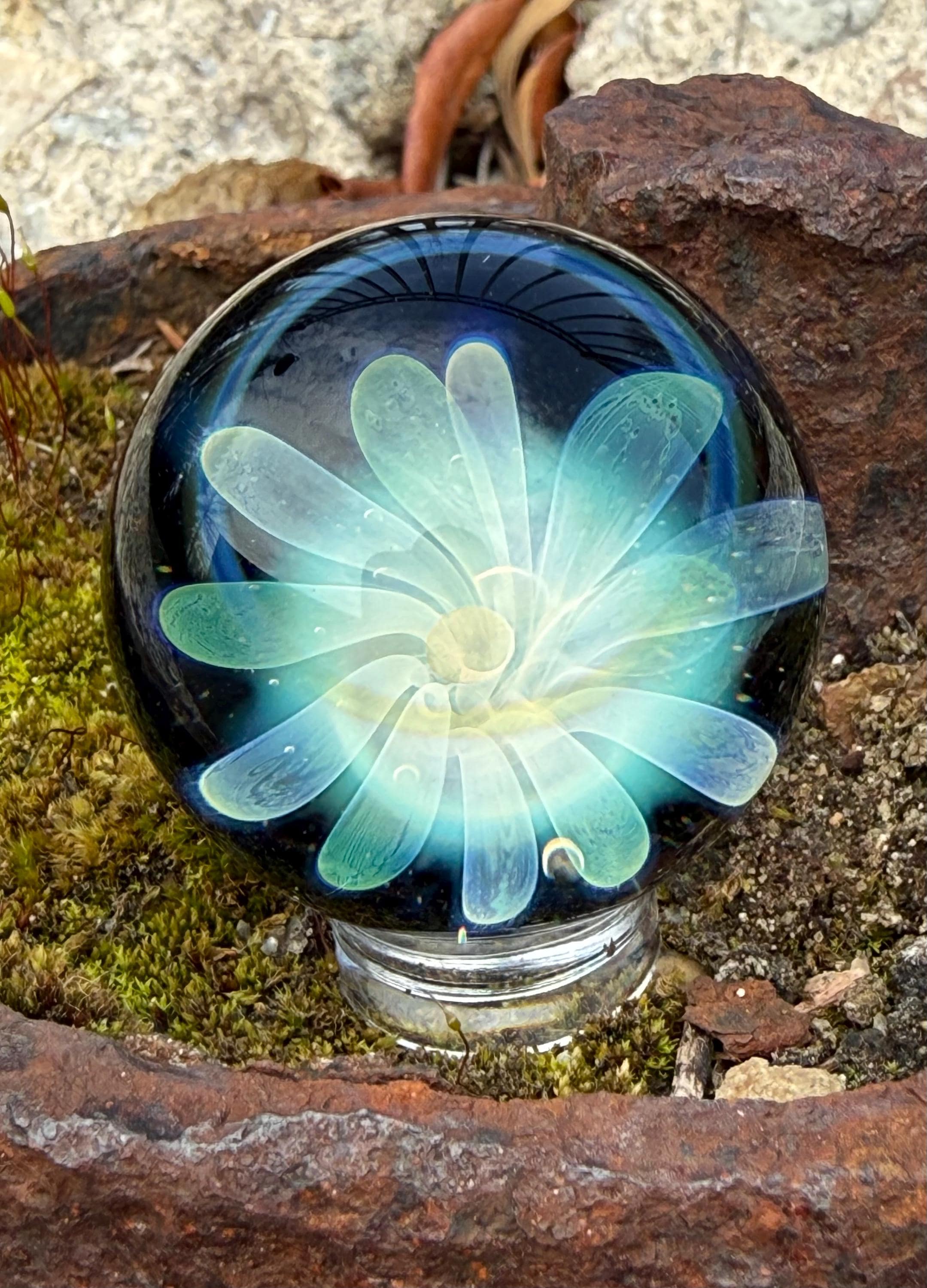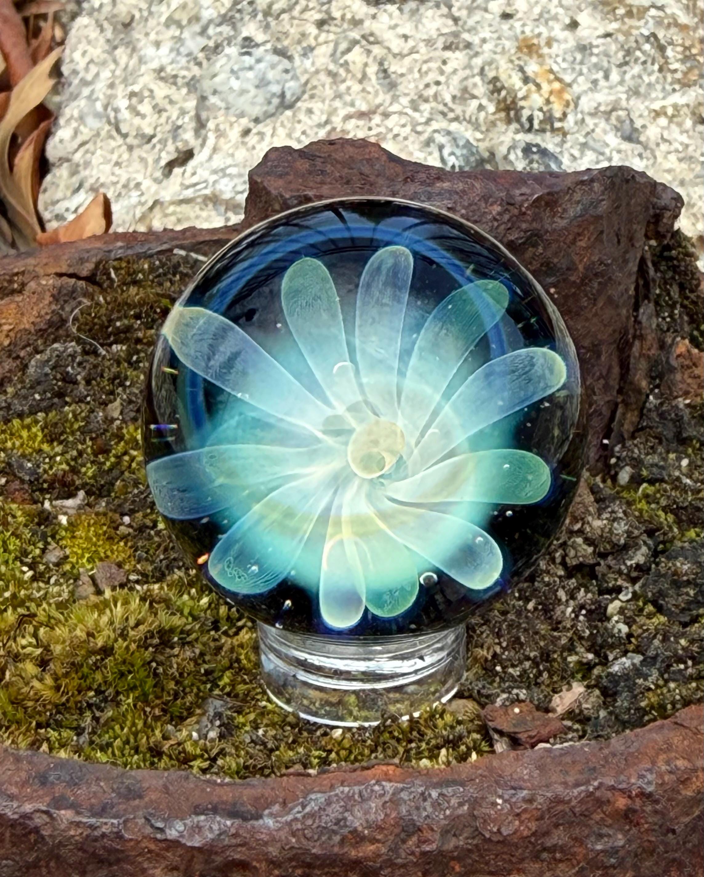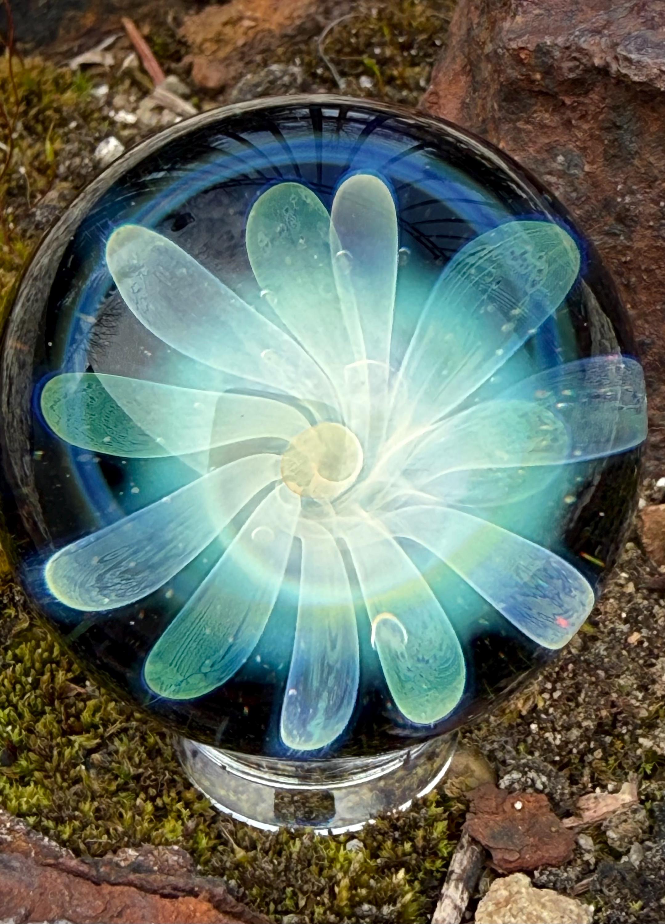 1.28 inch/33 mm Boroscilicate glass marble. 25K gold and .99 fine silver fume in an implosion flower design. Backed in Galaxy Black and jet black. Comes with display stand