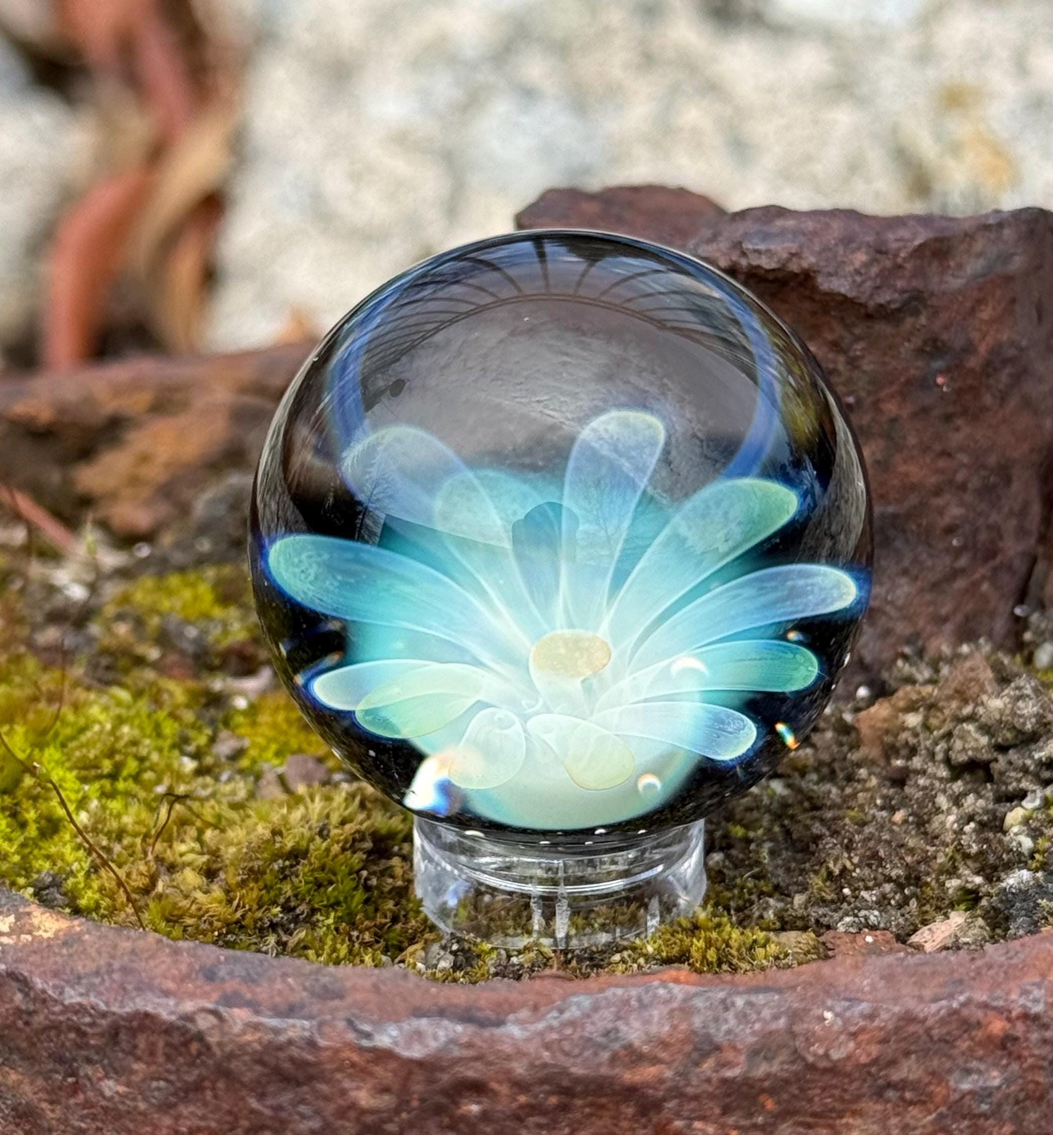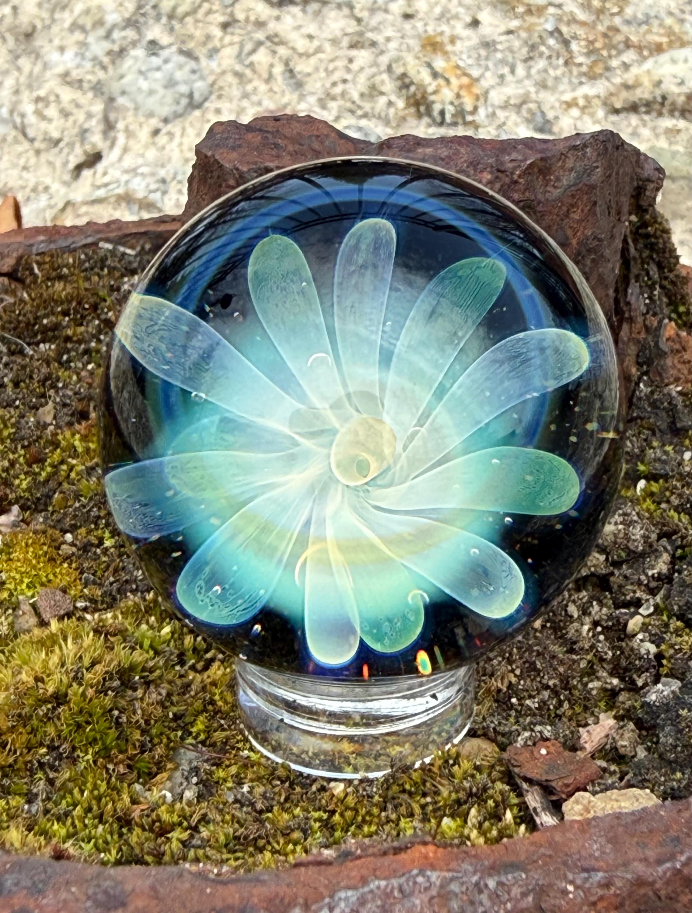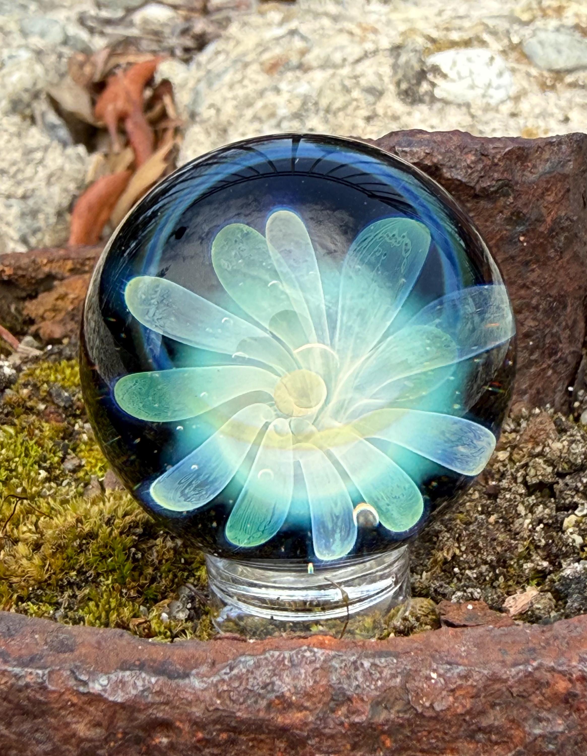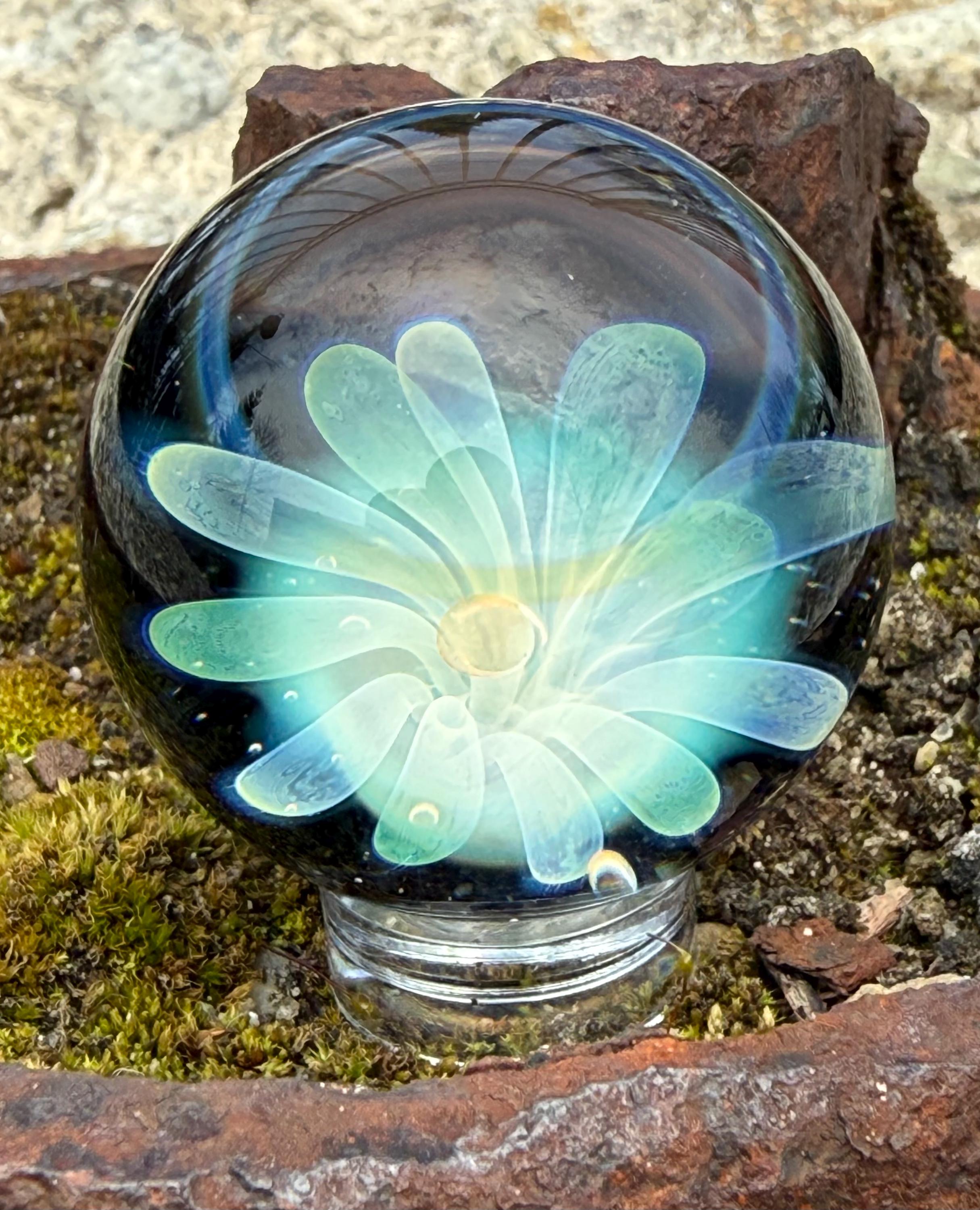 1.28 inch/33 mm Boroscilicate glass marble. 25K gold and .99 fine silver fume in an implosion flower design. Backed in Galaxy Black and jet black. Comes with display stand
