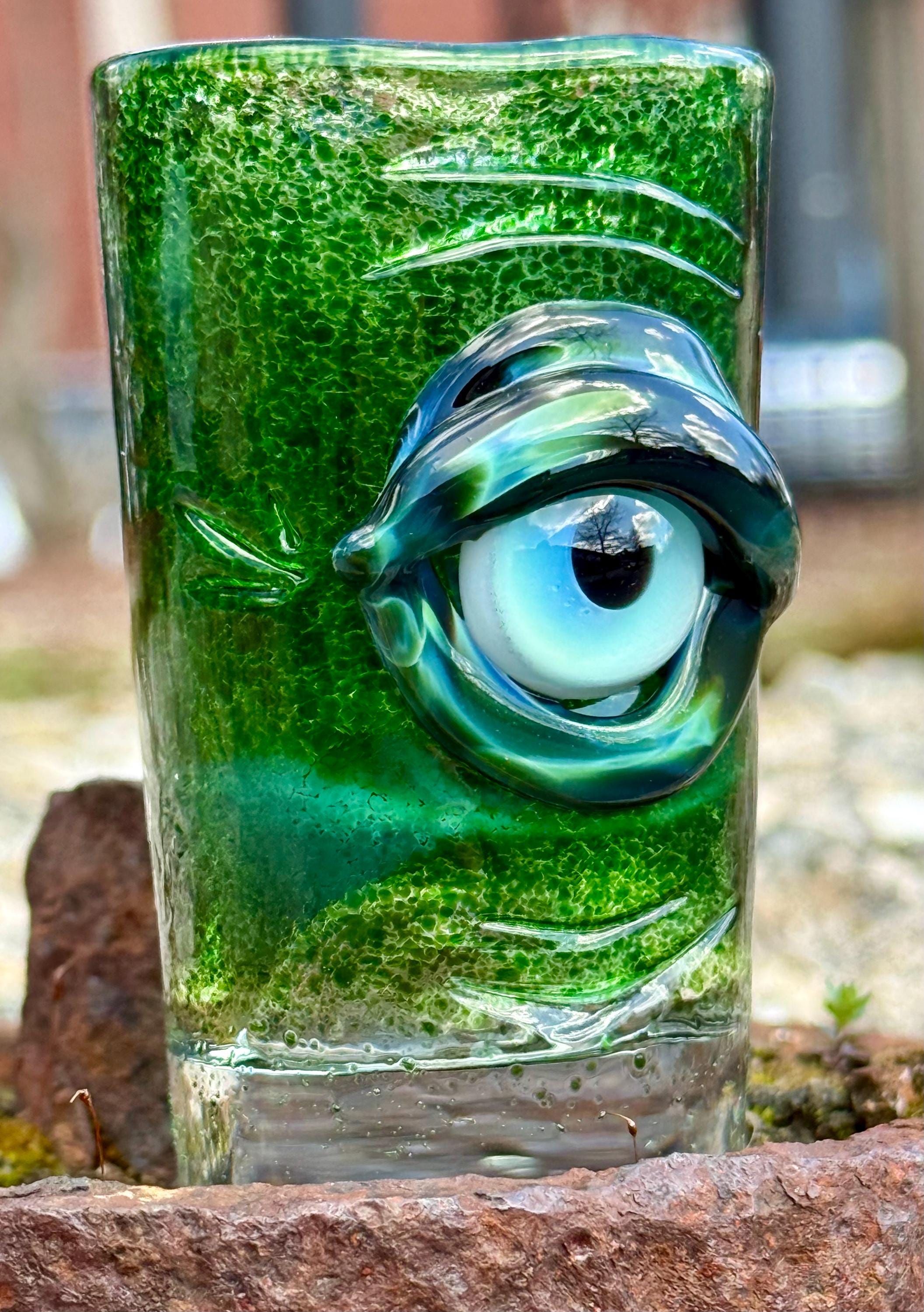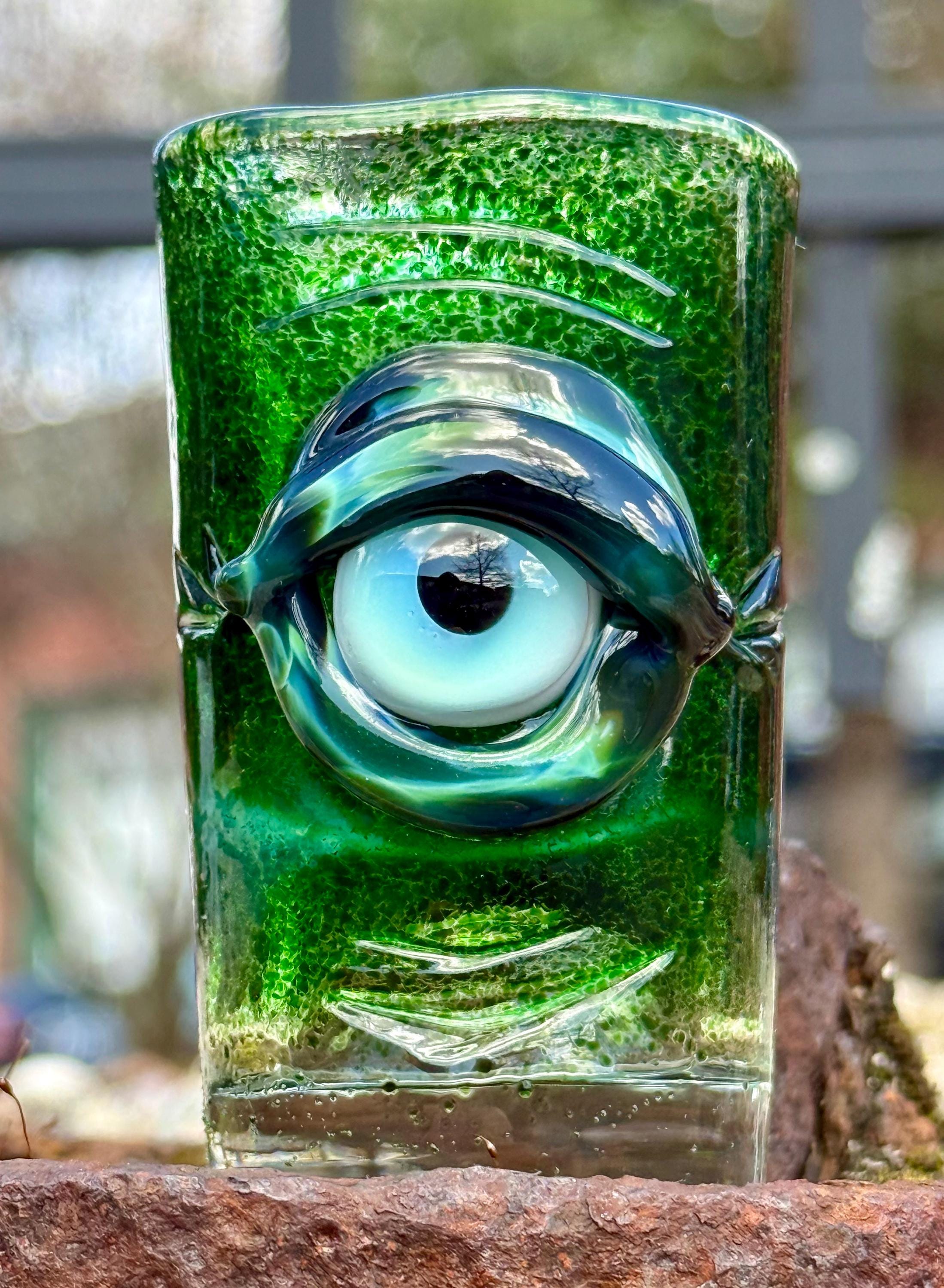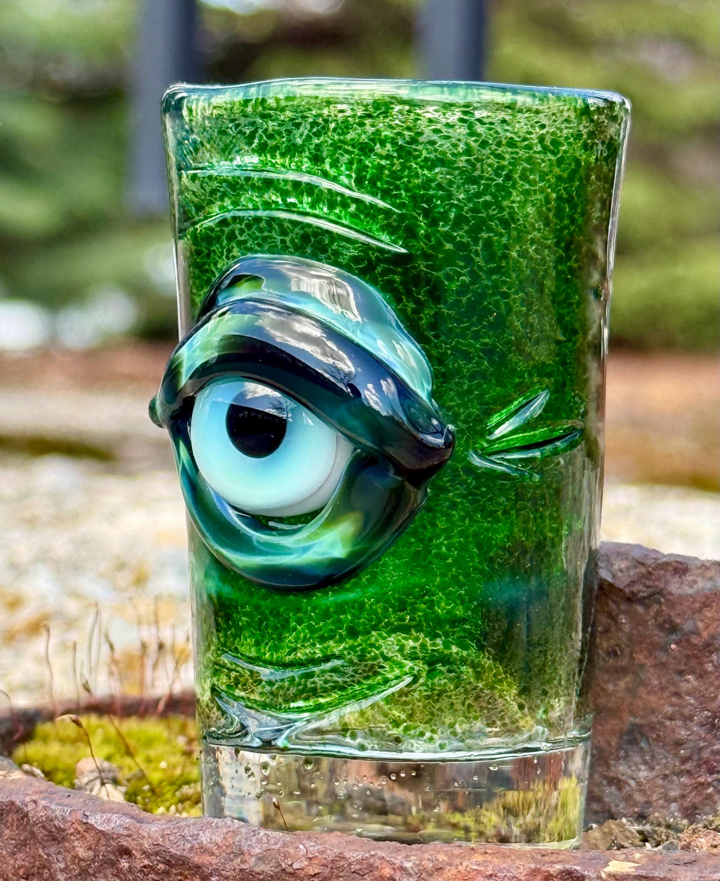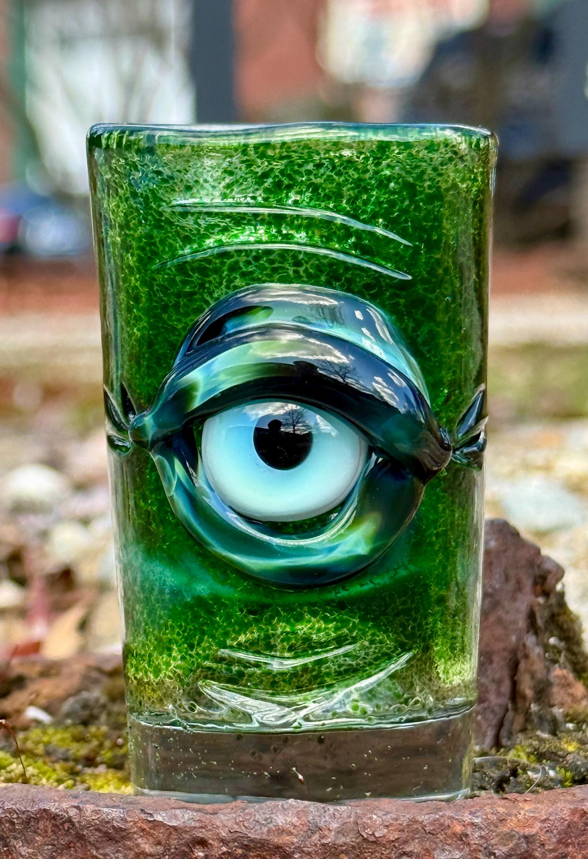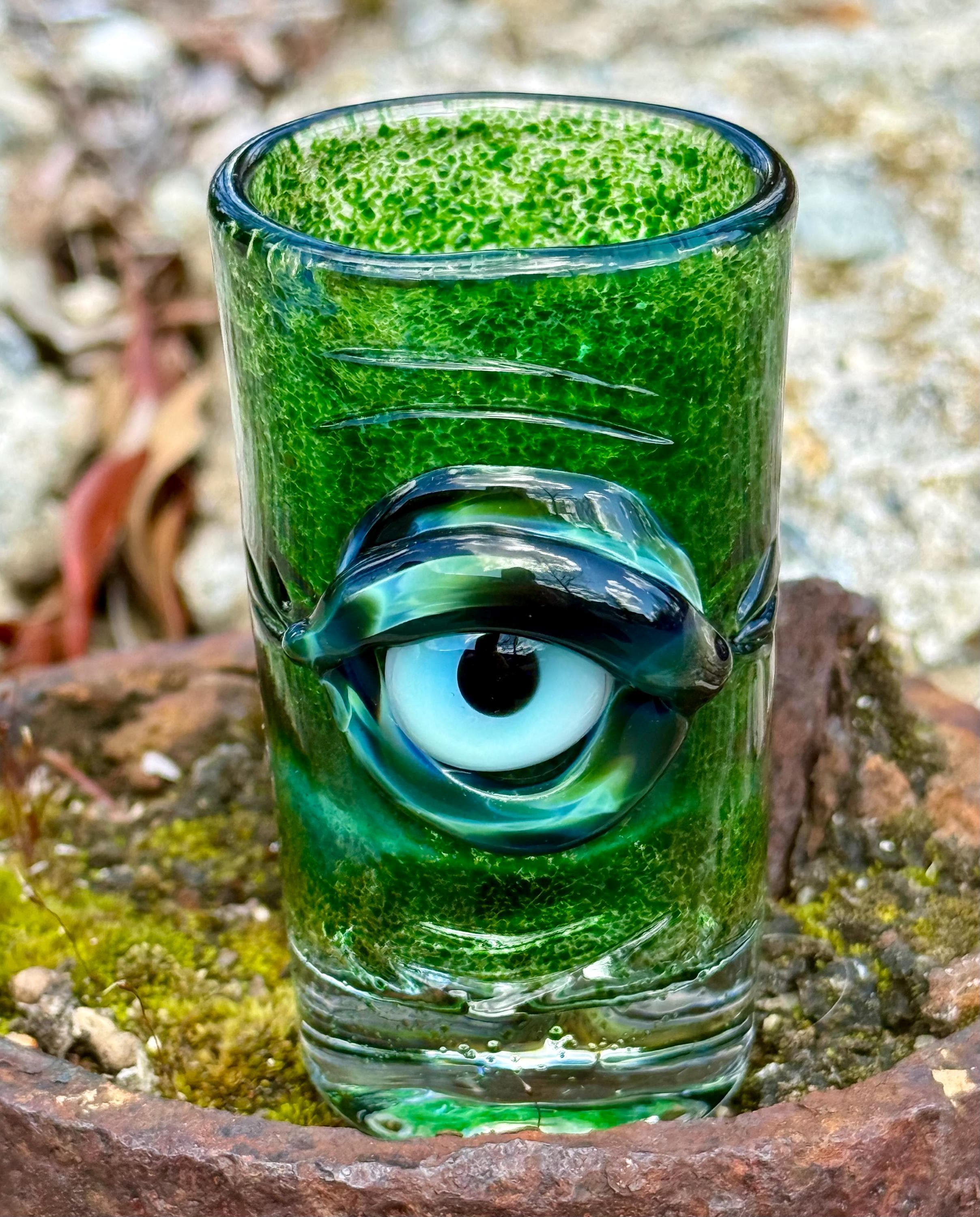 2.8 inch tall and 1.6 inch wide Boroscilicate glass shot glass. Experimental Green frit base color with Xenomorph evil eye ward eye.