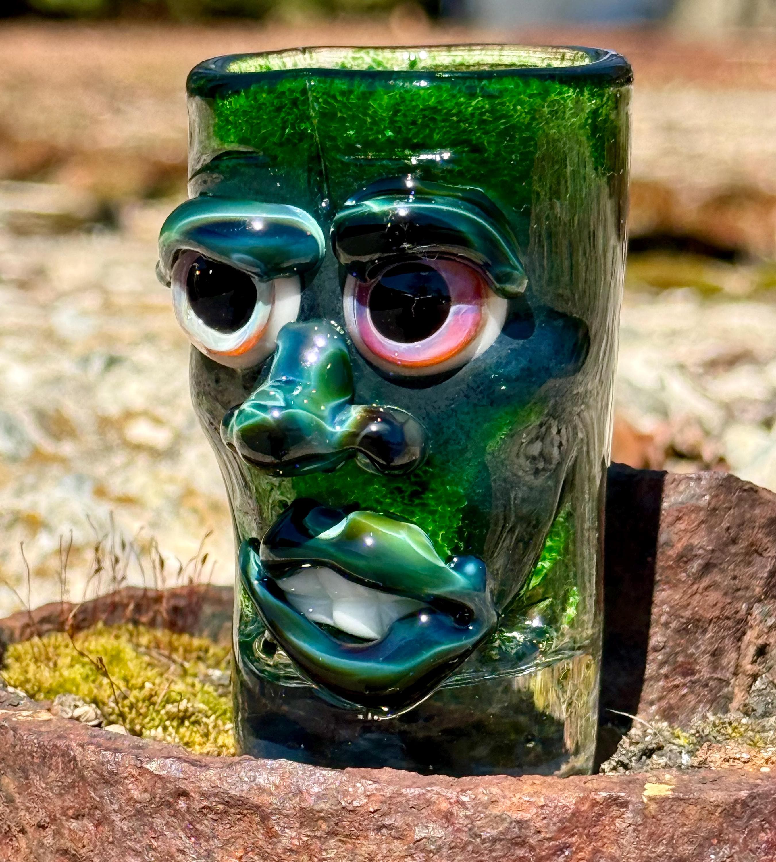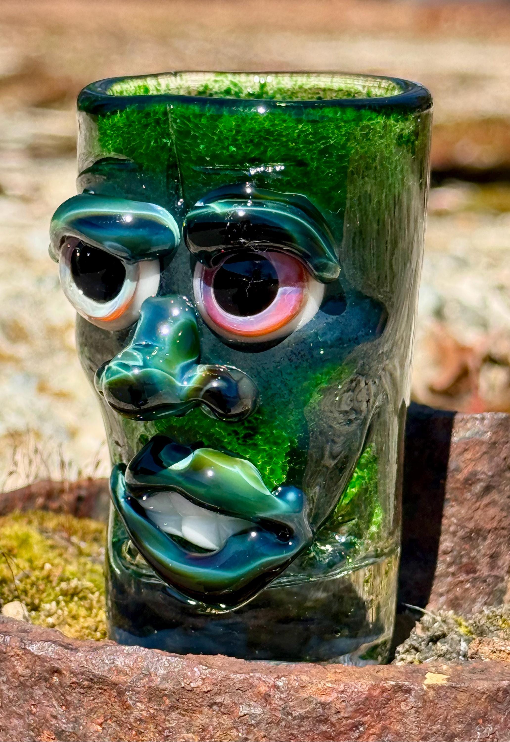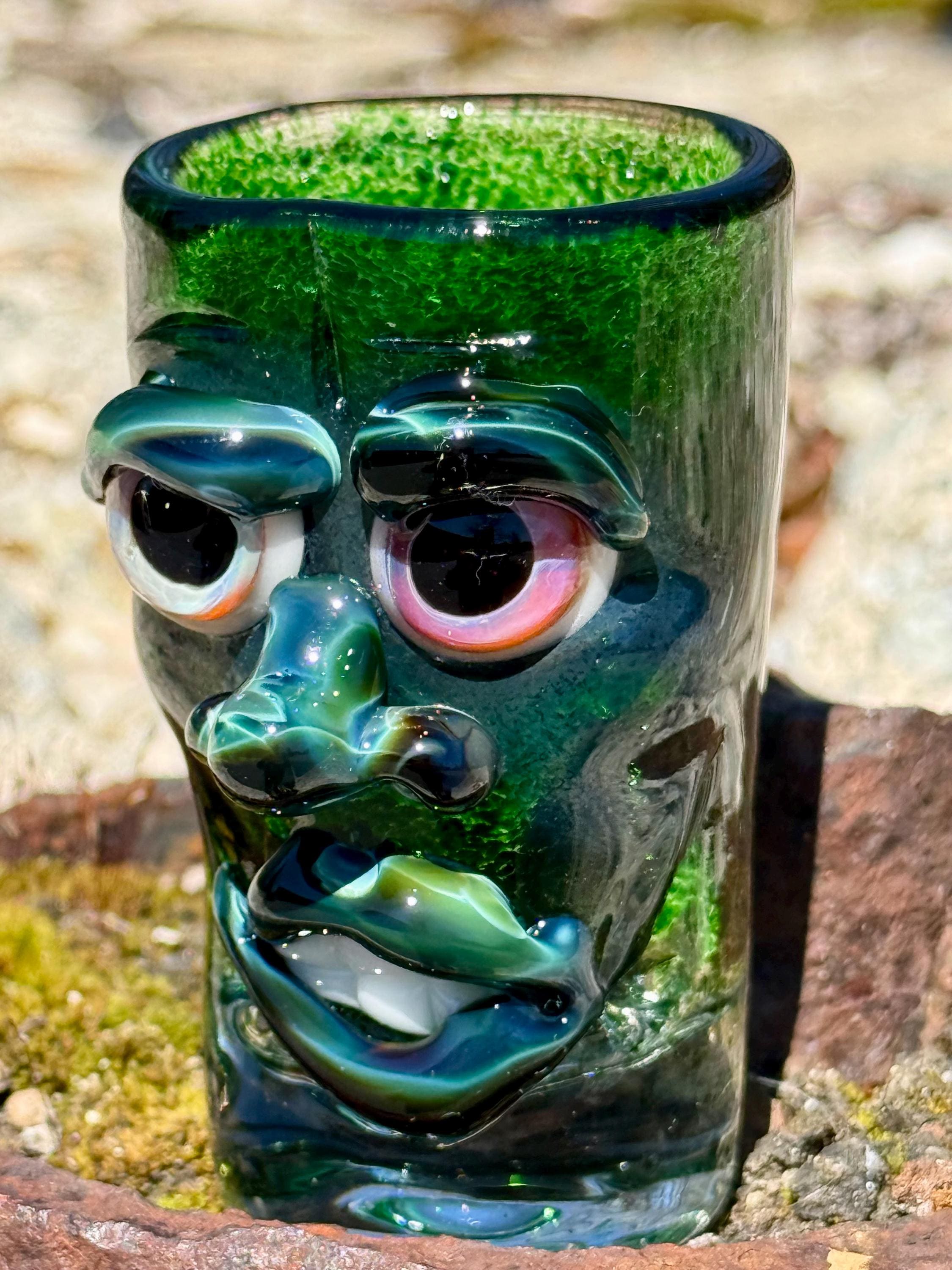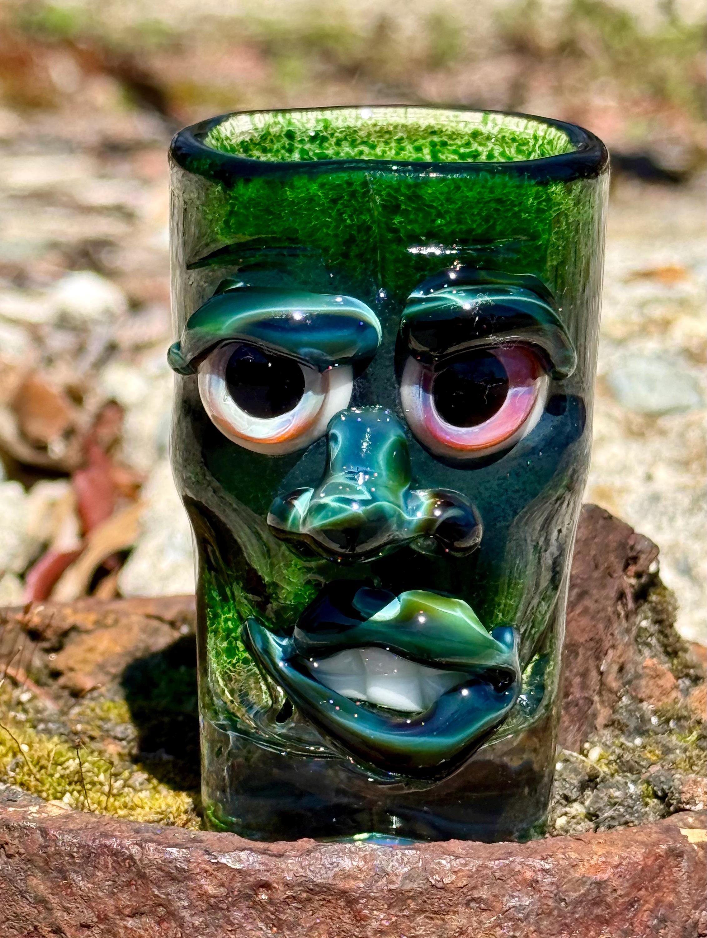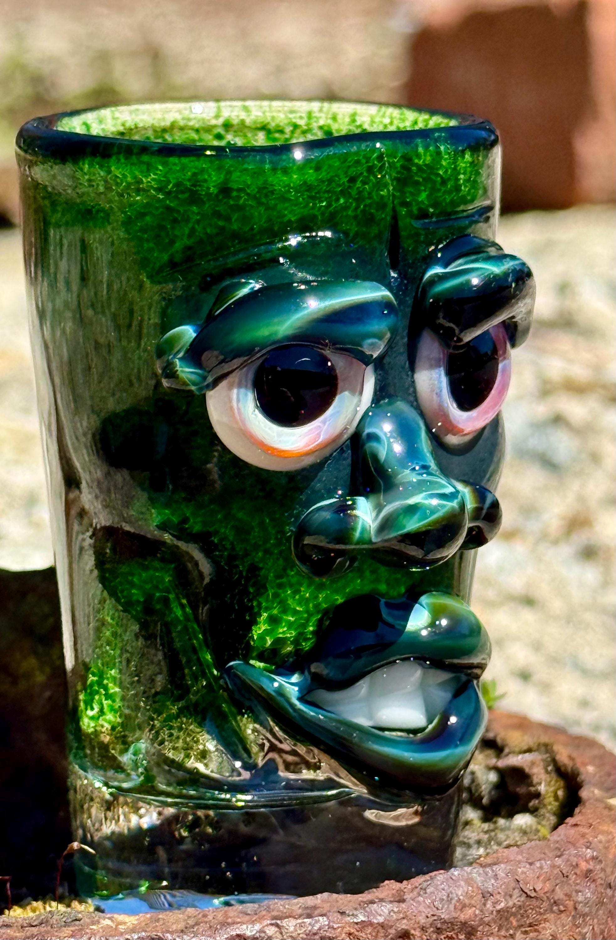2.8 inch tall and 1.6 inch wide borosilicate glass shot glass. Experimental Green Frit base color with Xenomorph face
