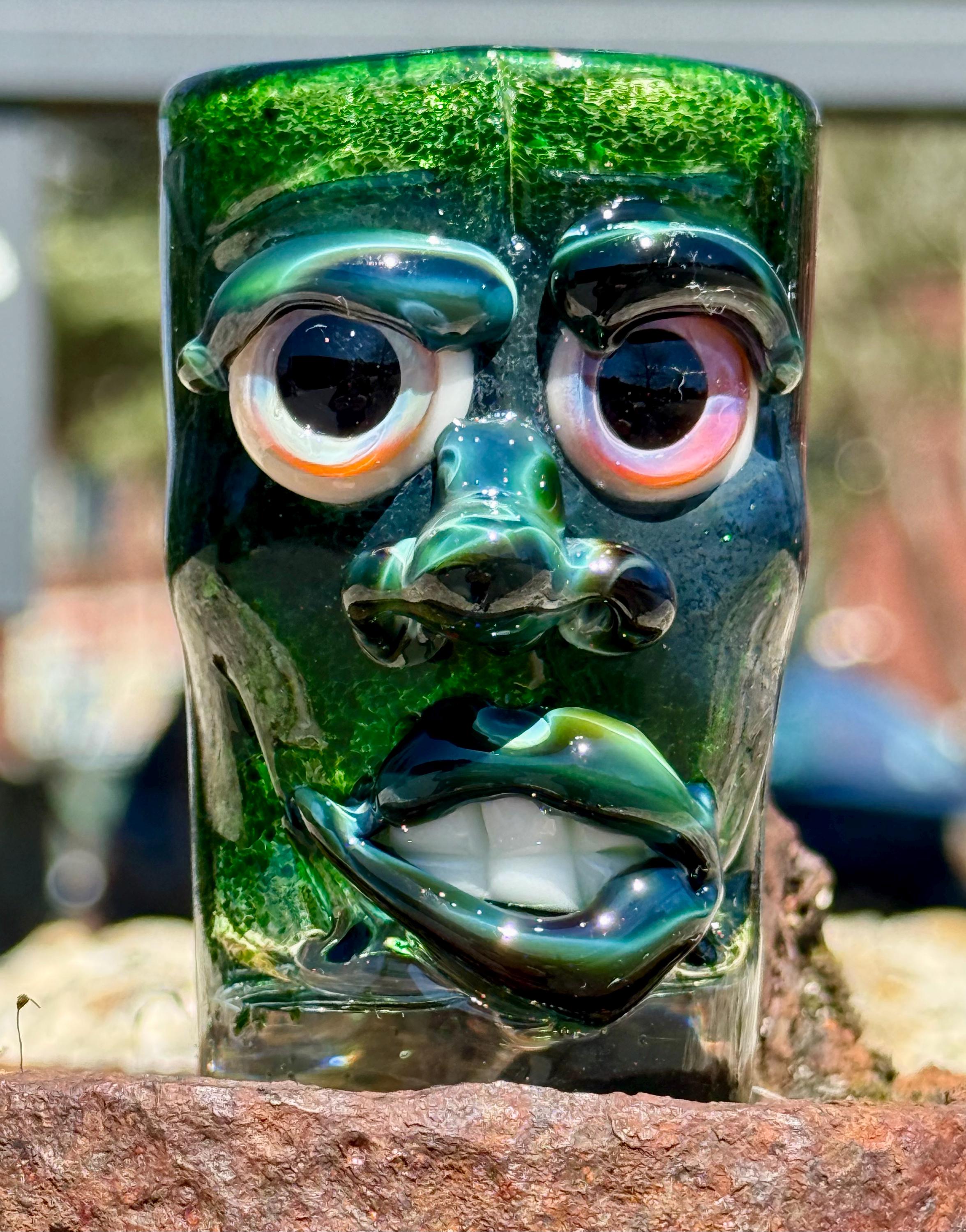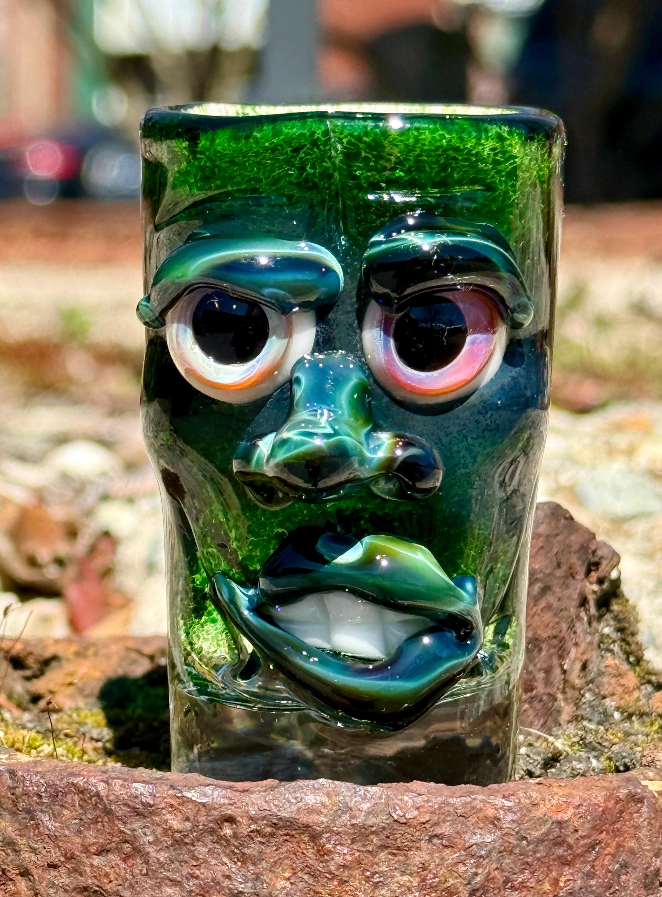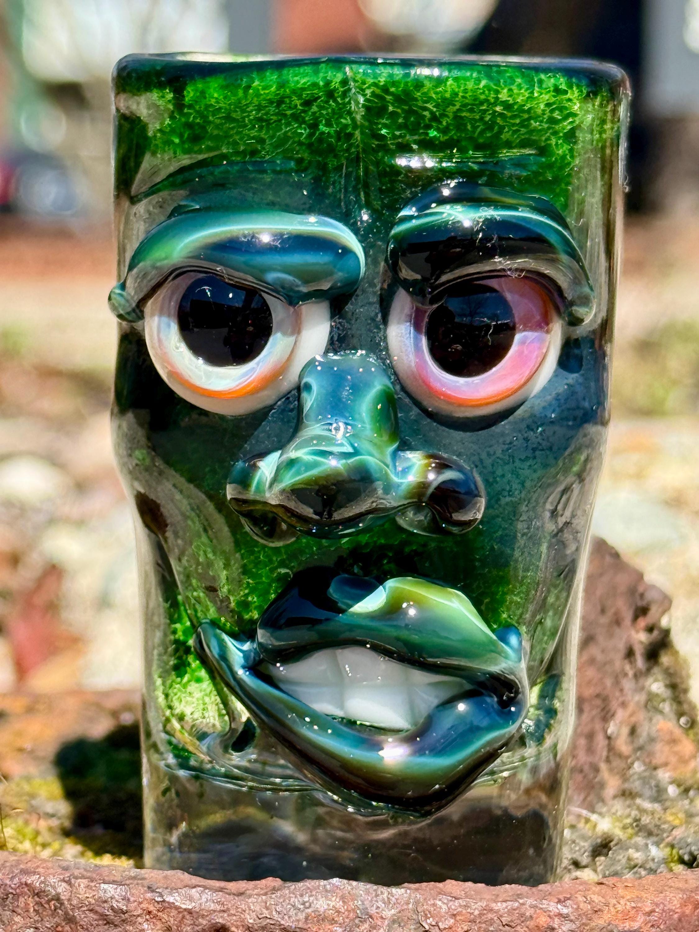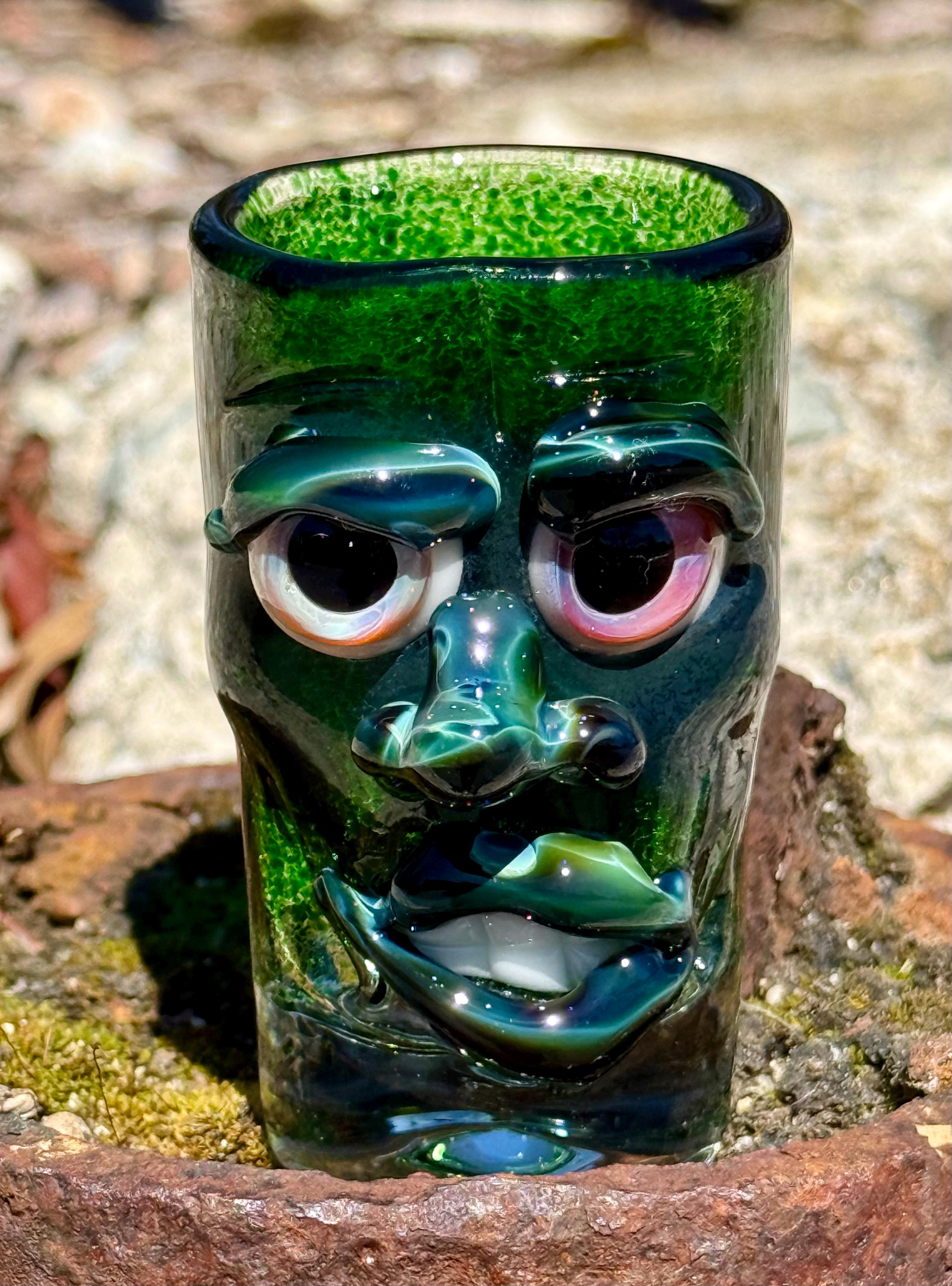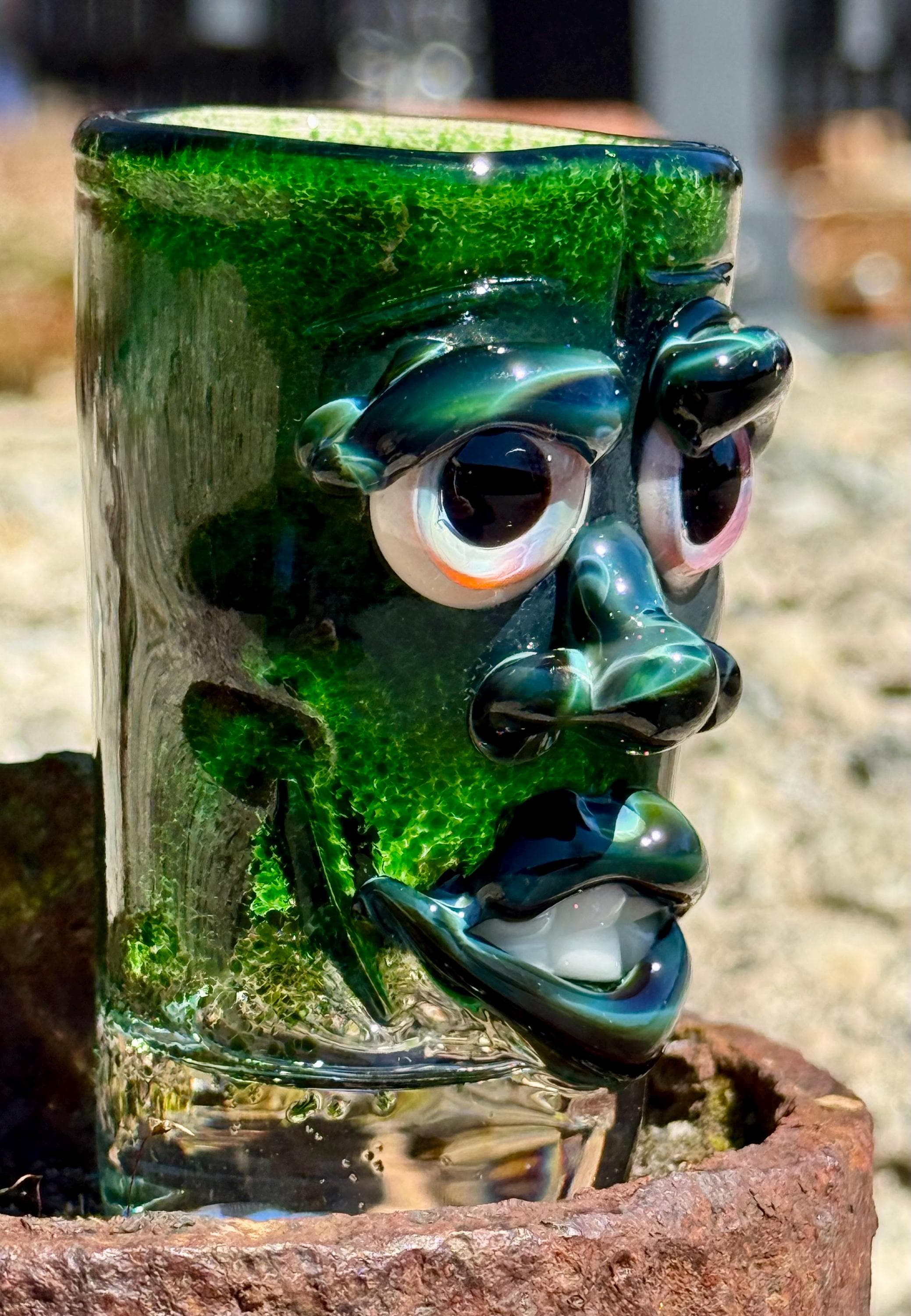 2.8 inch tall and 1.6 inch wide borosilicate glass shot glass. Experimental Green Frit base color with Xenomorph face
